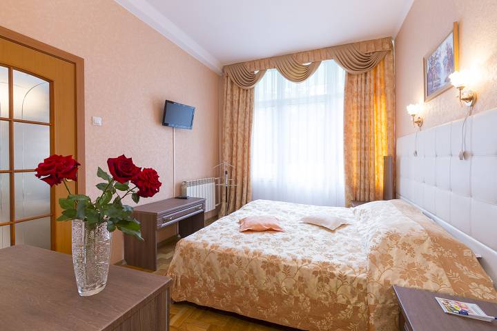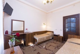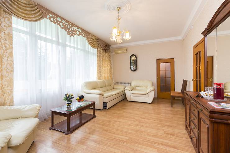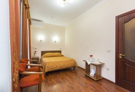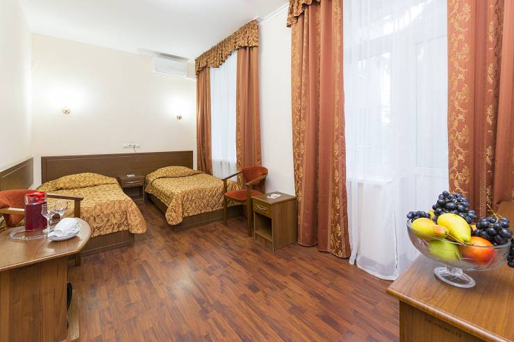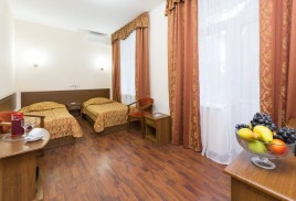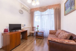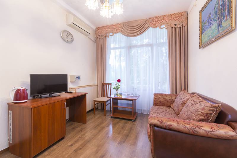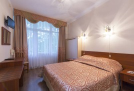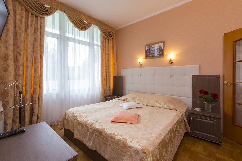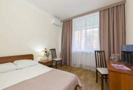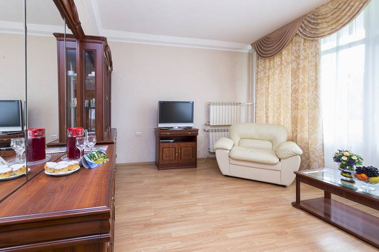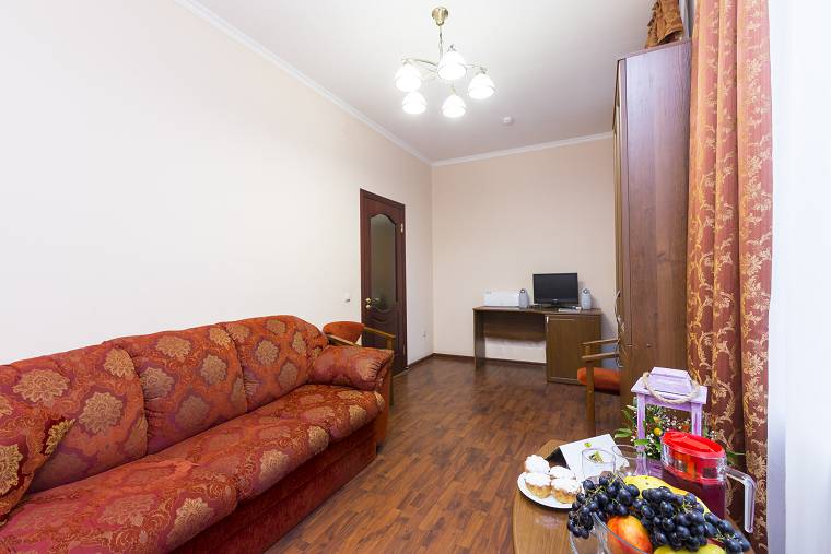 - 2-местный 2-комнатный 1-категории. Площадь 27 кв.м. В номере: гостиная с мягкой мебелью, спальня (двуспальная кровать или две односпальные кровать), телевизор (спутниковые каналы), холодильник, санузел с душевой кабиной, фен, халат, тапочки. Дополнительное место диван.