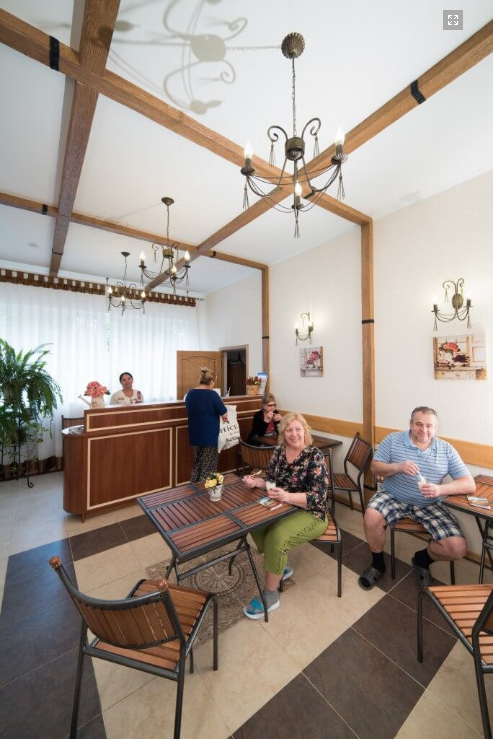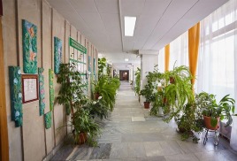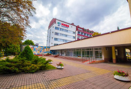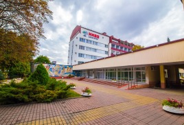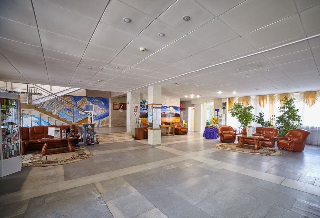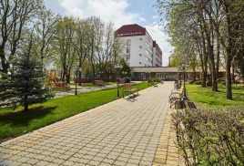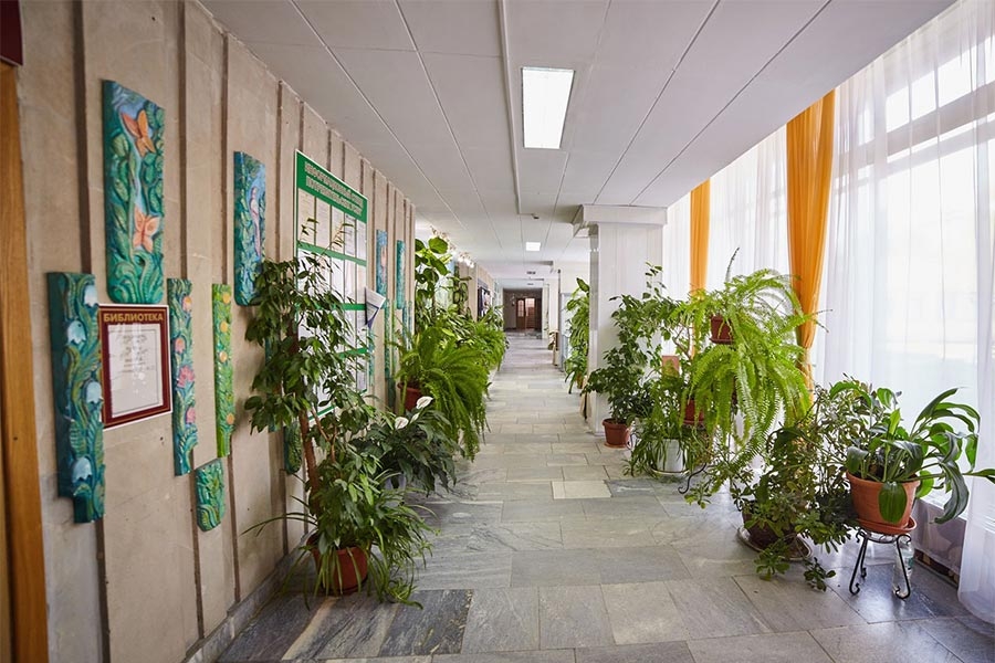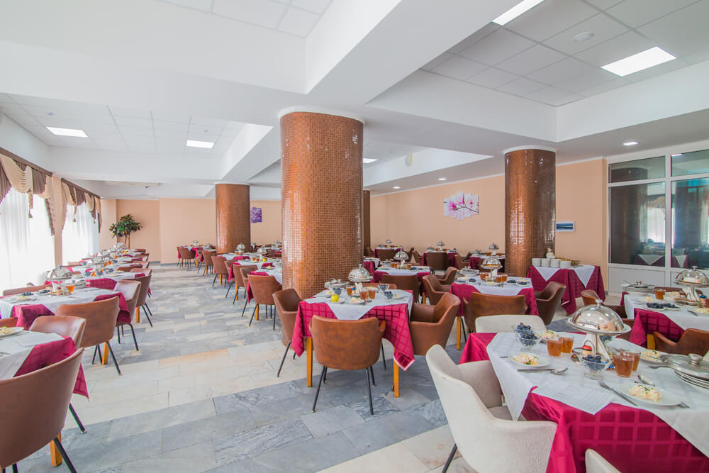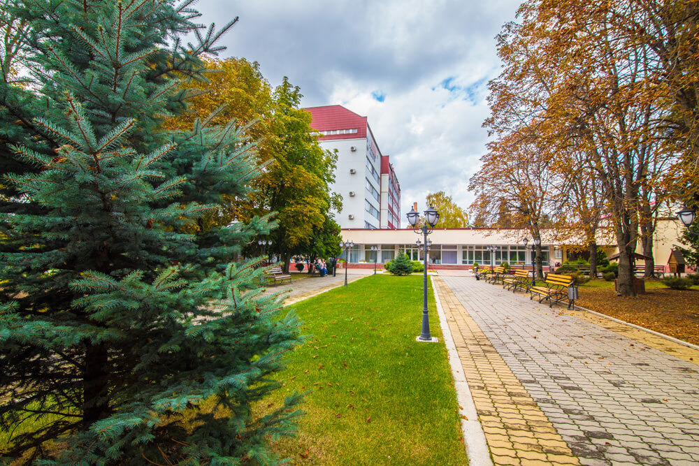 Размещение: один 5-ти этажный спальный корпус с лифтом, соединен теплым переходом с бассейном. На первом этаже корпуса расположены лечебные кабинеты и столовая.