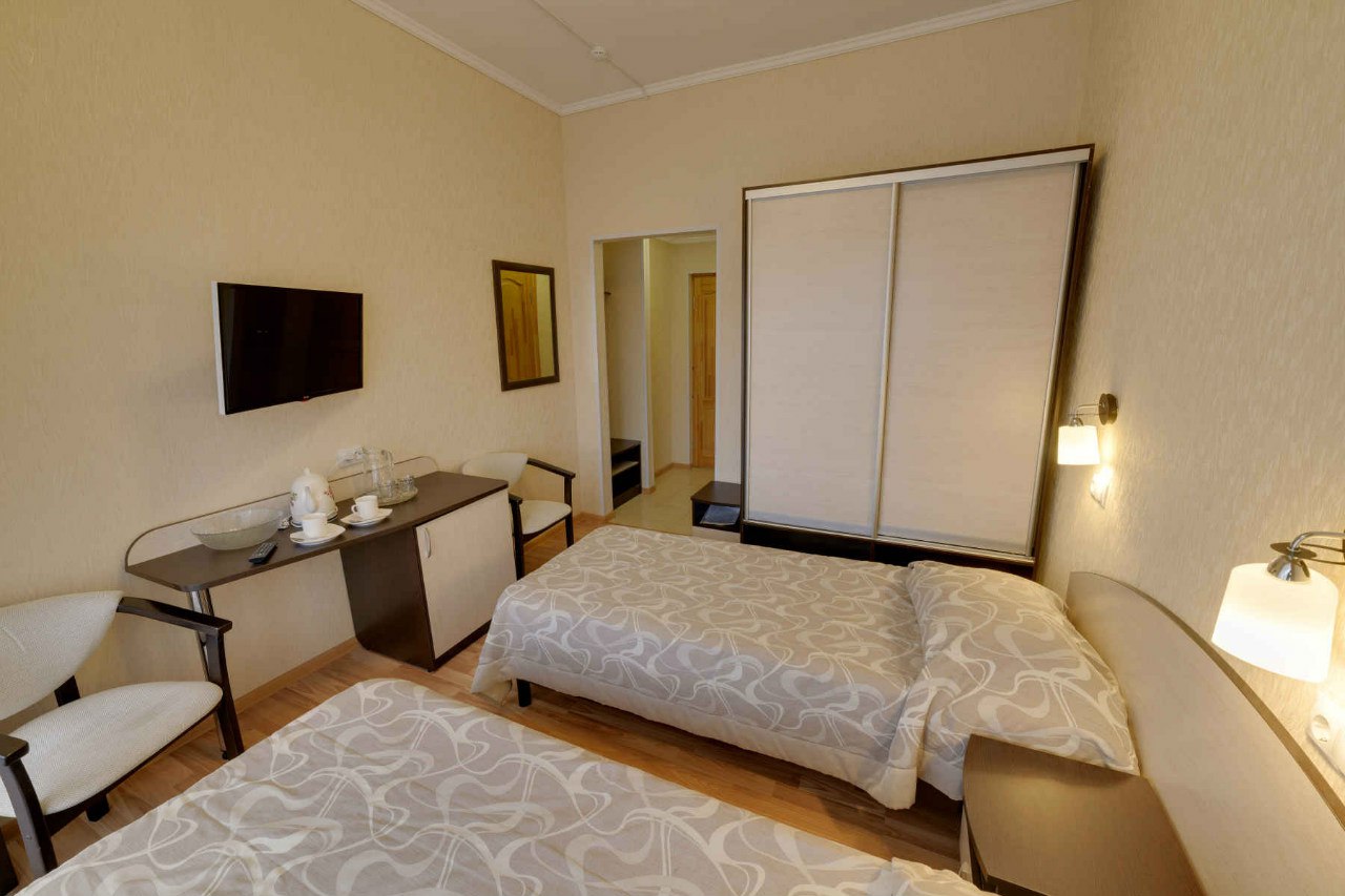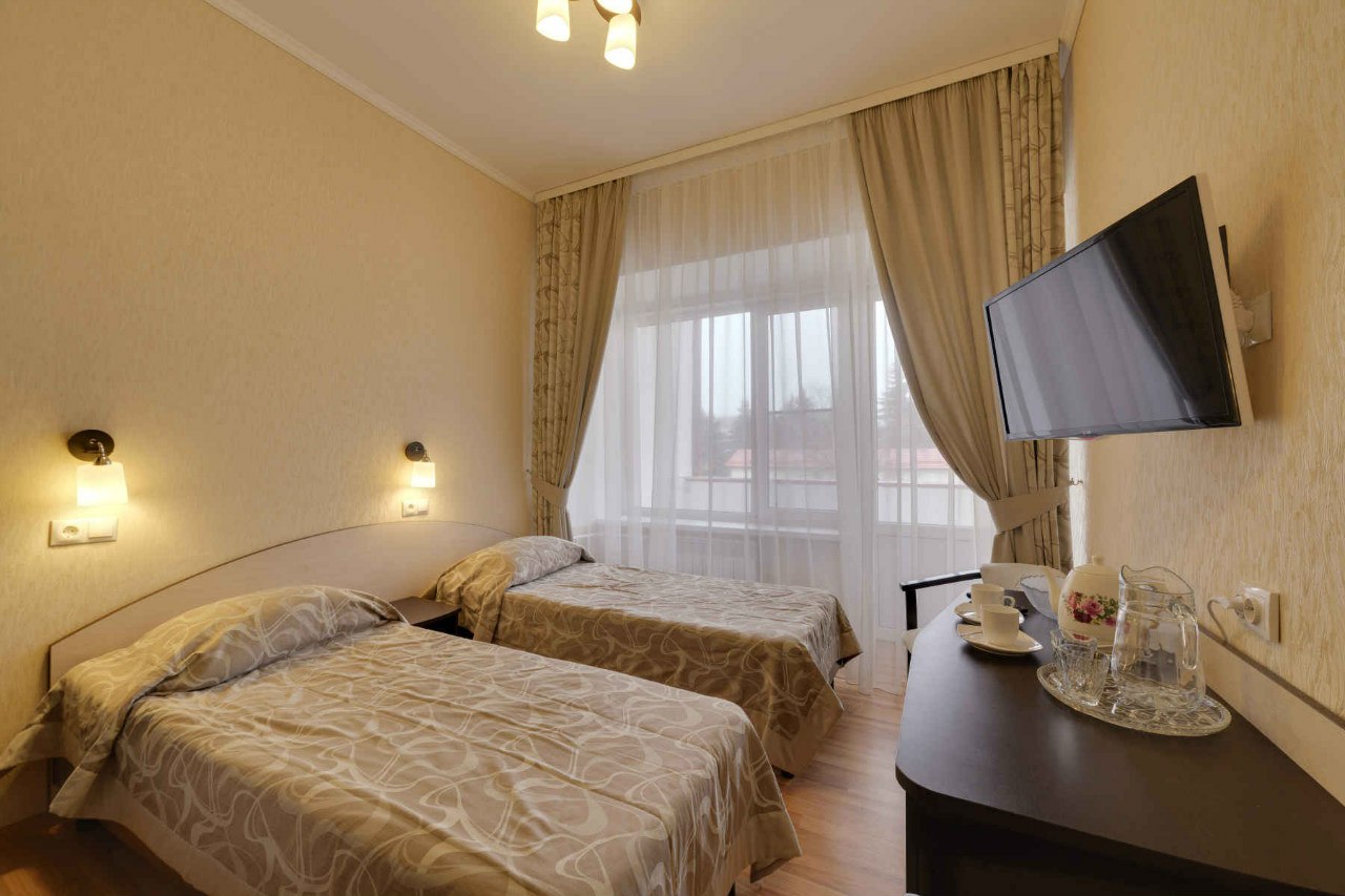 - 2-местный номер стандарт (ремонт 2013-2014 г). Площадь номера – 14 кв.м. В номере: 2 раздельные кровати, ЖК телевизор, холодильник, чайник, фен, совмещенный санузел с душевой кабиной, металлопластиковые окна, ламинированное покрытие пола. Часть номеров с балконом.