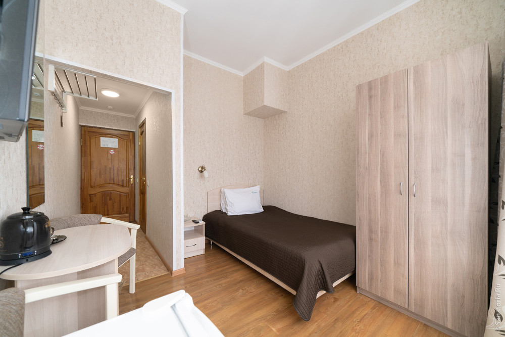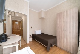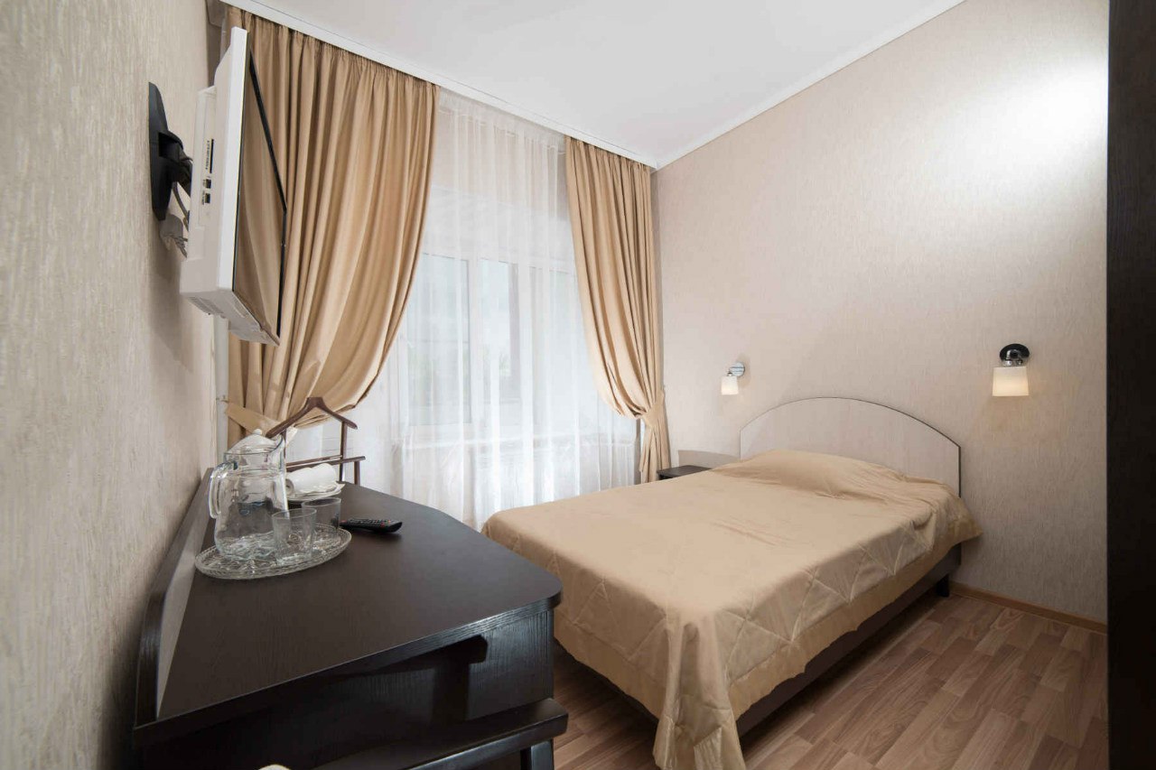 - 1-местный номер стандарт (ремонт 2013-2014 г). Площадь номера - 14 кв.м. В номере: полутороспальная кровать, система кондиционирования воздуха, телевизор, холодильник, чайник, набор посуды, совмещенный санузел с поддоном или душевой кабиной. Часть номеров с балконом.