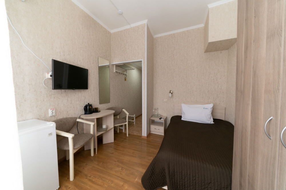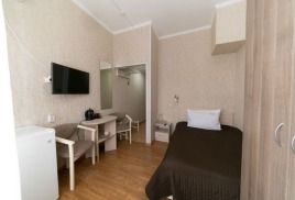 - 1-местный номер 1-категории. Площадь номера - 14 кв.м. В номере: кровать, телевизор, холодильник, чайник, набор посуды, совмещенный санузел с поддоном или ванной.