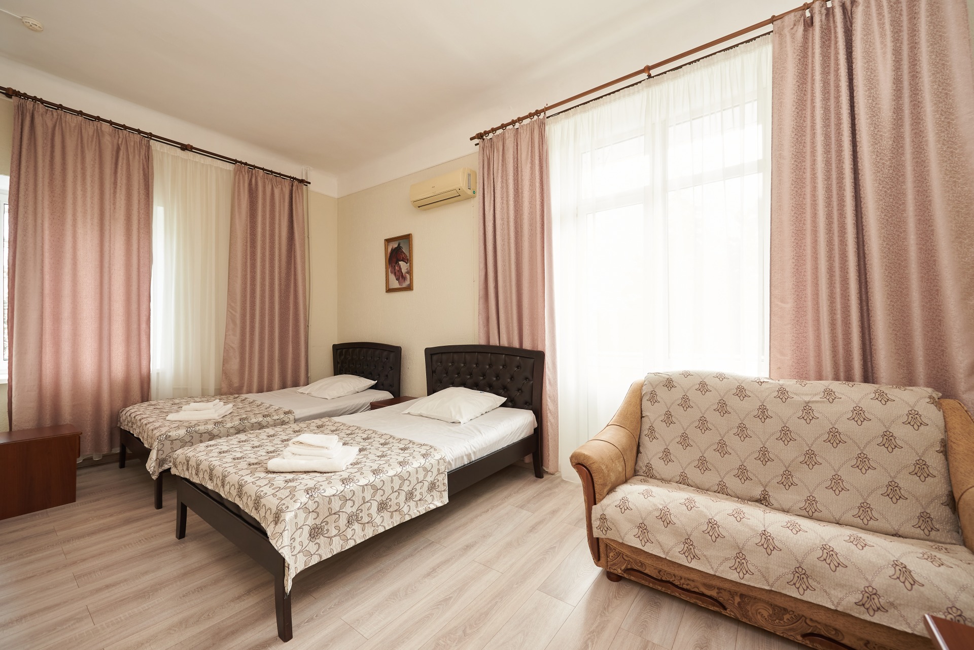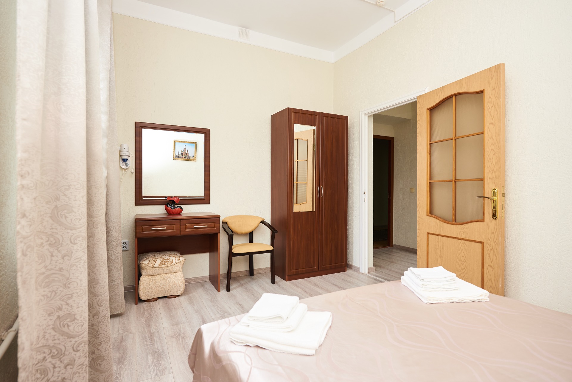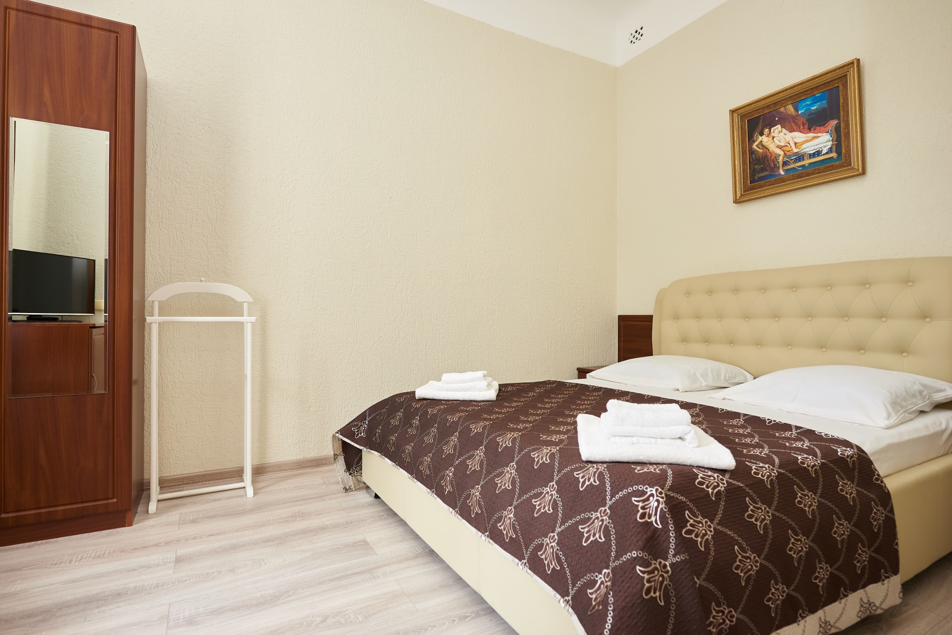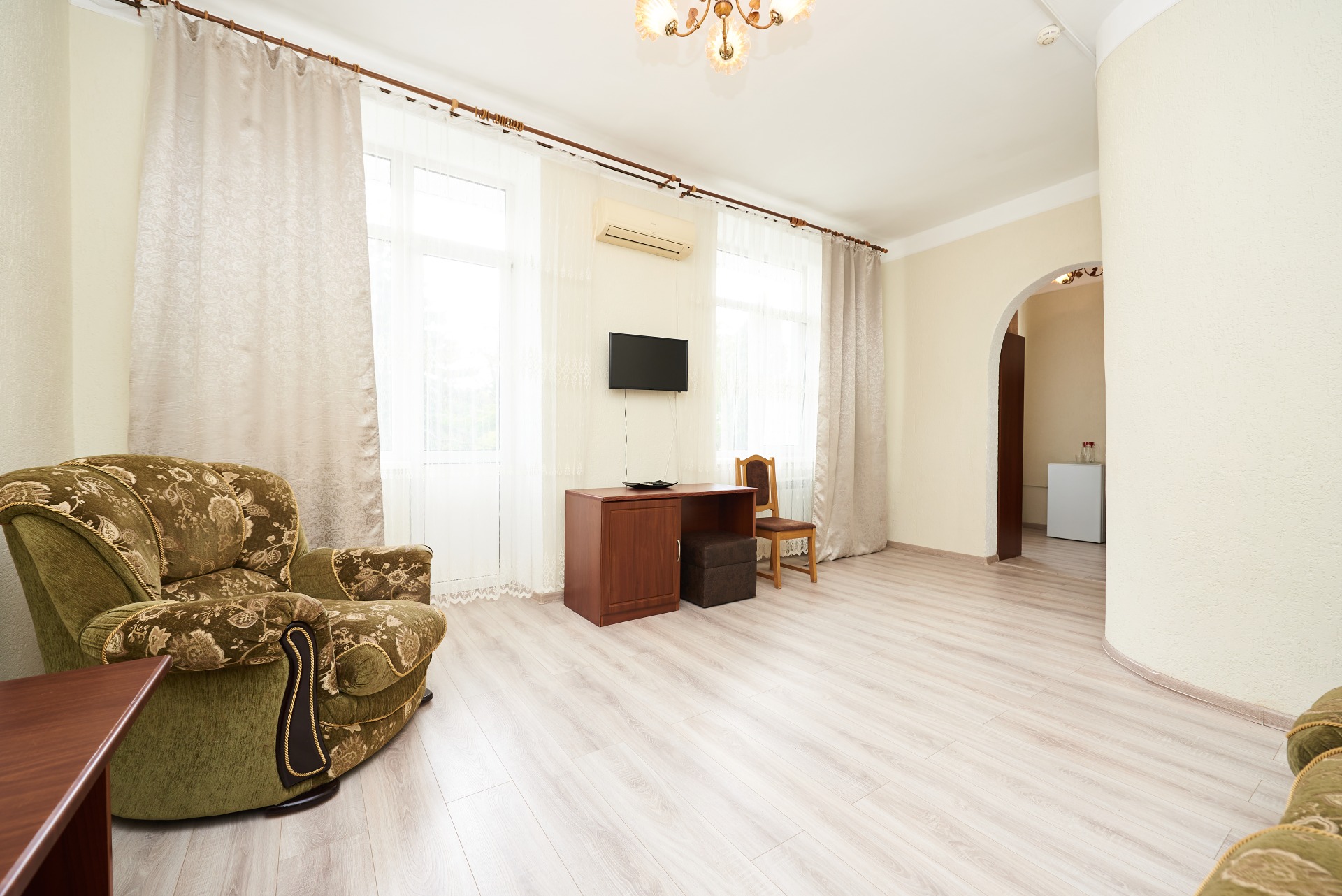 - 2-местный 2-комнатный Улучшенный. В номере: спальня с двуспальной кроватью, гостиная с мягкой мебелью, телевизор, холодильник, санузел с ванной или душем, кондиционер. Балконы не во всех номерах.