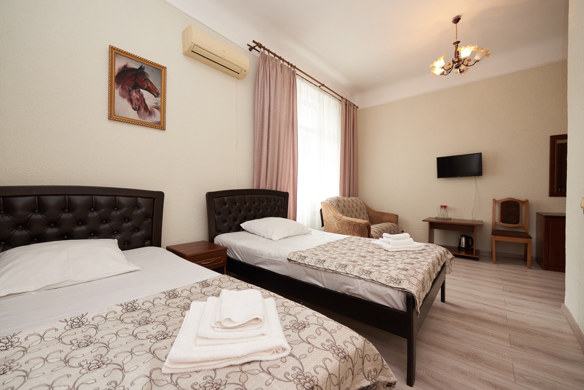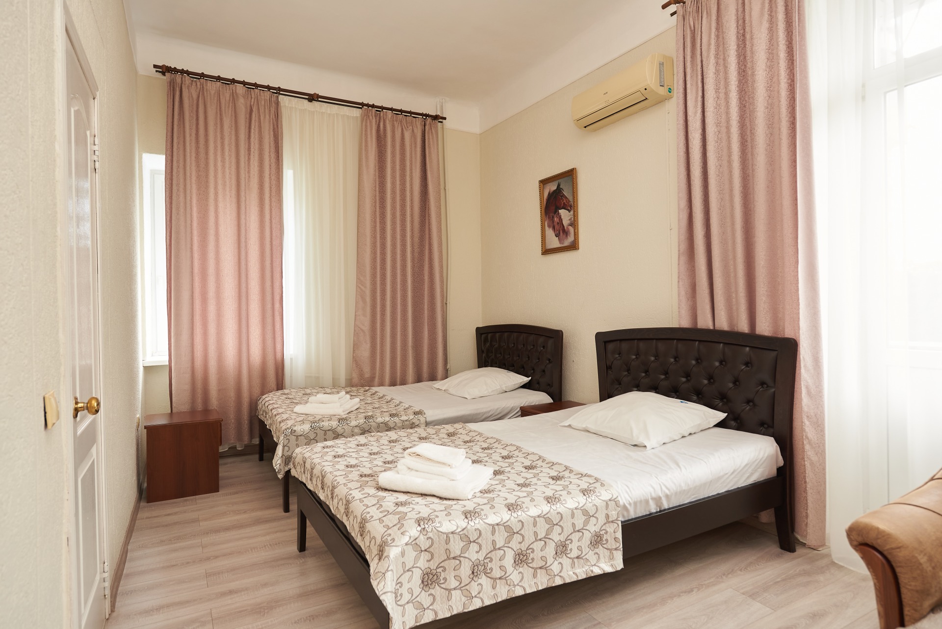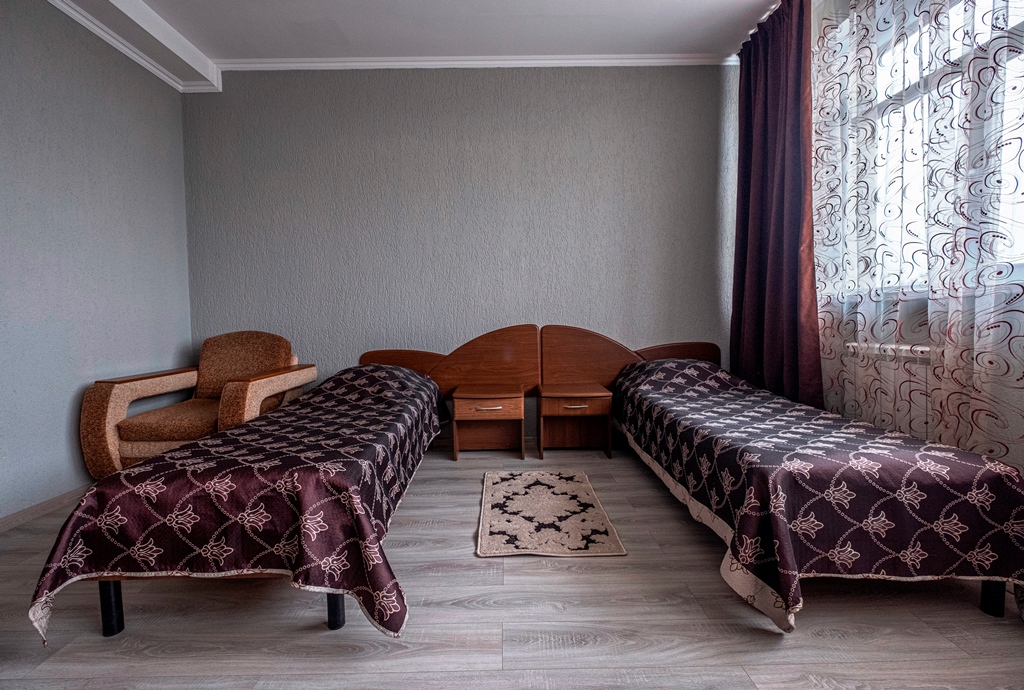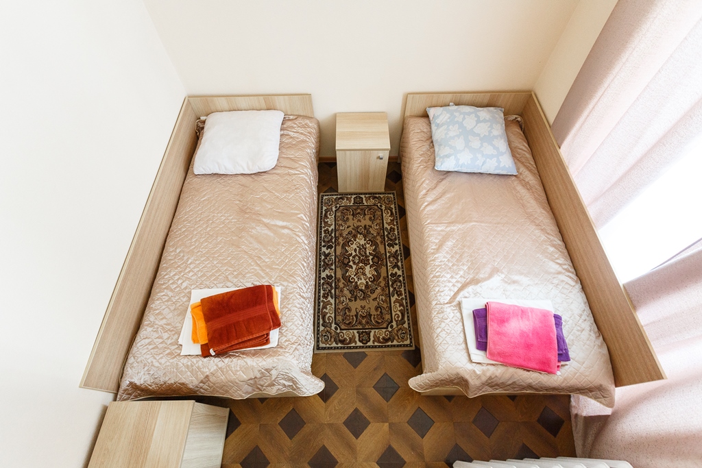 - 2-местный 1-комнатный Стандарт. В номере: две односпальные кровати, телевизор, холодильник, санузел с душем. Балконы не во всех номерах.