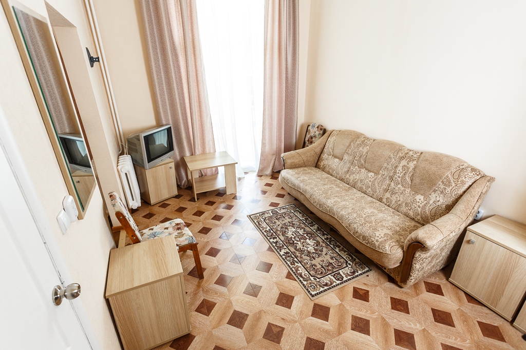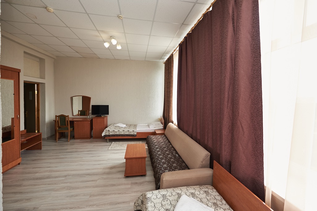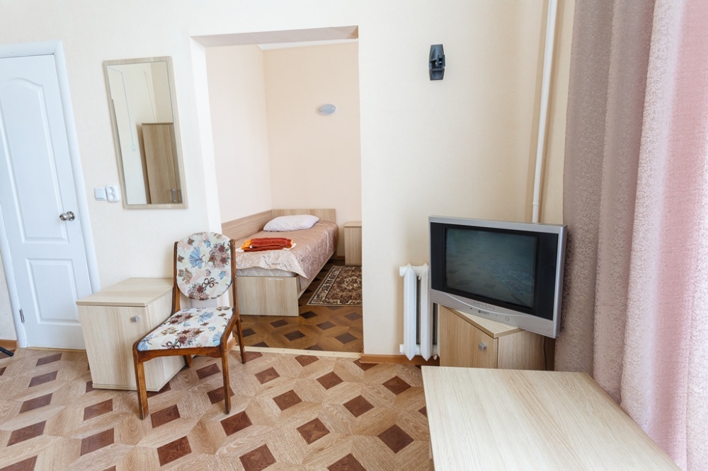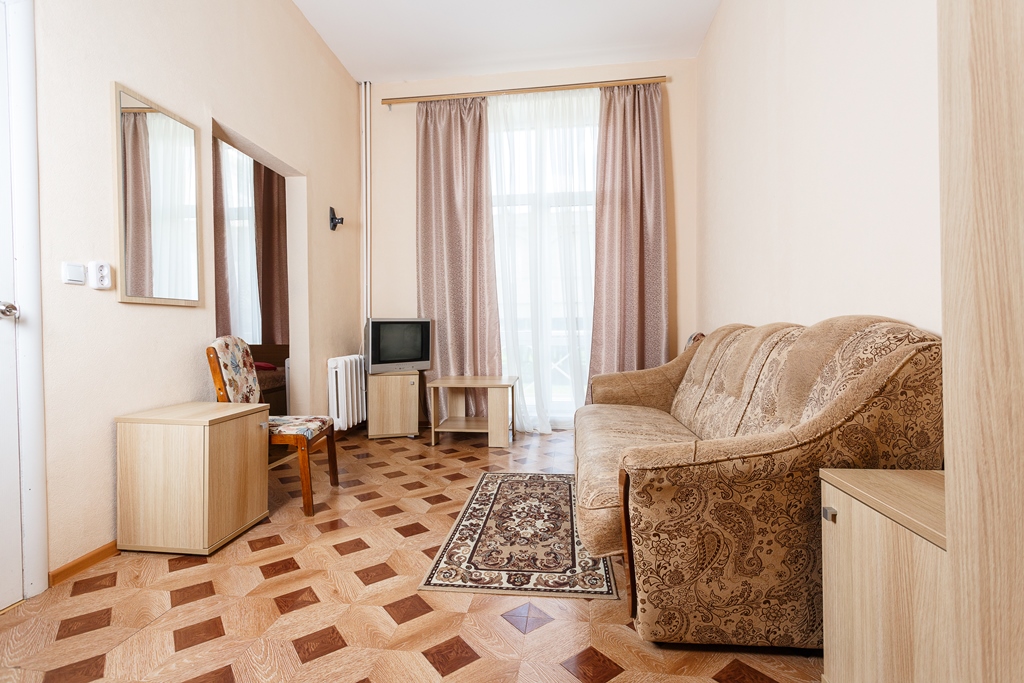 - 2-местный 2-комнатный Стандарт. В номере: спальня - две односпальные кровати, гостиная с мягкой мебелью, телевизор, холодильник, санузел с душем. Балконы не во всех номерах.