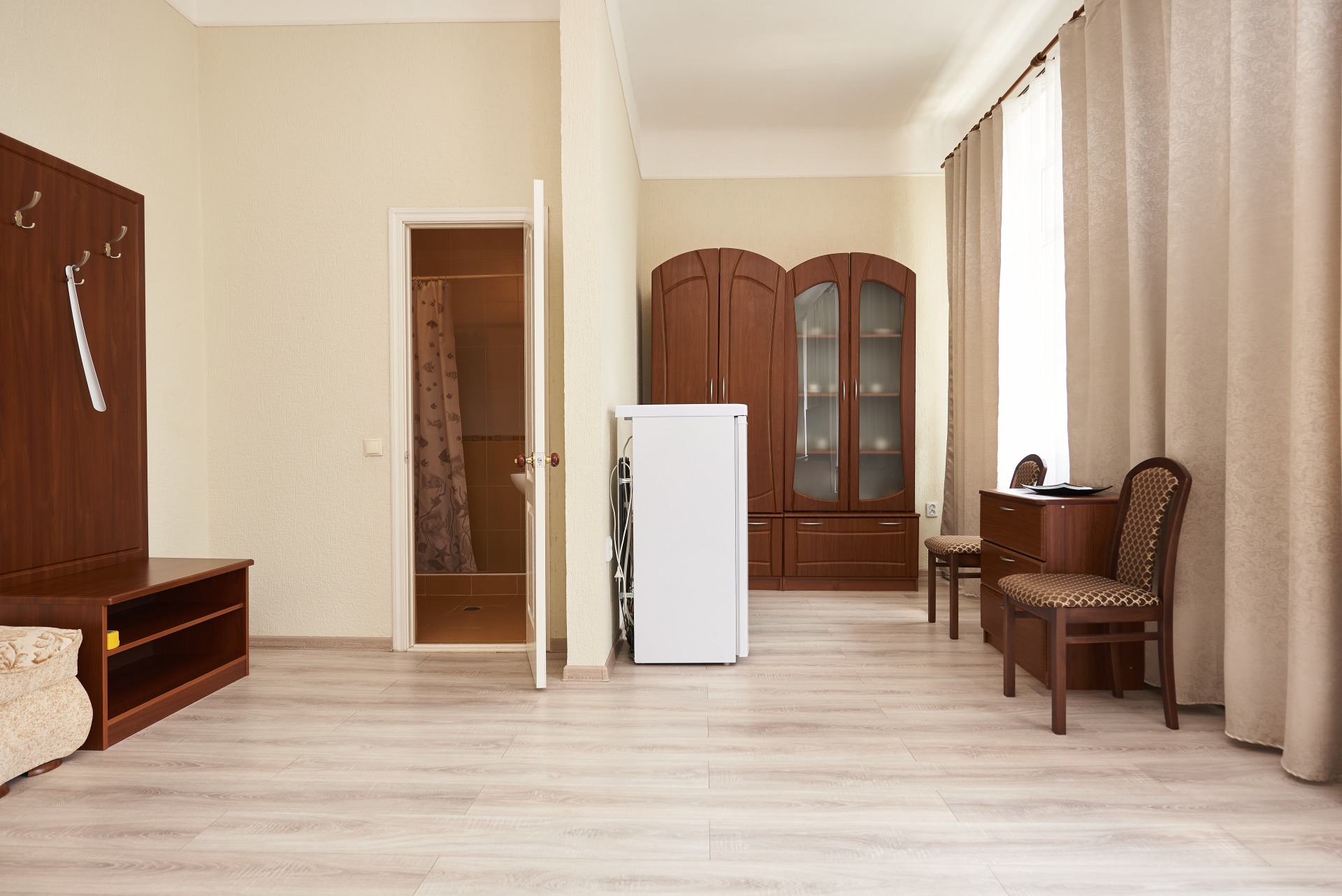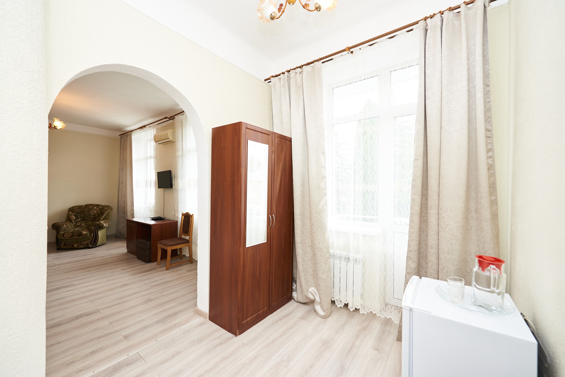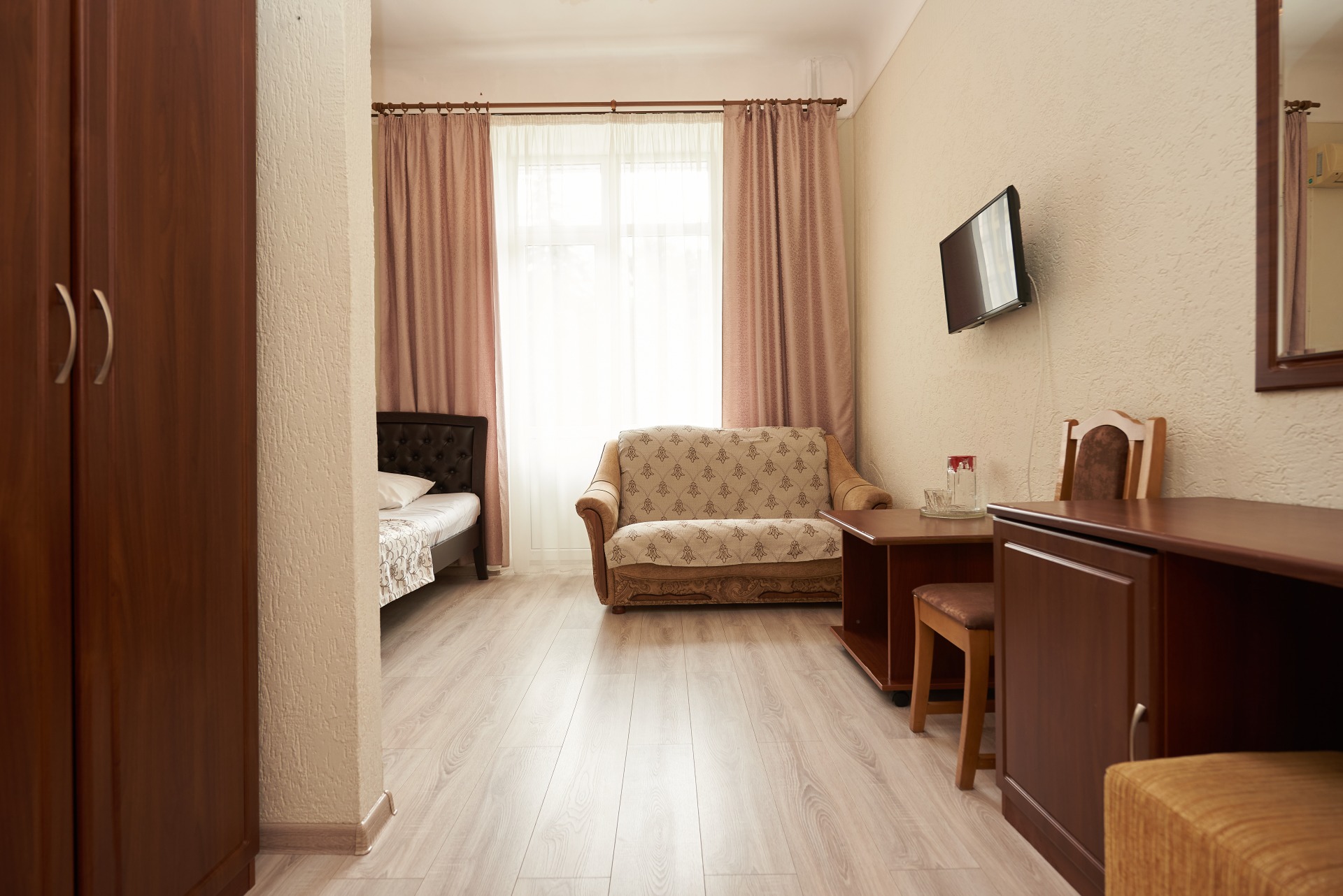 - 2-местный 2-комнатный Стандарт. В номере: спальня - две односпальные кровати, гостиная с мягкой мебелью, телевизор, холодильник, санузел с душем. Балконы не во всех номерах.