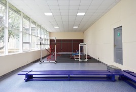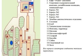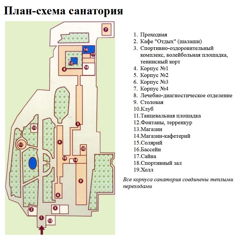 Размещение: 3 спальных корпуса с лифтами: 1-й корпус - 5-ти этажный, 2-ой корпус - 4-х этажный, 3-ий корпус - 3-х этажный. Все корпуса соединены теплыми переходами со столовой и лечебным корпусами.