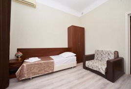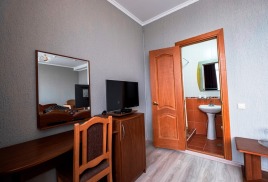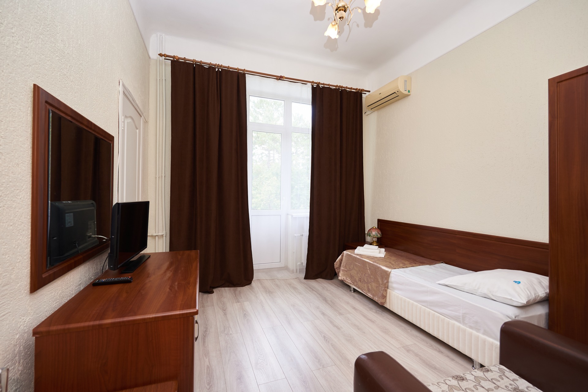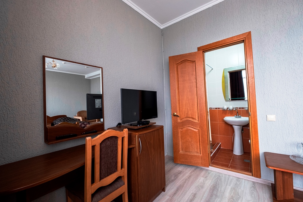 - 1-местный 1-комнатный 1-категории. В номере: односпальная кровать, телевизор, холодильник, санузел с душем, кондиционер. Балконы не во всех номерах.