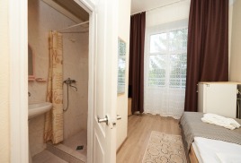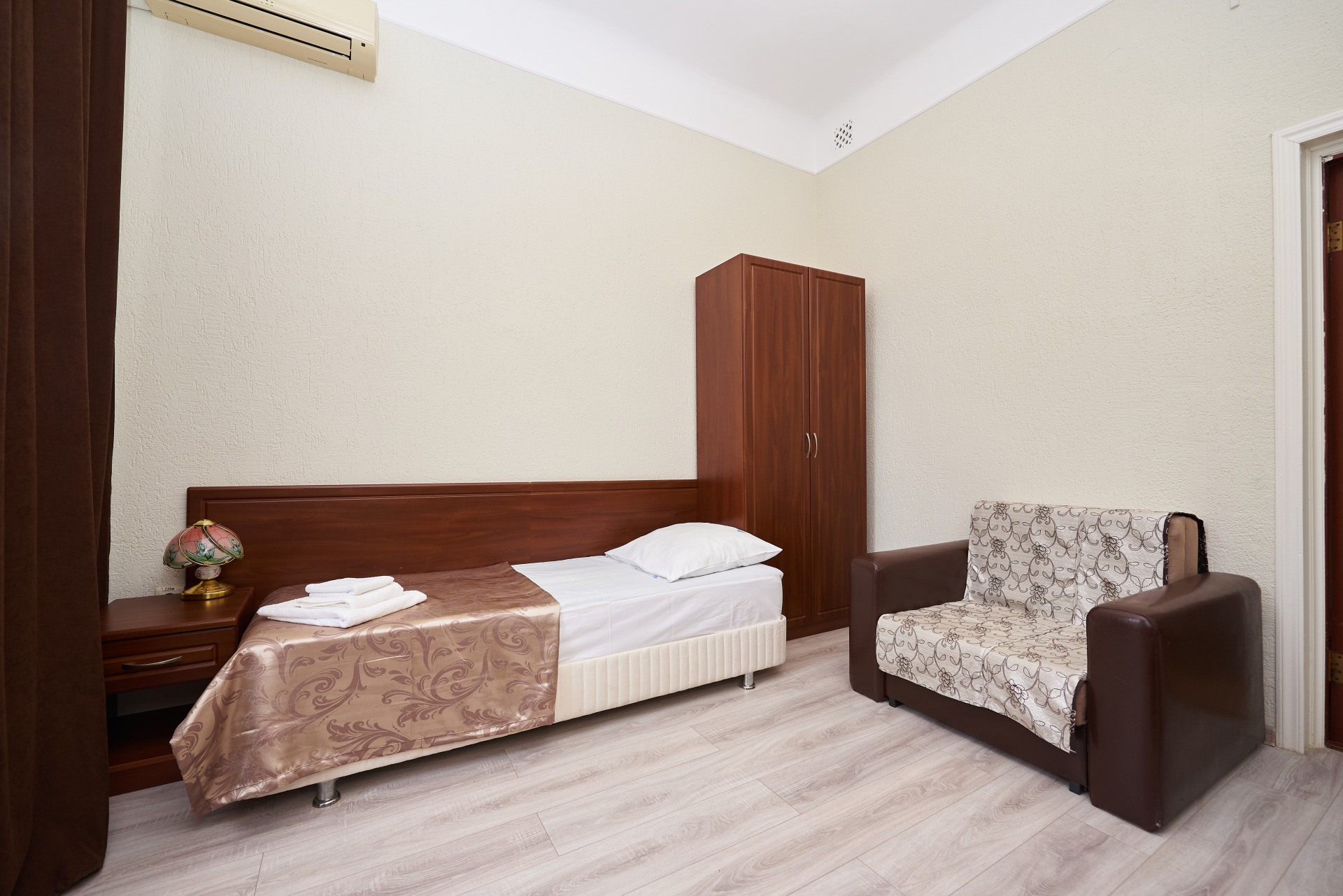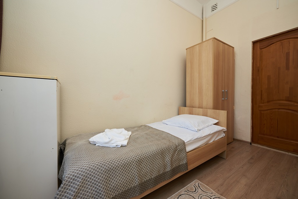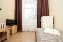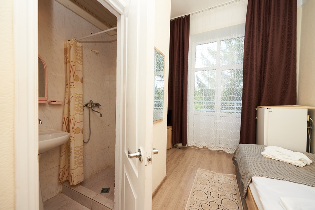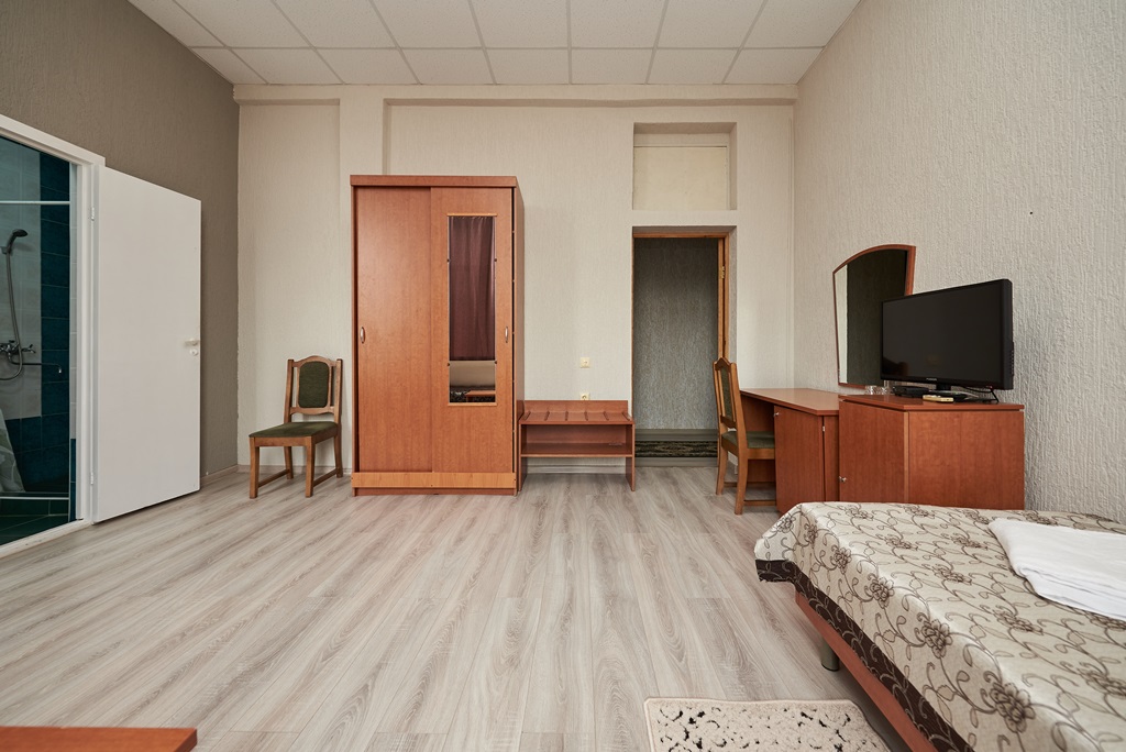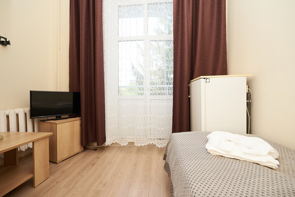 - 1-местный 1-комнатный Стандарт. В номере: односпальная кровать, телевизор, холодильник, санузел с душем. Балконы не во всех номерах.