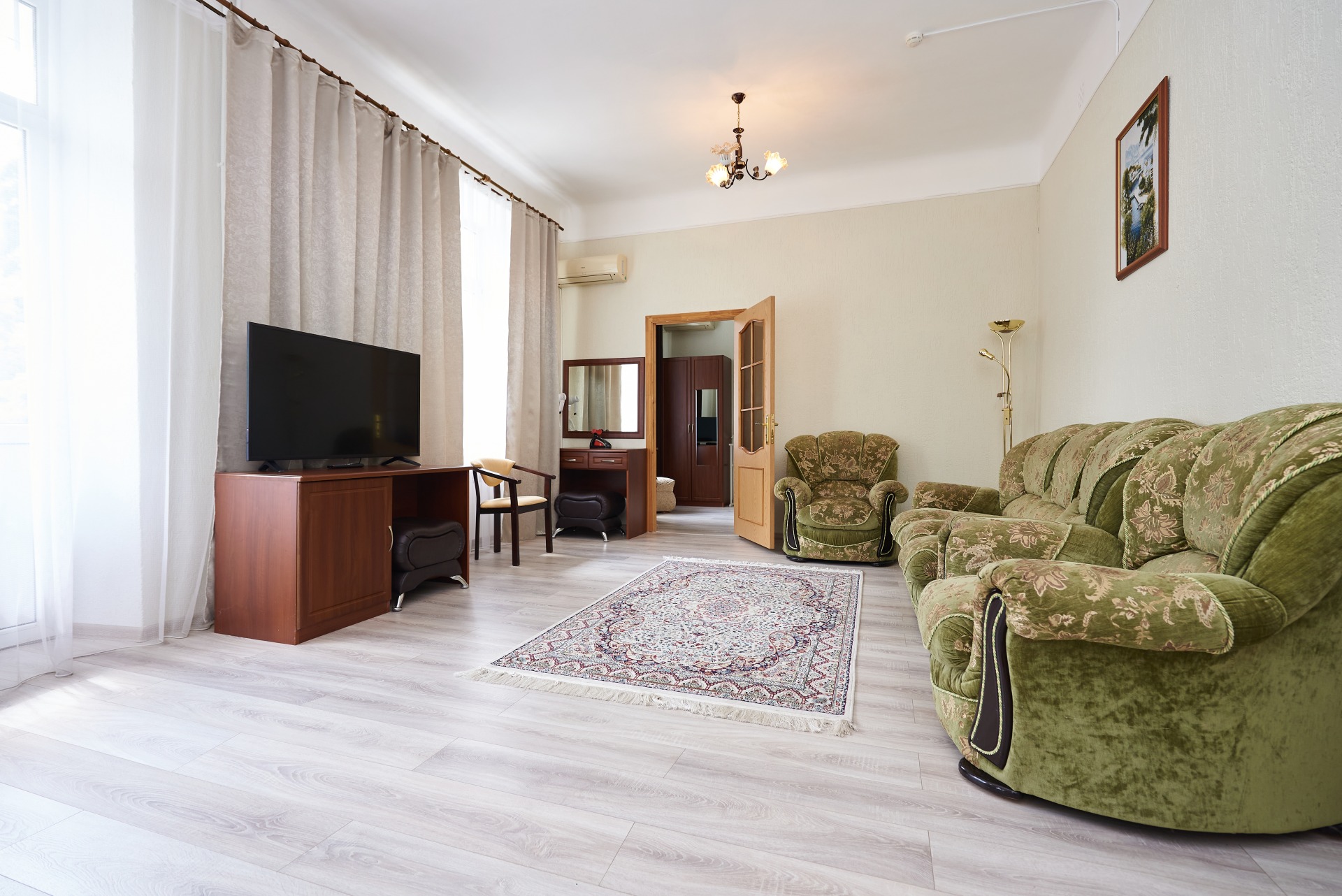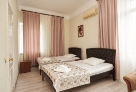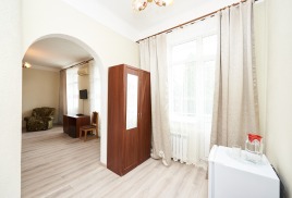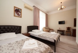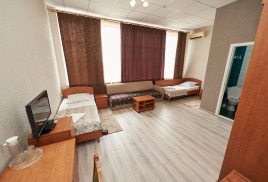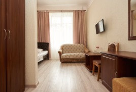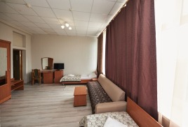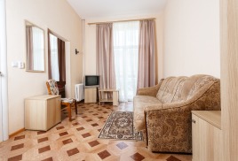 - 2-местный 2-комнатный Люкс. В номере: спальня с двуспальной кроватью, гостиная с мягкой мебелью, телевизор, холодильник, санузел с ванной, кондиционер. Балконы не во всех номерах.