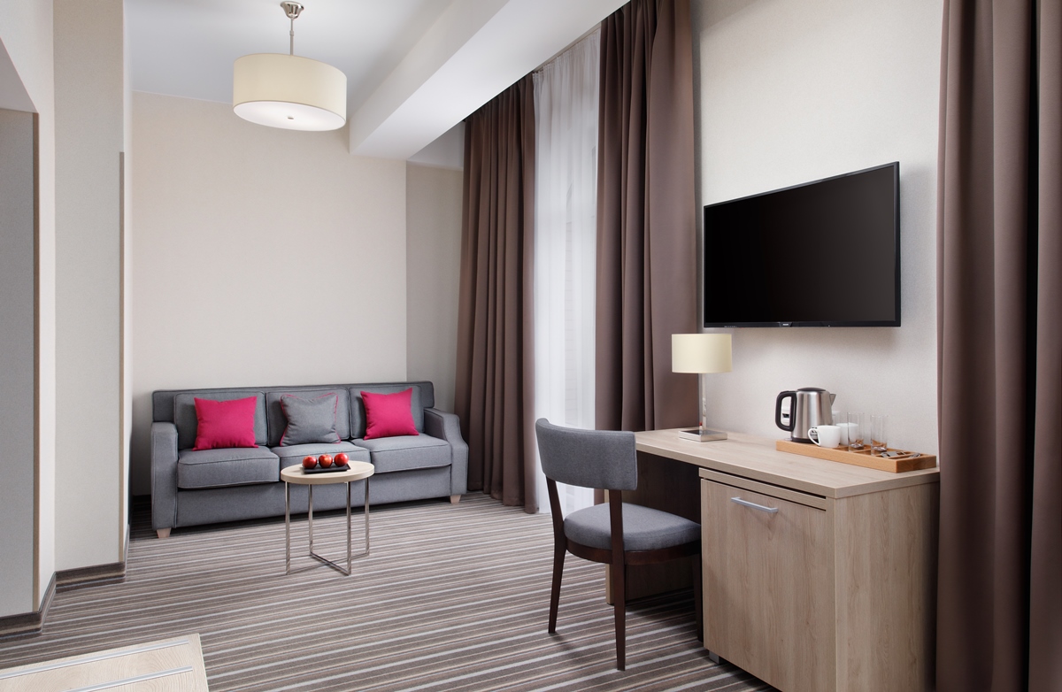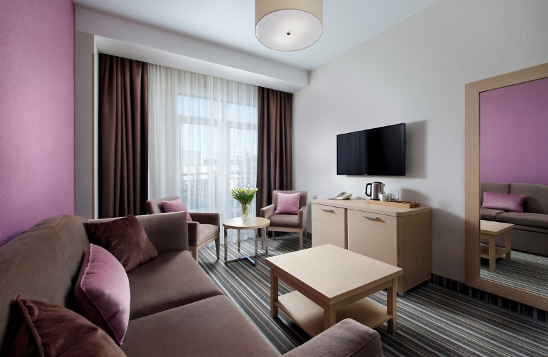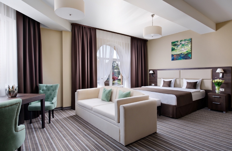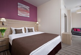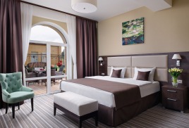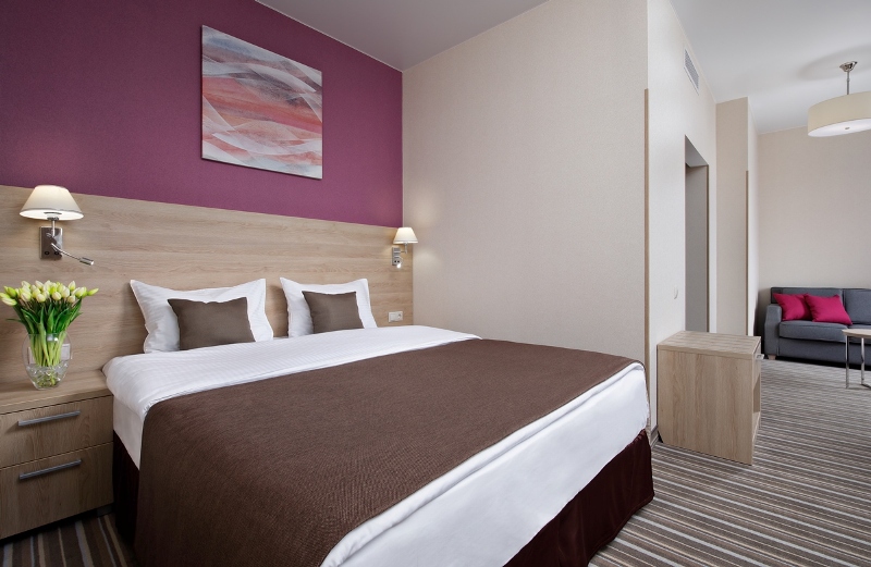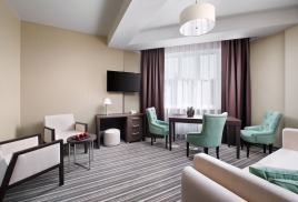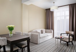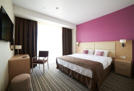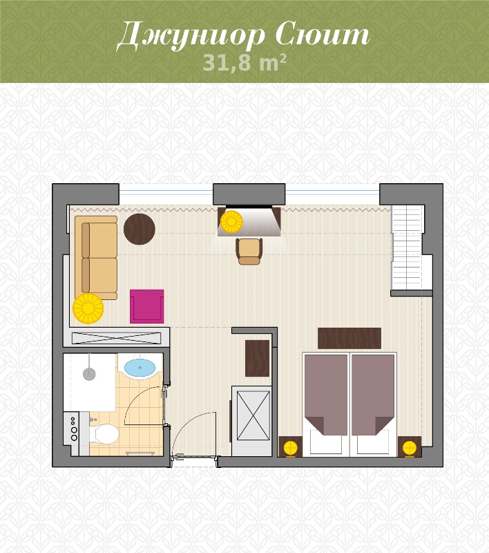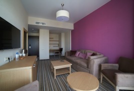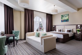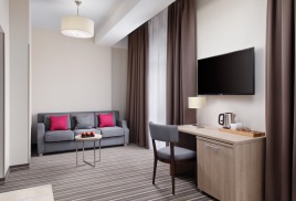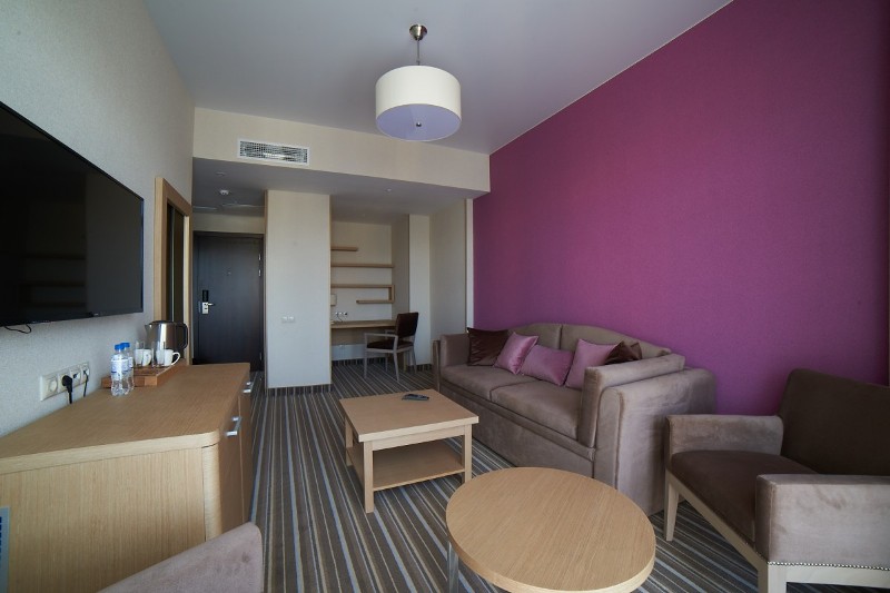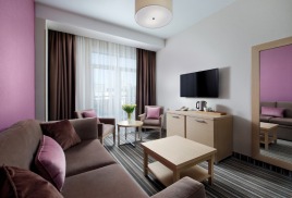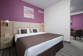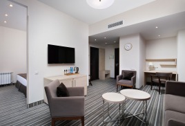 - 2-местный Джуниор Сюит. Площадь: 31,8 кв.м. В номере: сейф, телефон, ЖК телевизор, сплит-система, холодильник, 2 кровати 90х200, диван, балкон, Wi-Fi доступ в интернет.