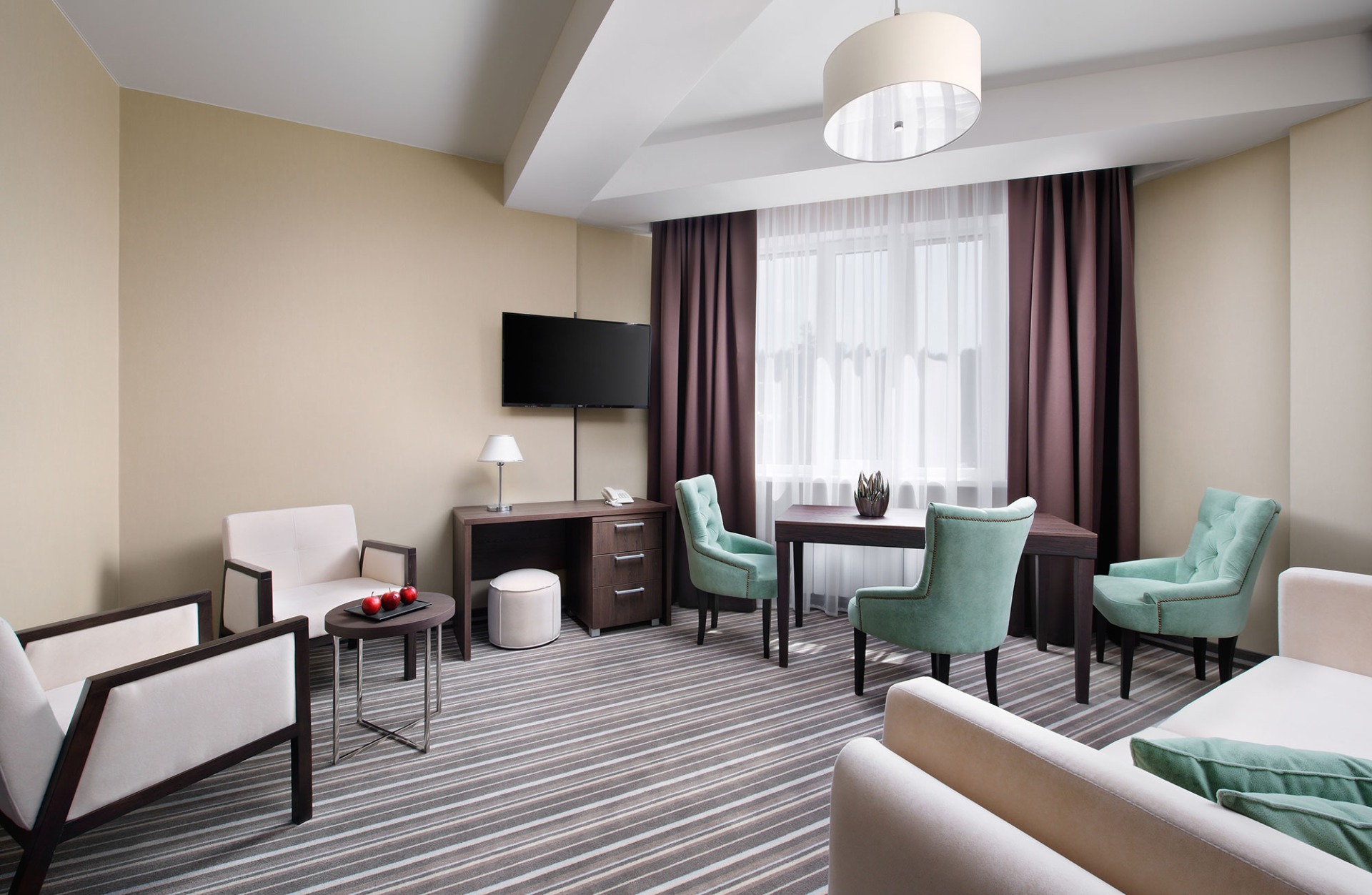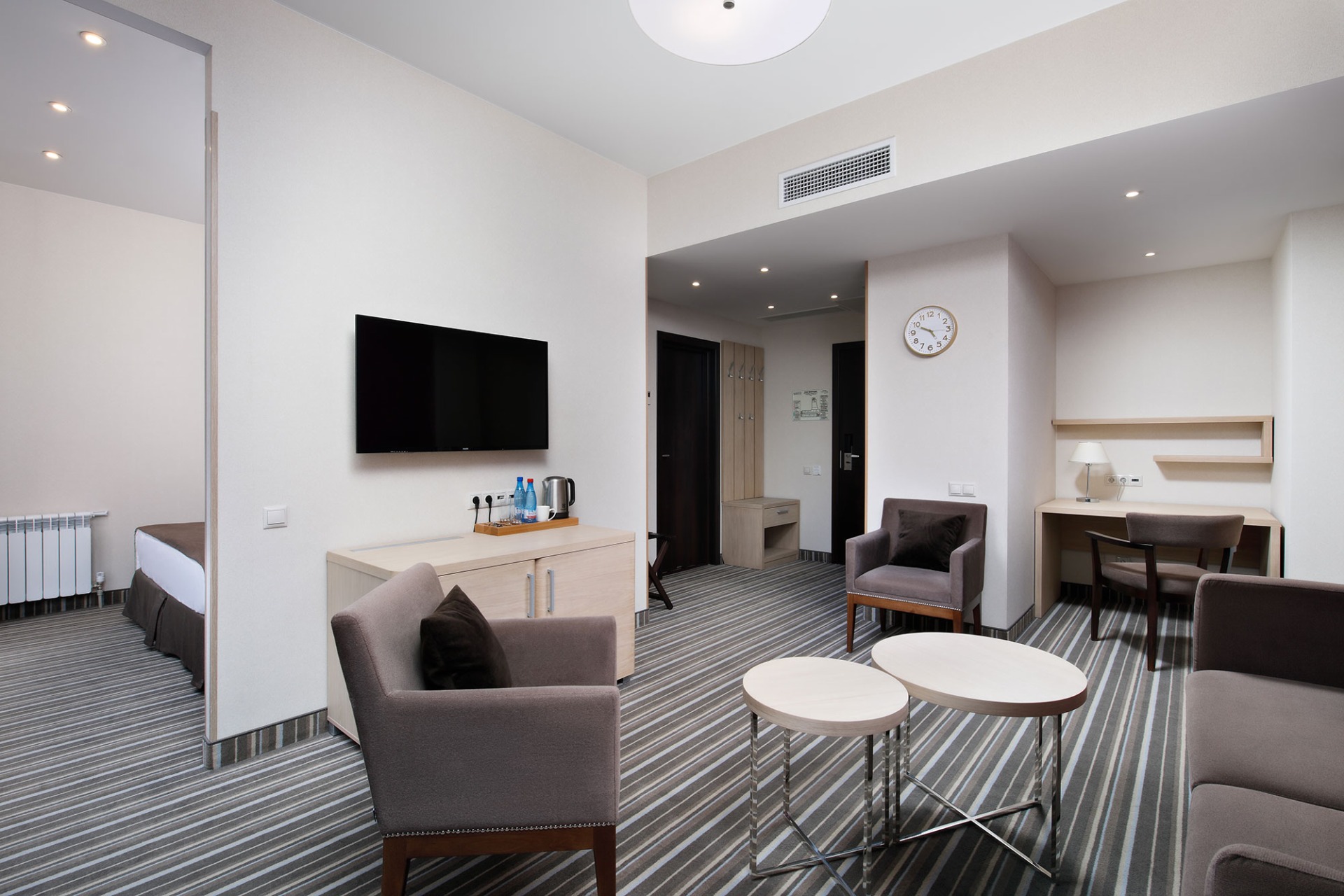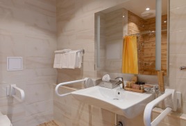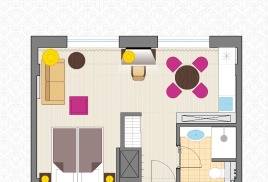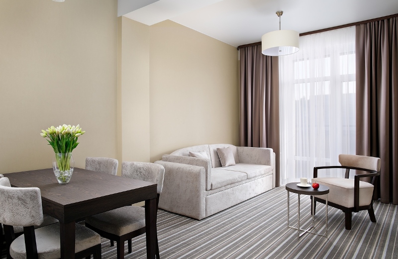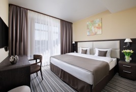 - 2-местный Джуниор Сюит. Площадь: 31,8 кв.м. В номере: сейф, телефон, ЖК телевизор, сплит-система, холодильник, 2 кровати 90х200, диван, балкон, Wi-Fi доступ в интернет.