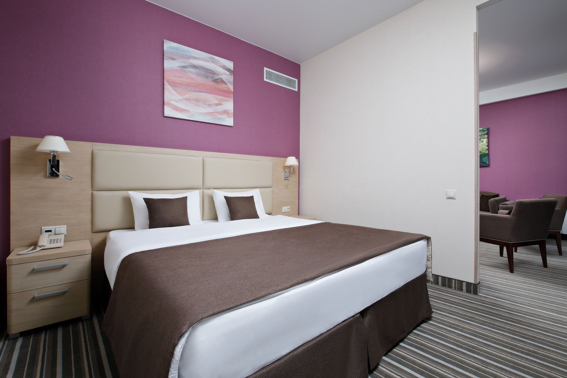 - 2-местный 2-комнатный Люкс. Площадь: 39,8 кв.м. В номере: сейф, телефон, ЖК телевизор, сплит-система, холодильник, 2 кровати 90х200, диван, рабочее место, балкон, Wi-Fi доступ в интернет.