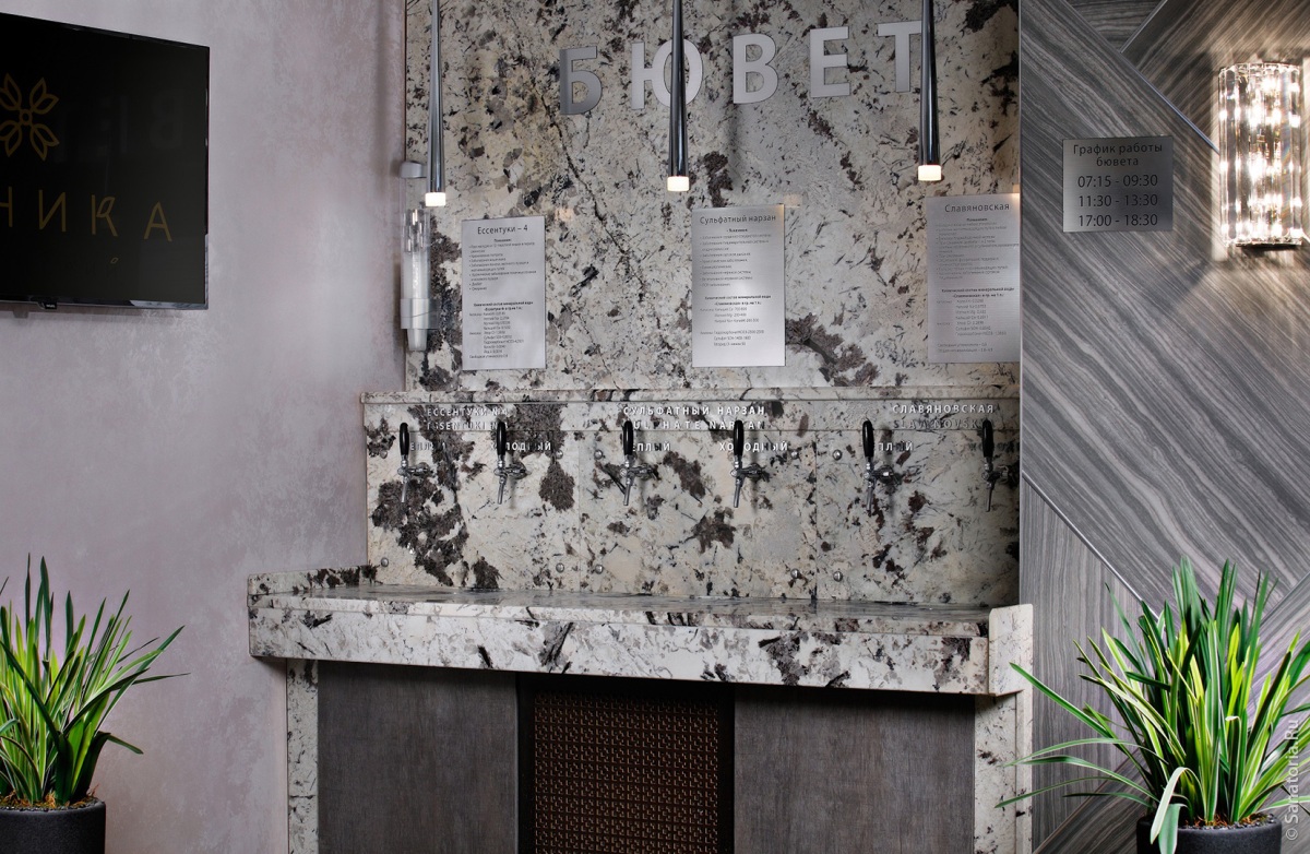 Природный лечебный фактор: собственный бювет с минеральными водами -сульфатным нарзаном, Славяновской и Ессентуки №4.