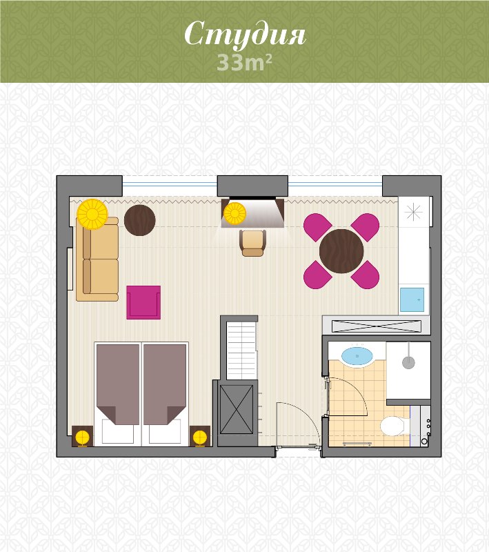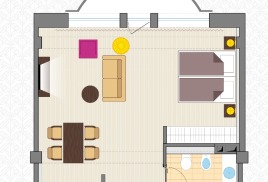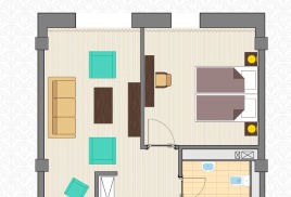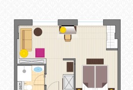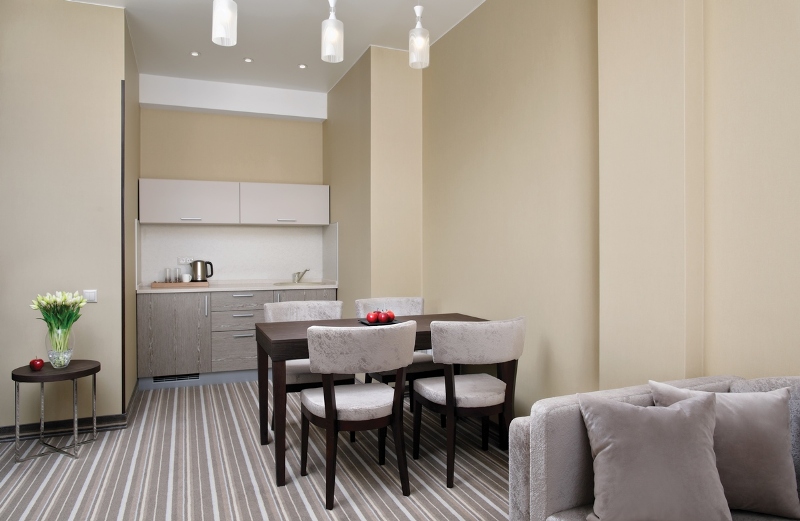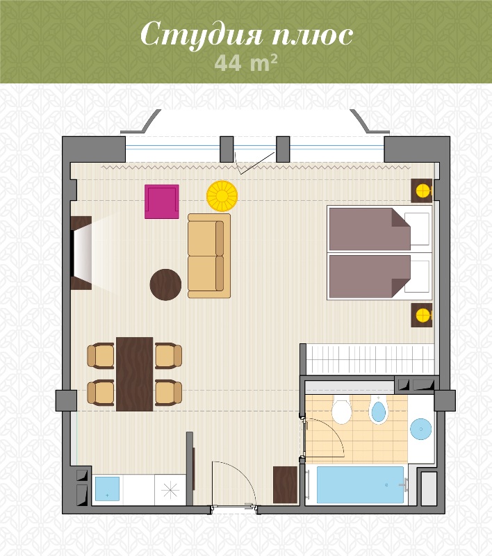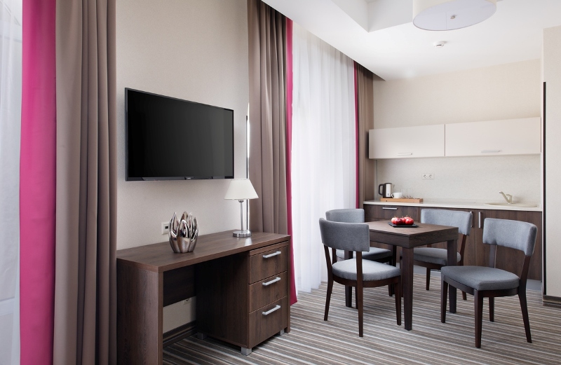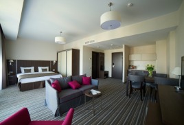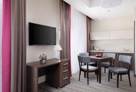 - 2-местный Студия Плюс. Площадь: 44 кв.м. В номере: сейф, телефон, ЖК телевизор, сплит-система, холодильник, мини-кухня, микроволновая печь, 2-спальная кровать 180х200, диван, балкон, Wi-Fi доступ в интернет.