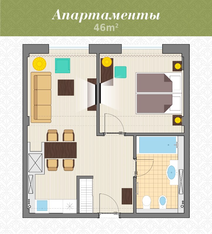 - 2-местный 2-комнатный Апартаменты. Площадь: 46 кв.м. В номере: сейф, телефон, ЖК телевизор, сплит-система, холодильник,чайный набор, мини-кухня, микроволновая печь, 2-спальная кровать 200х200, диван, балкон, Wi-Fi доступ в интернет.