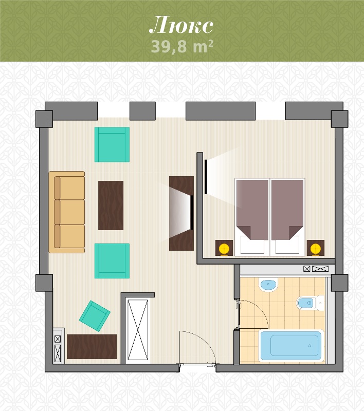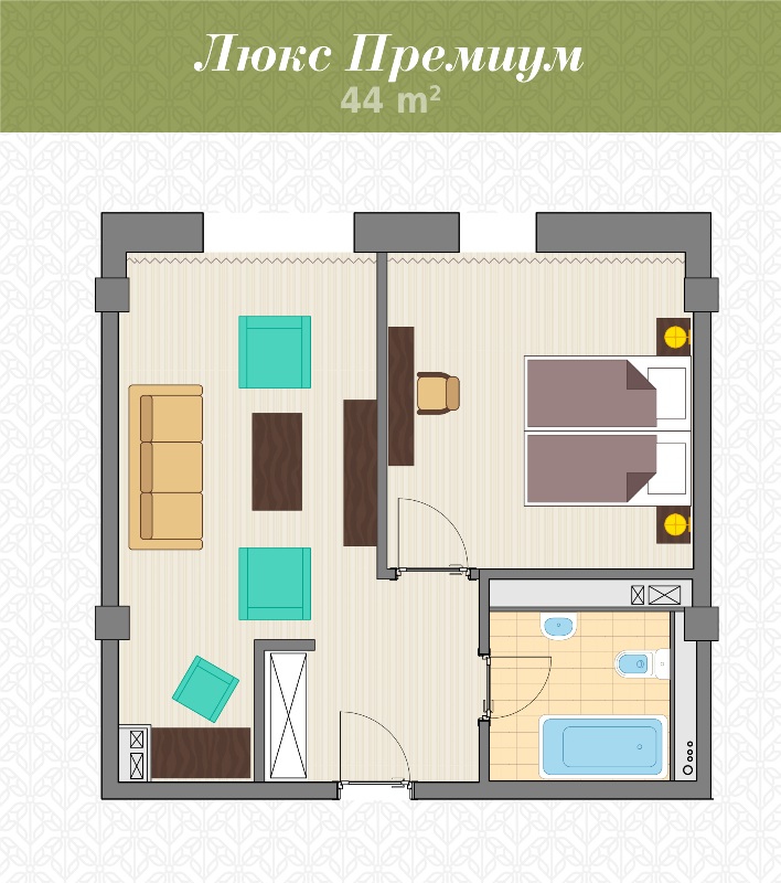 - 2-местный 2-комнатный Люкс Премиум. Площадь: 44 кв.м. В номере: сейф, телефон, ЖК телевизор, сплит-система, холодильник, 2 кровати 180х200, диван, балкон, Wi-Fi доступ в интернет.