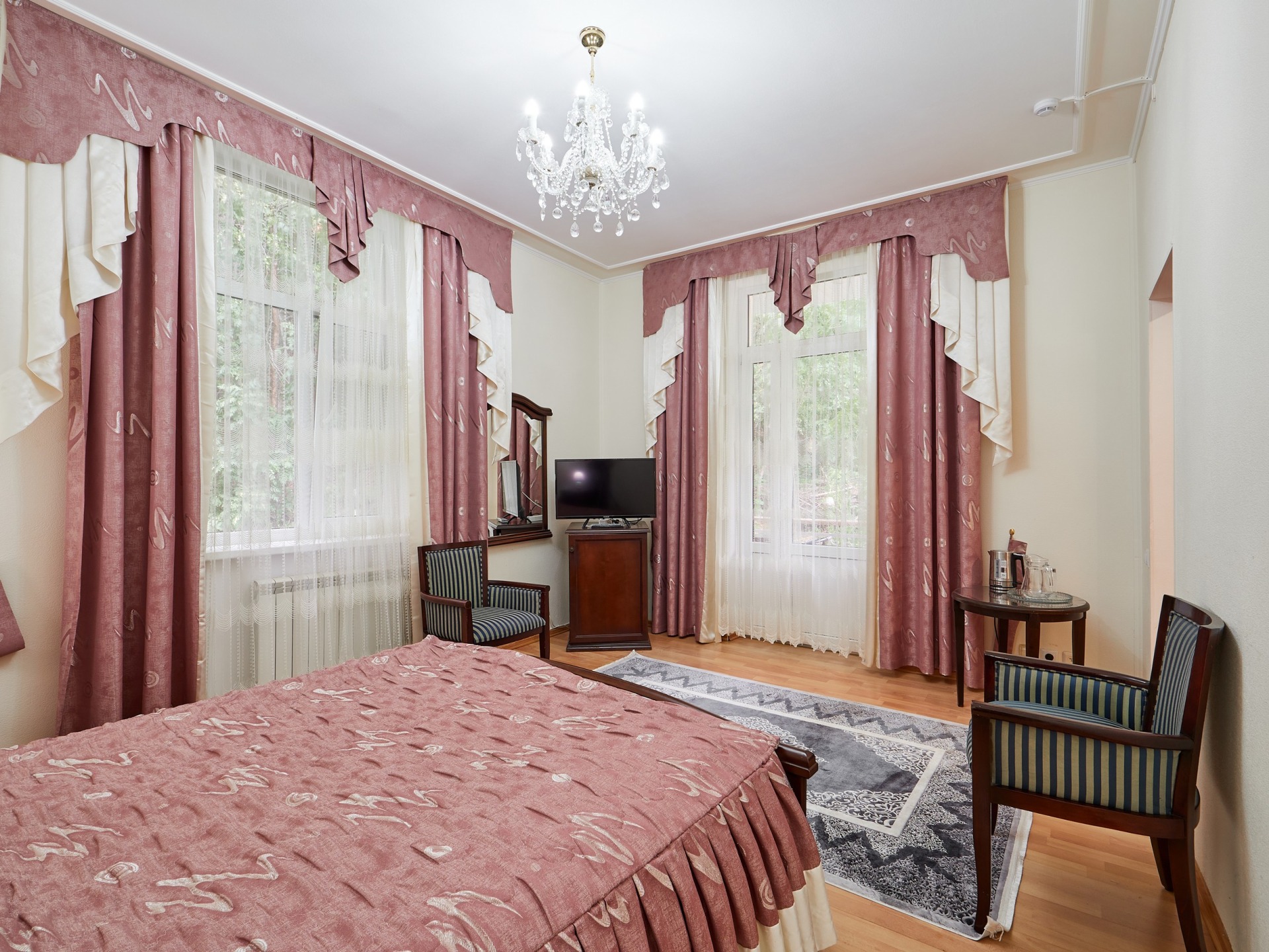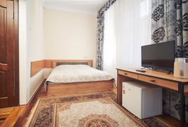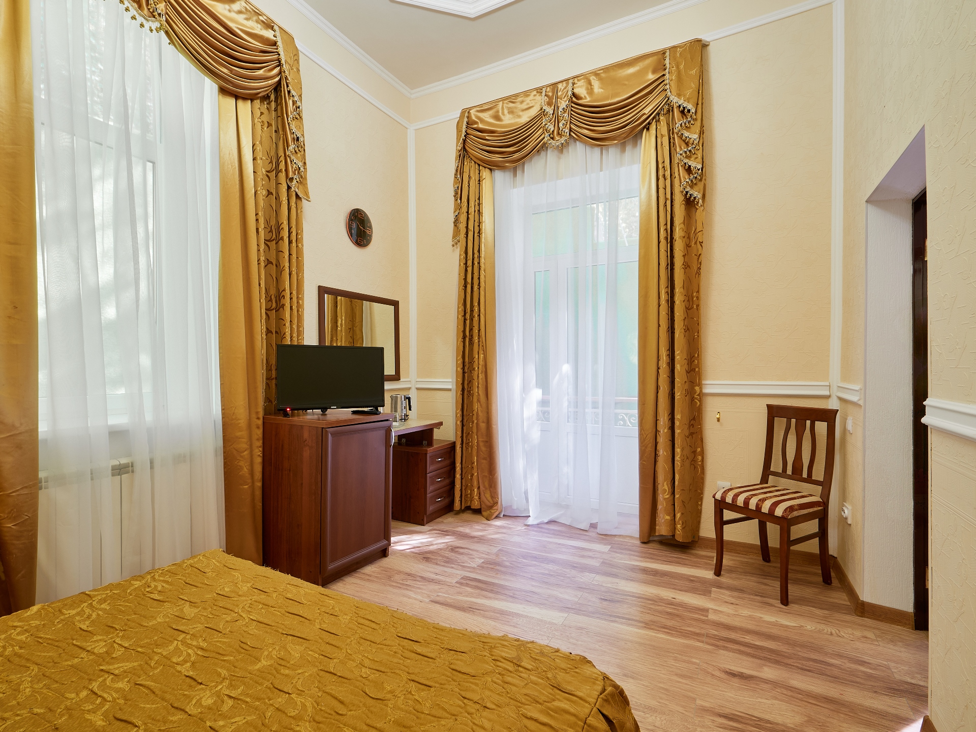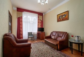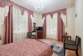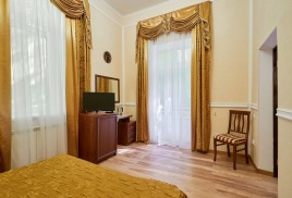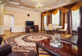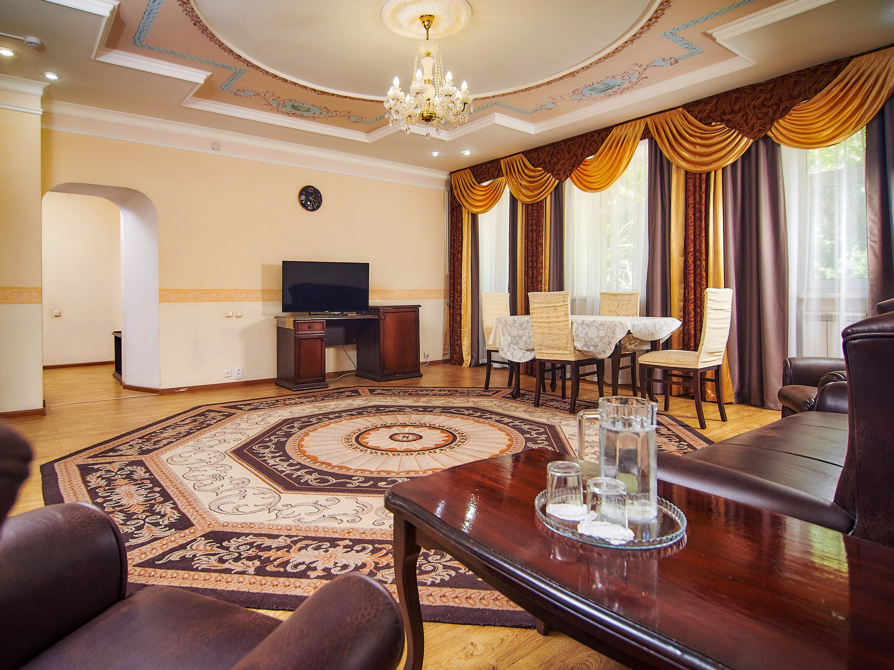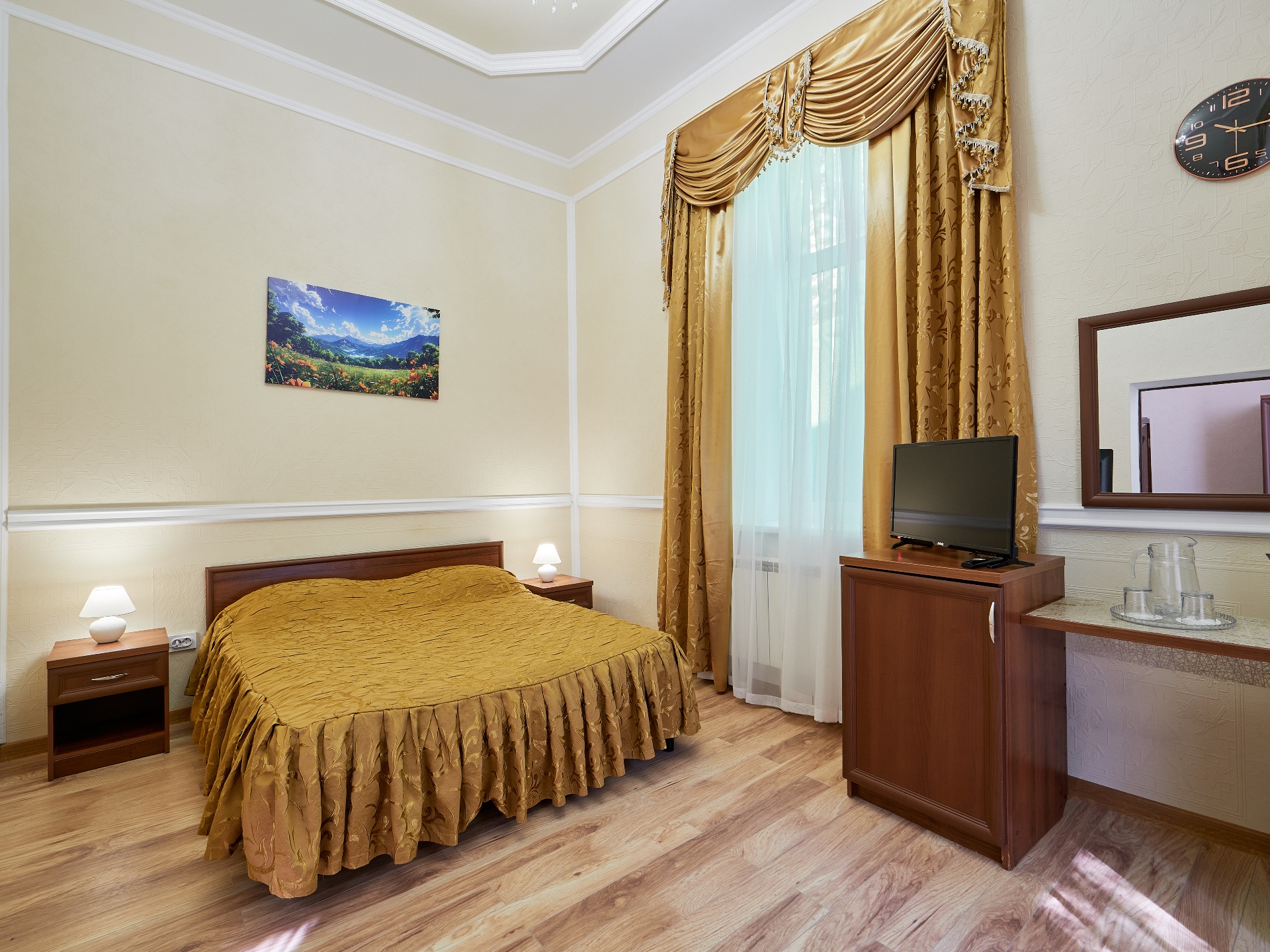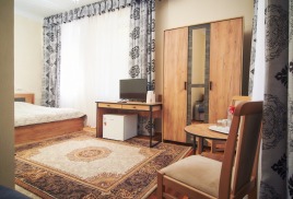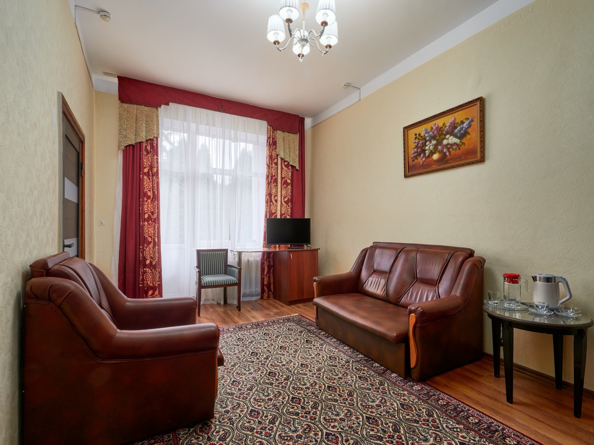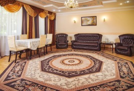 - 2-местный 2-комнатный Люкс (4 номера). Площадь: 45 кв.м. В номере: спальня с двуспальной кроватью, гостиная с мягкой мебелью, телевизор, холодильник, кондиционер, электрочайник, столовая посуда, санузел: биде, ванна.