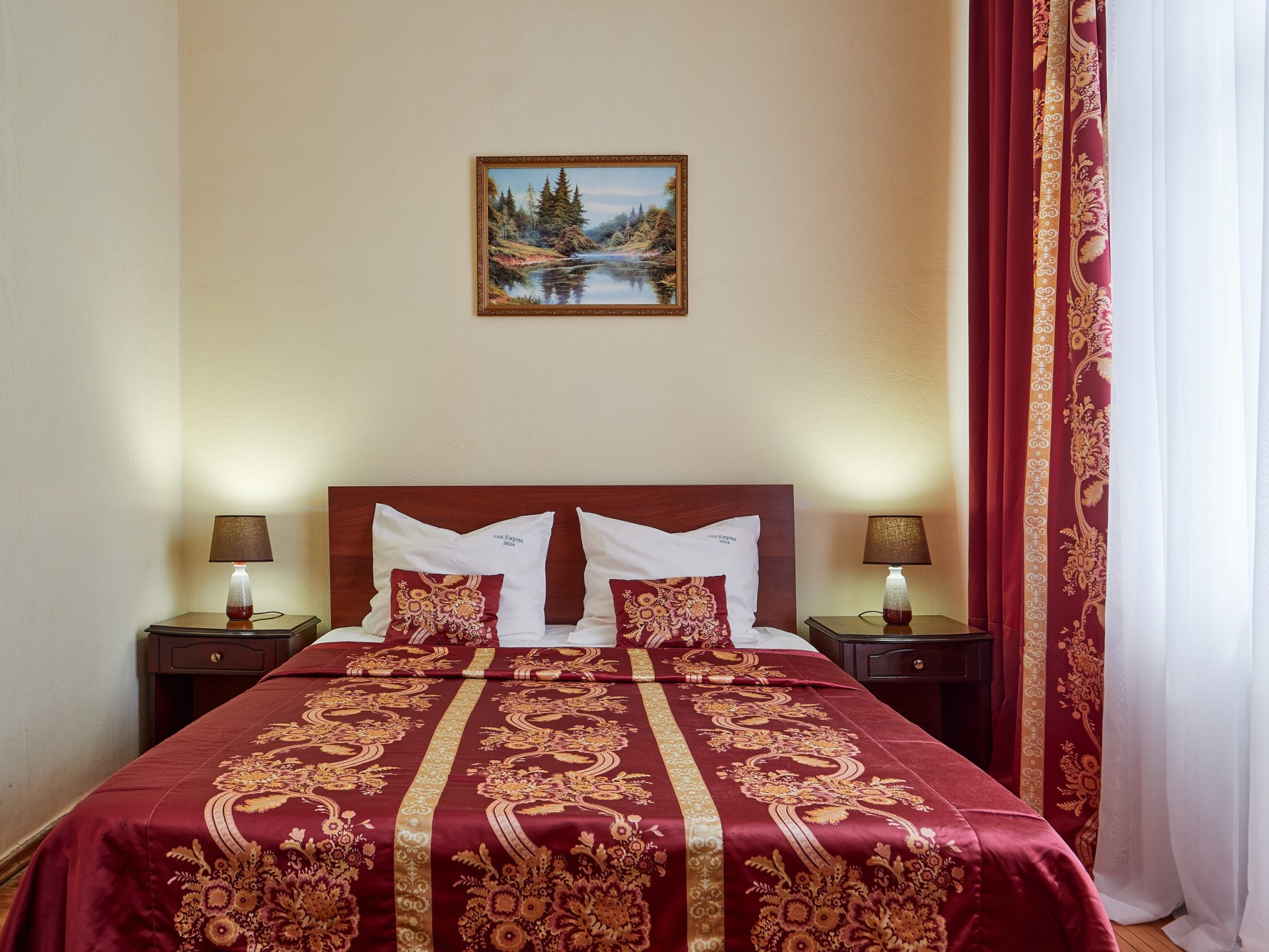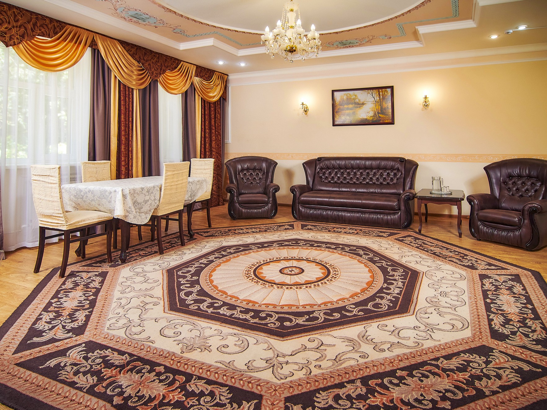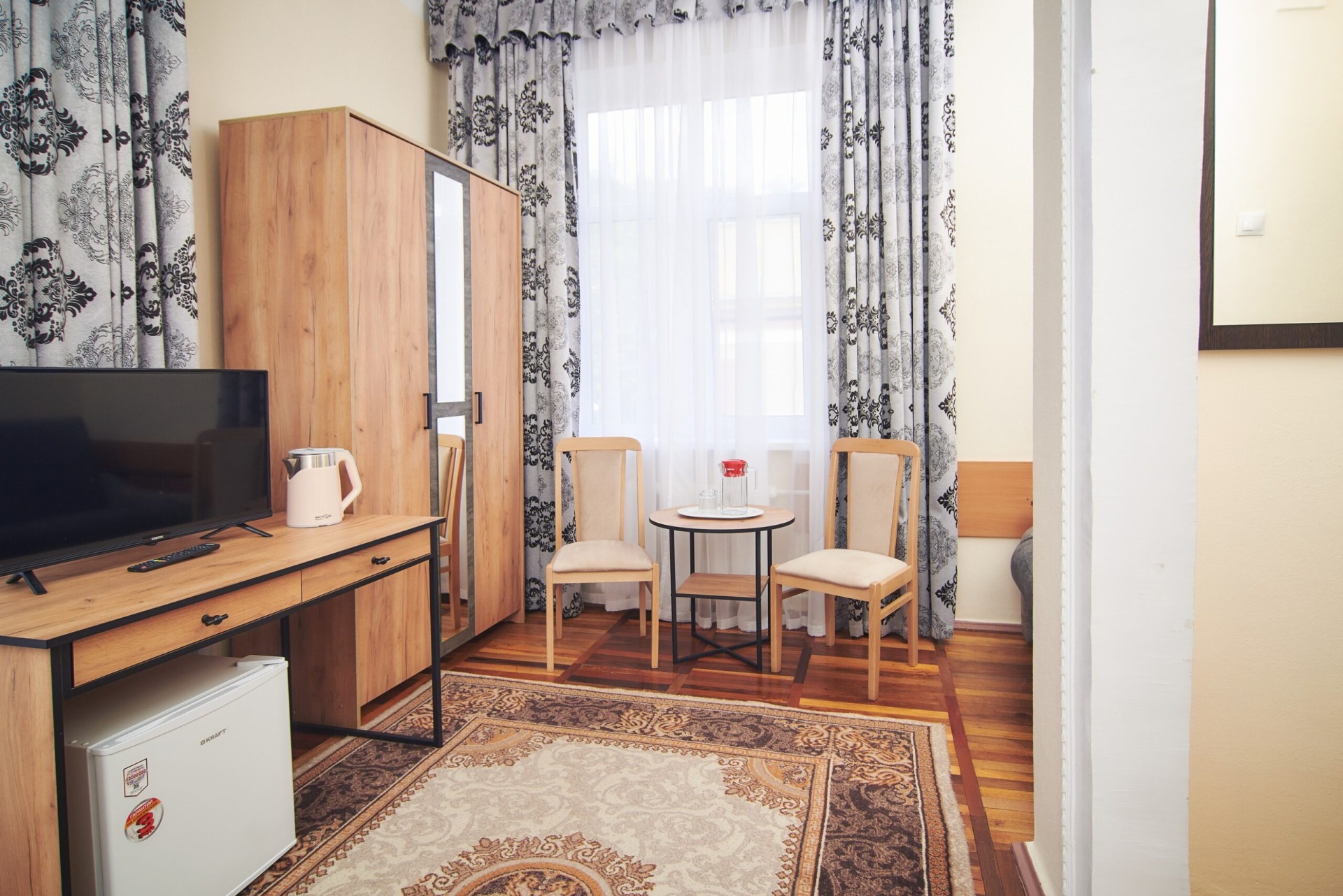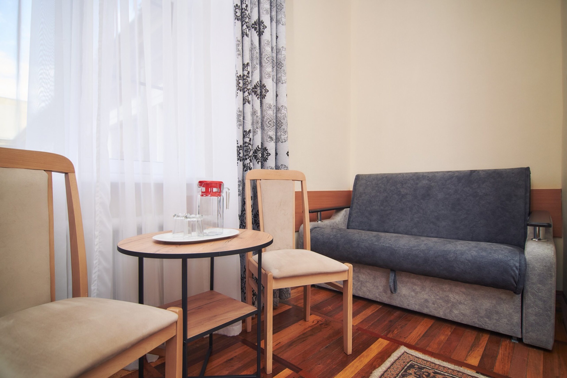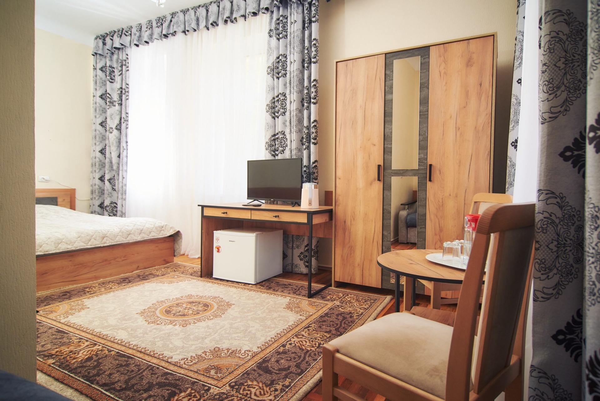 - 2-местный 2-комнатный Люкс (4 номера). Площадь: 45 кв.м. В номере: спальня с двуспальной кроватью, гостиная с мягкой мебелью, телевизор, холодильник, кондиционер, электрочайник, столовая посуда, санузел: биде, ванна.