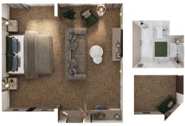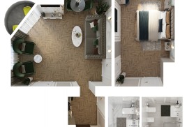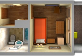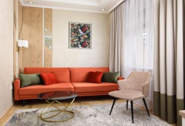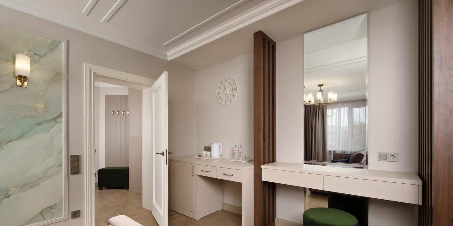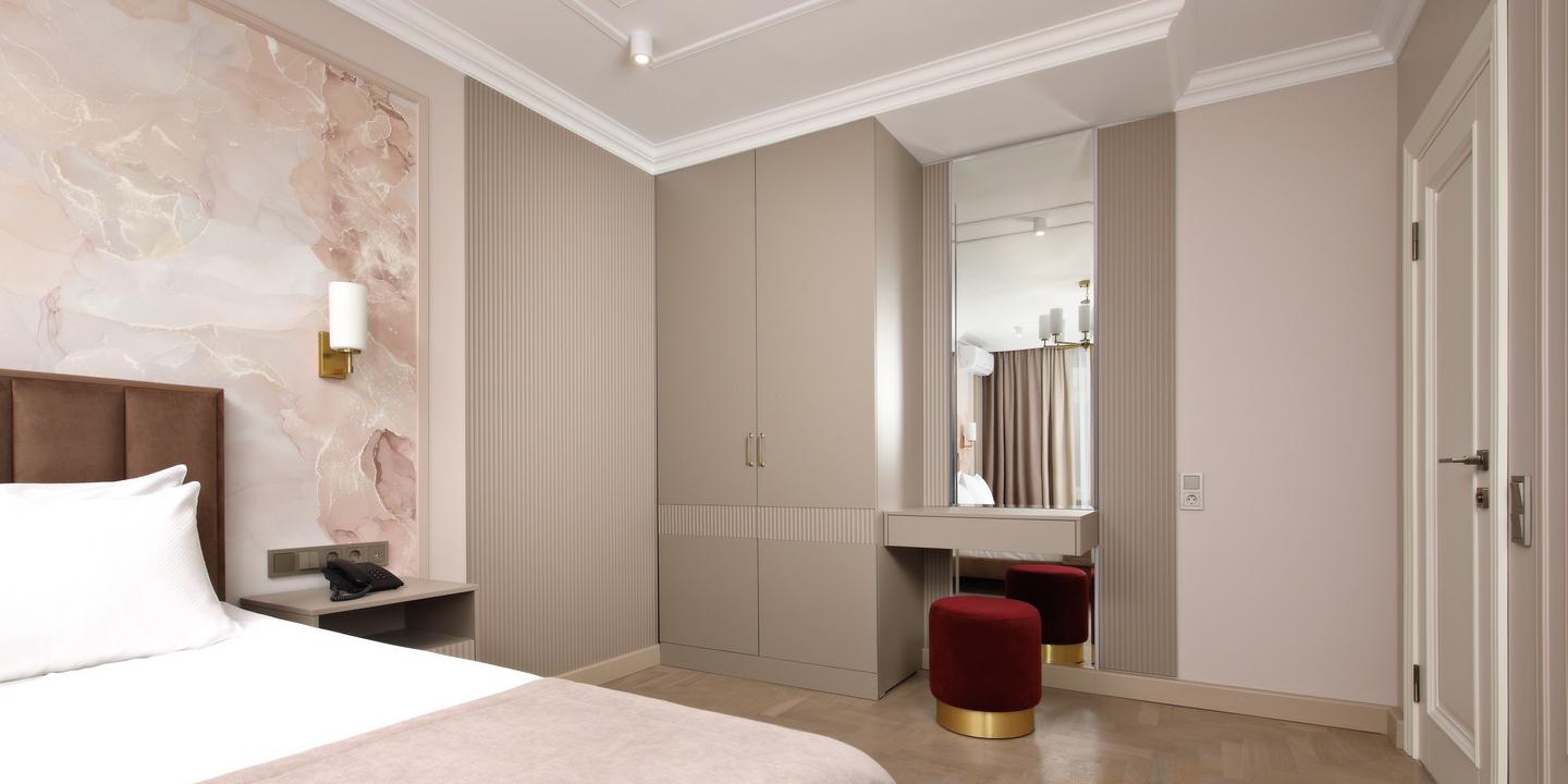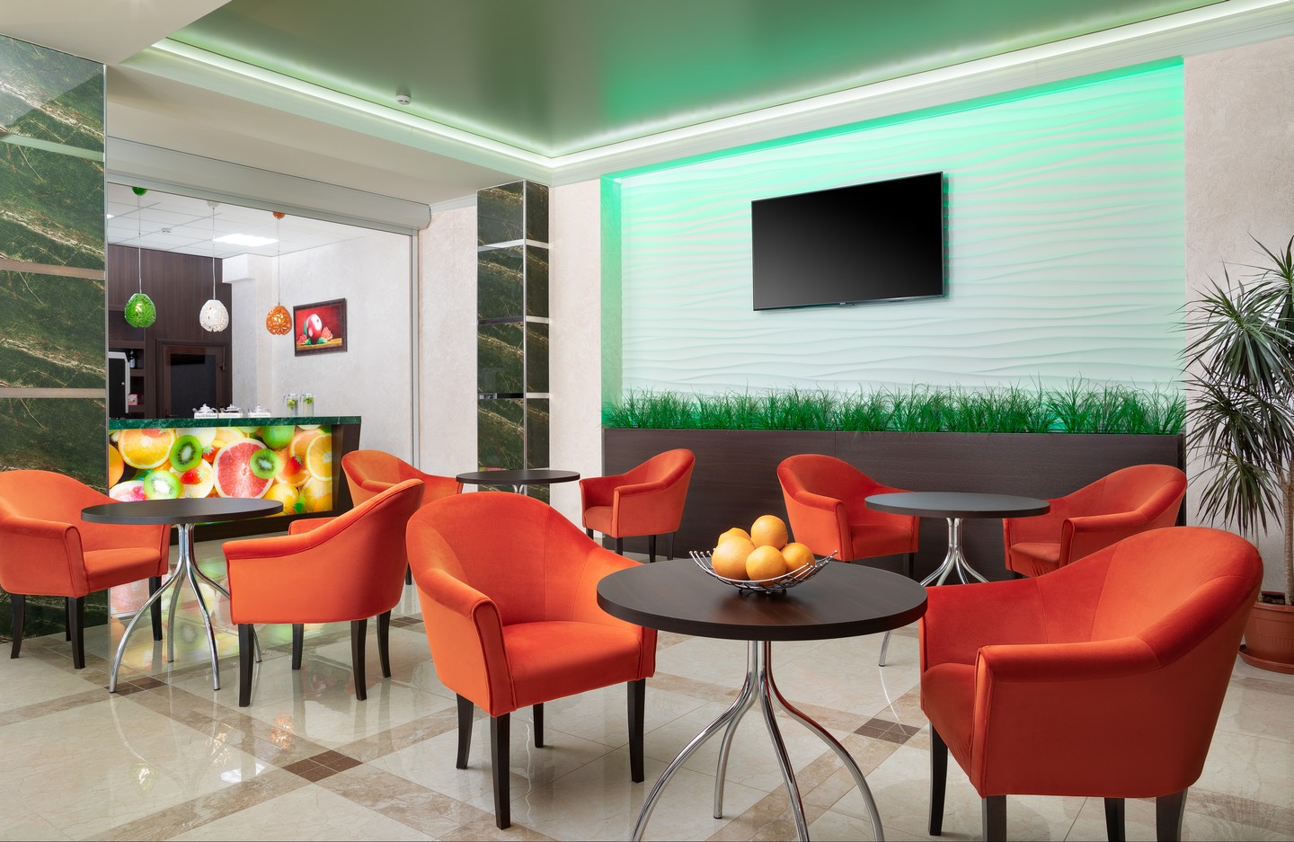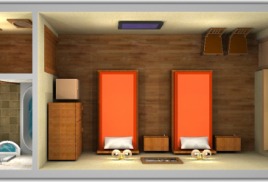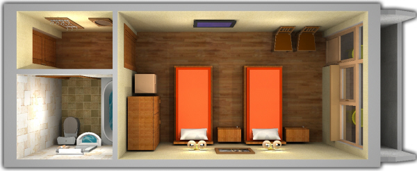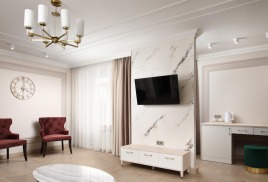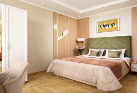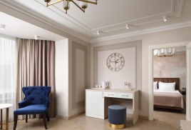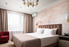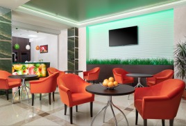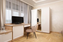 - 2-местный Люкс студия (2-5 этаж) - 4 номера. Площадь 28 кв.м. В номерах: две односпальные кровати, мягкая мебель, ЖК-телевизор, кабельные каналы телевидения, Wi-Fi в номере, мини-холодильник, телефон, сейф, кондиционер, электрический чайник, чайный набор, ванная комната: фен, халат, тапочки, туалетный набор (шампунь, гель для душа, мыло, шапочка для душа).