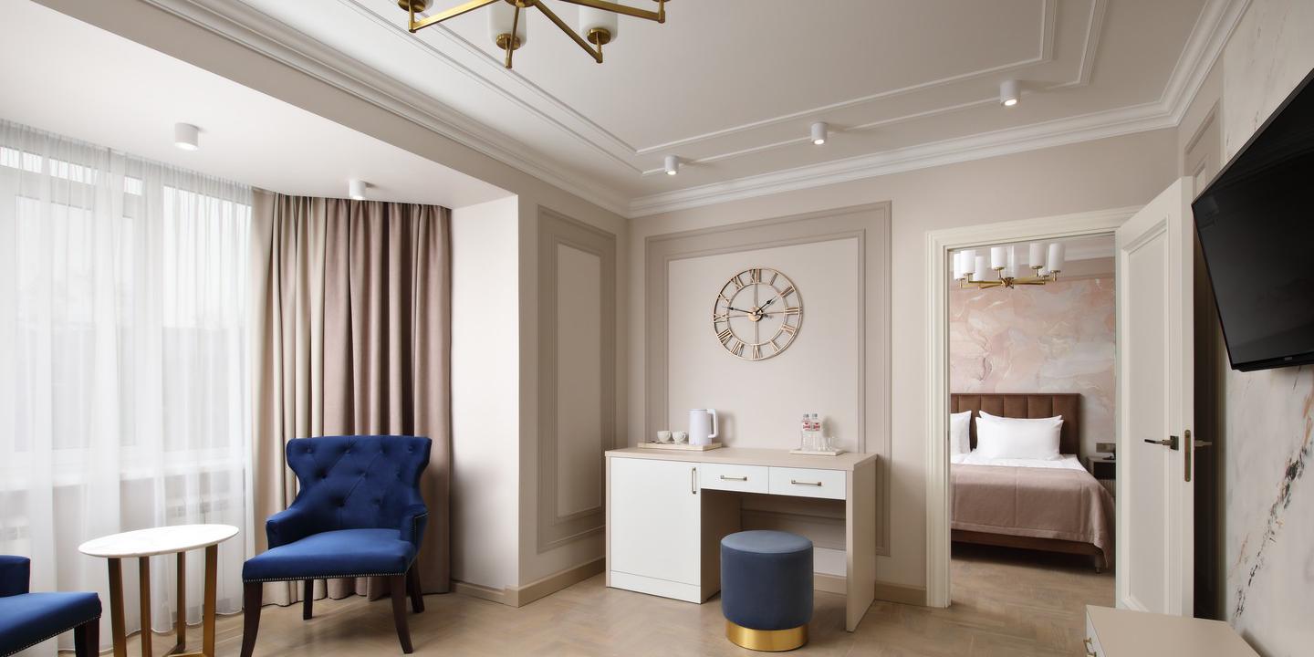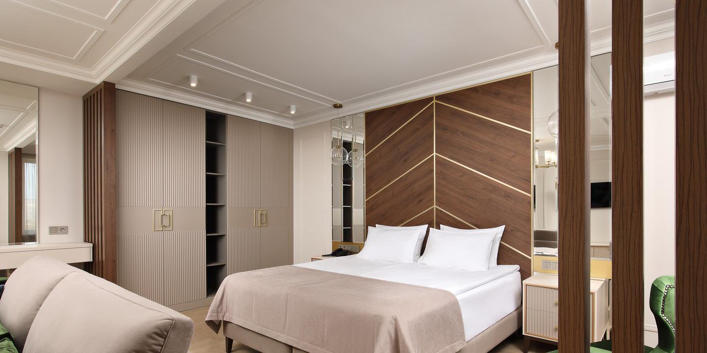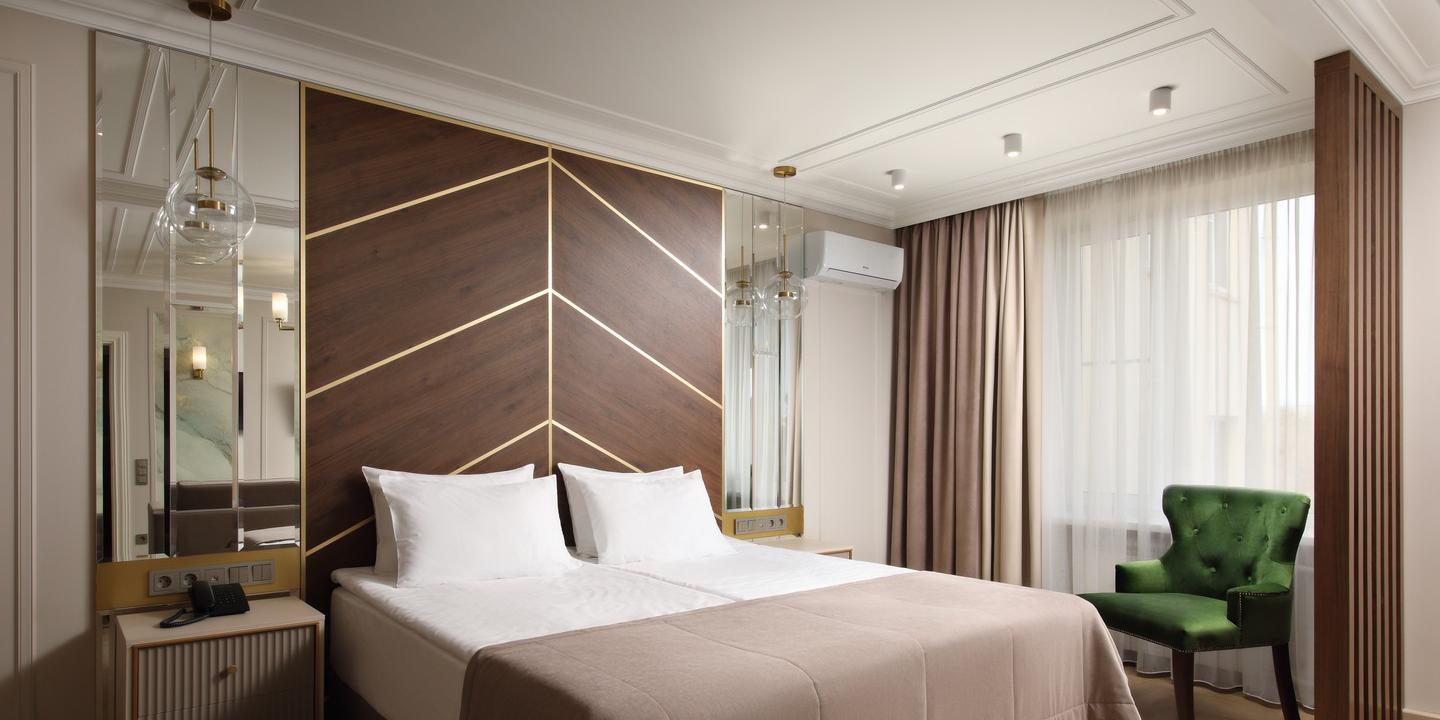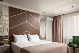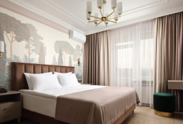 - 2-местный Люкс (1-5 этаж) - 15 номеров. Площадь 43.1 кв.м. В номерах: двуспальная кровать, мягкая мебель, ЖК-телевизор, кабельные каналы телевидения, Wi-Fi в номере, мини-холодильник, телефон, сейф, кондиционер, электрический чайник, чайный набор, ванная комната: фен, халат, тапочки, туалетный набор (шампунь, гель для душа, мыло, шапочка для душа).