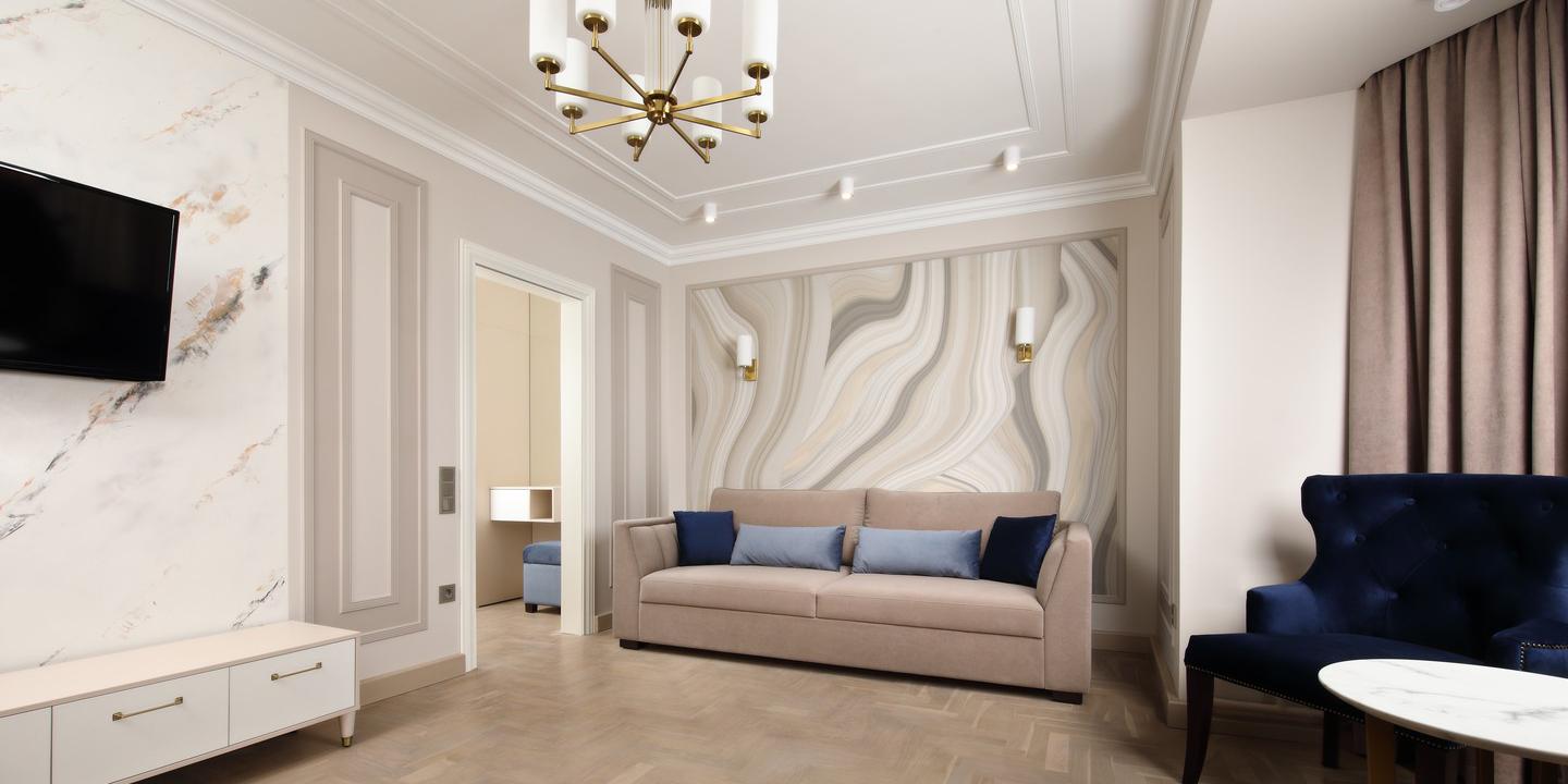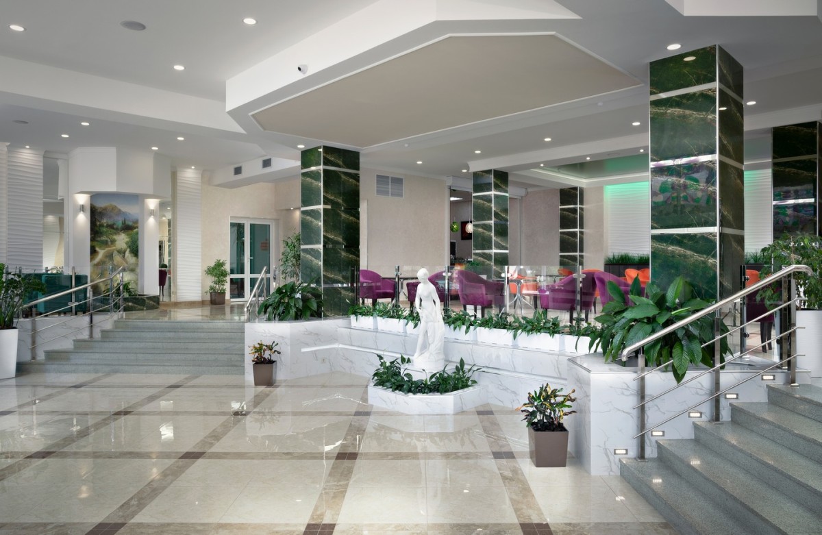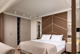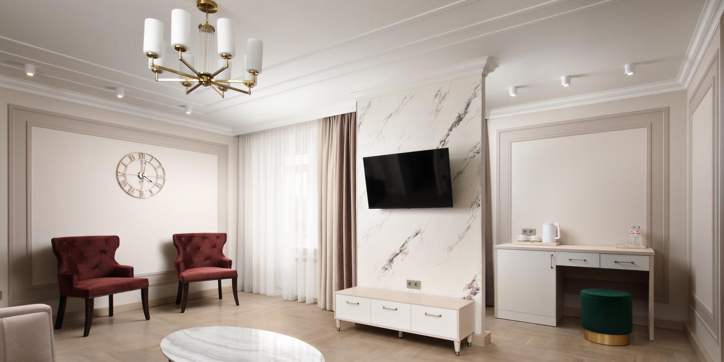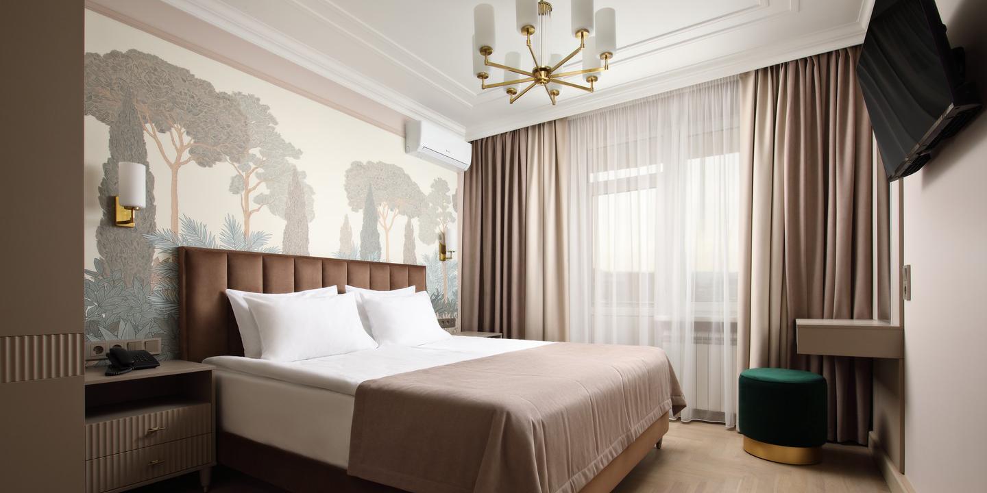 - 2-местный Люкс (1-5 этаж) - 15 номеров. Площадь 43.1 кв.м. В номерах: двуспальная кровать, мягкая мебель, ЖК-телевизор, кабельные каналы телевидения, Wi-Fi в номере, мини-холодильник, телефон, сейф, кондиционер, электрический чайник, чайный набор, ванная комната: фен, халат, тапочки, туалетный набор (шампунь, гель для душа, мыло, шапочка для душа).