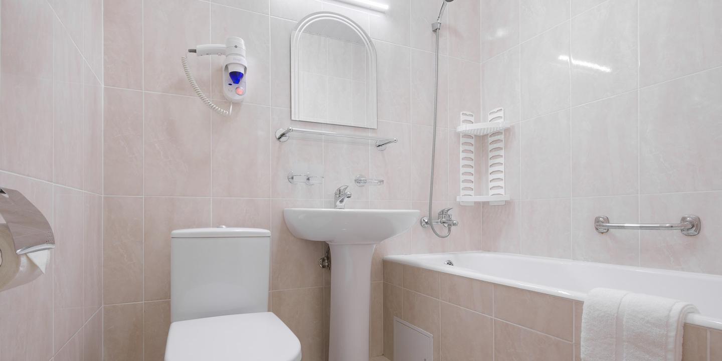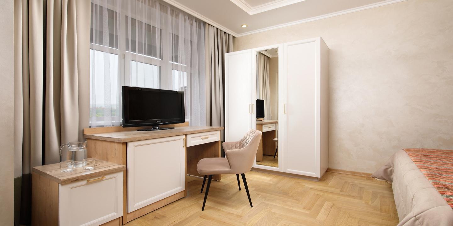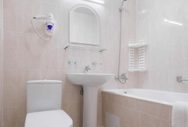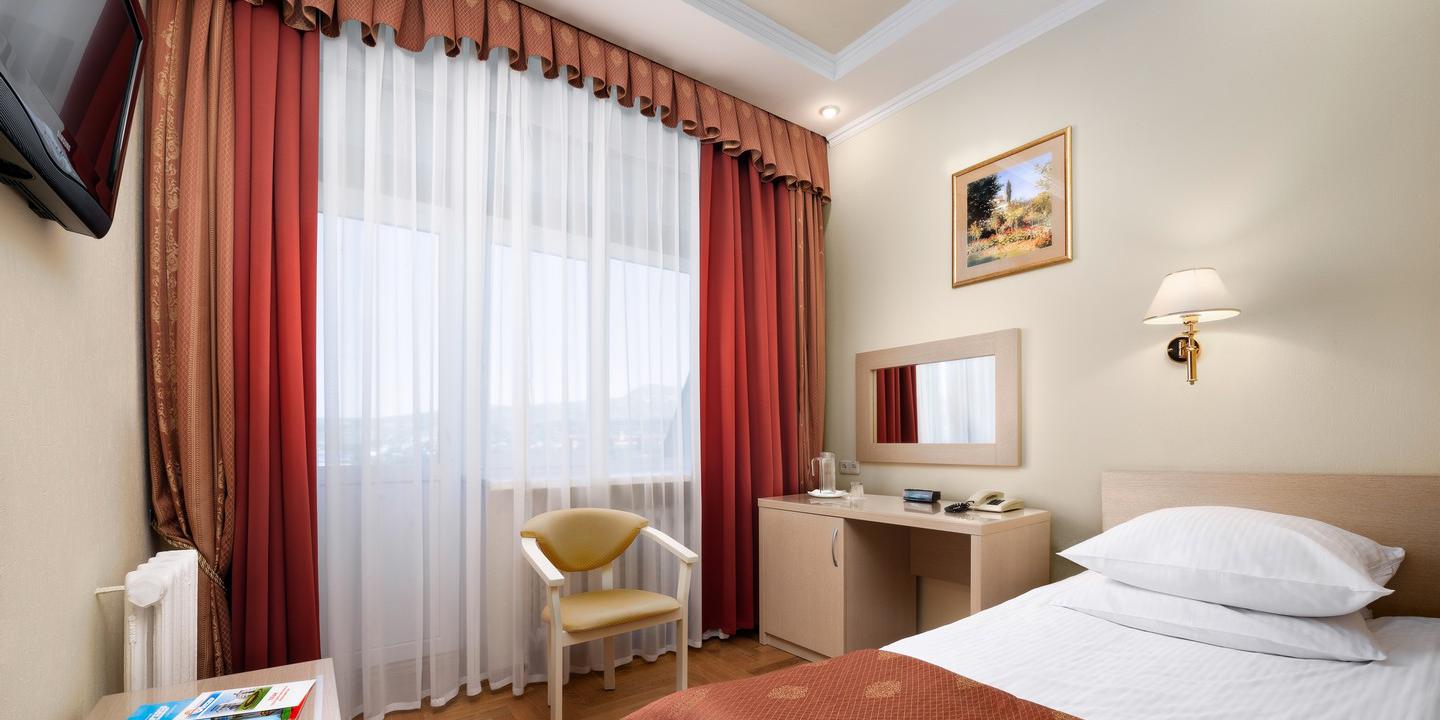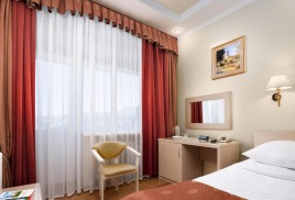 - 1-местный стандарт (2-6 этаж) - 42 номера. Площадь 13,4 кв.м. В номерах: односпальная кровать, телевизор, спутниковые каналы телевидения, мини-холодильник, телефон, сейф, ванная комната: фен, туалетный набор (шампунь, гель для душа, мыло, шапочка для душа), балкон.