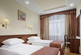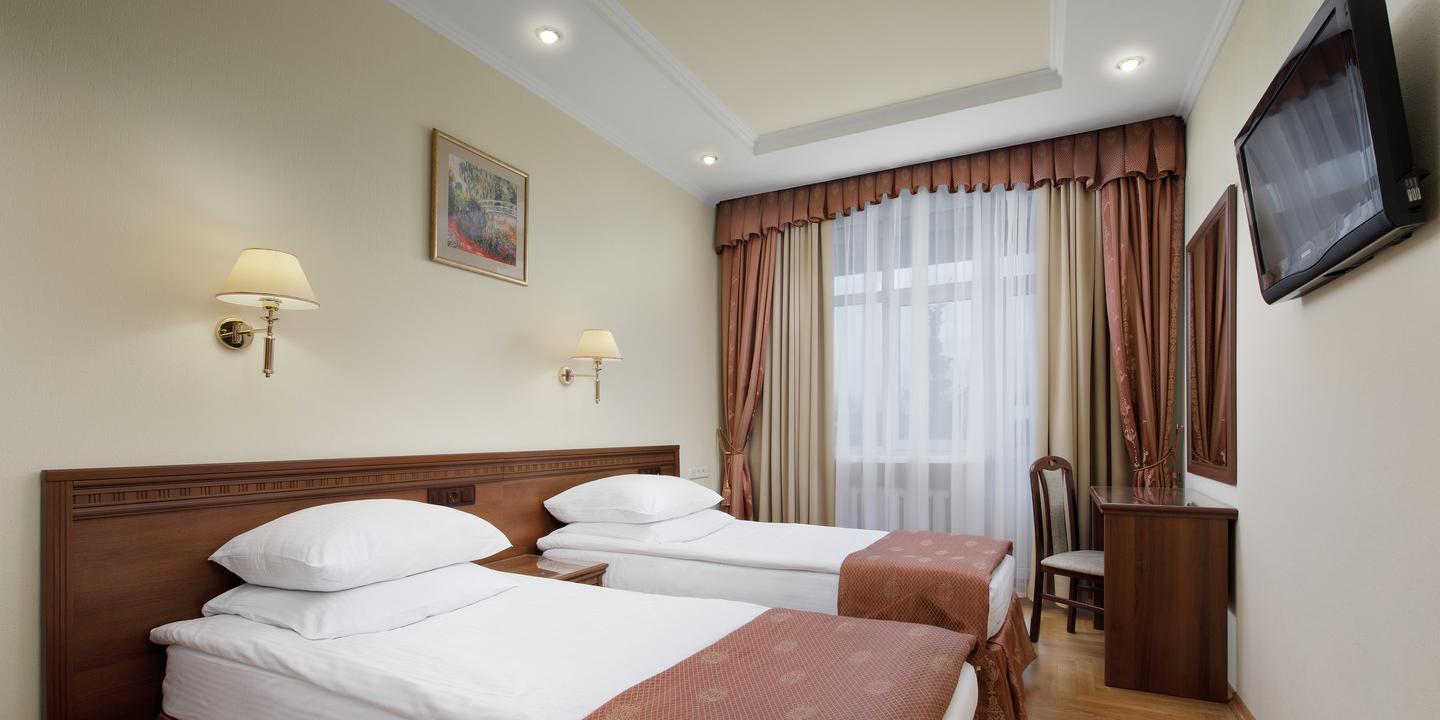 - 2-местный стандарт (2-6 этаж) - 65 номеров. Площадь 18,9 кв.м. В номерах: две односпальные кровати, телевизор, кабельные каналы телевидения, мини-холодильник, телефон, сейф, ванная комната: фен, туалетный набор (шампунь, гель для душа, мыло, шапочка для душа), балкон.