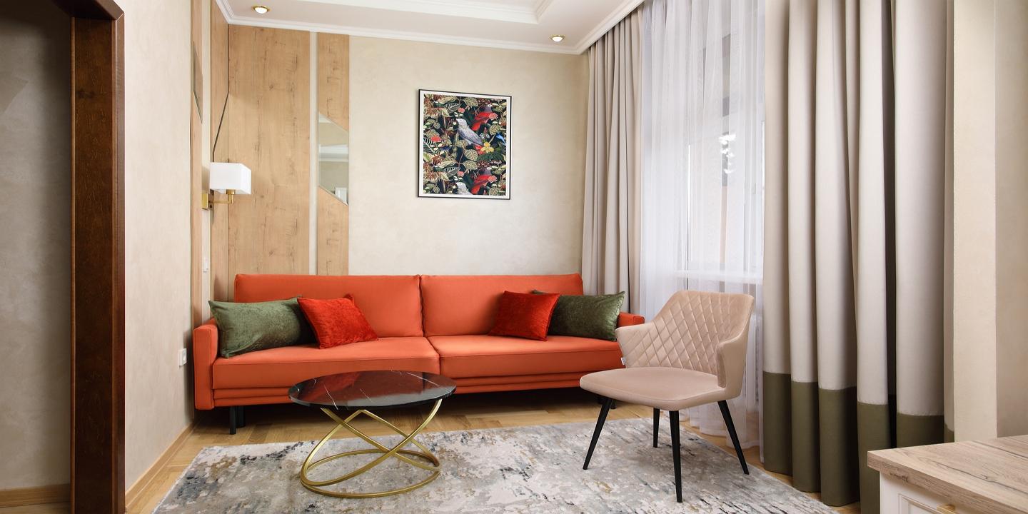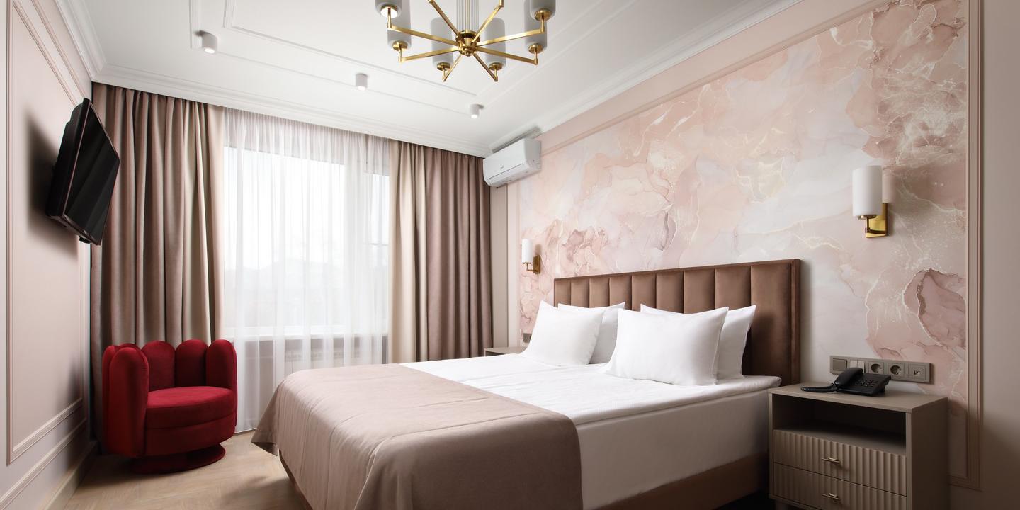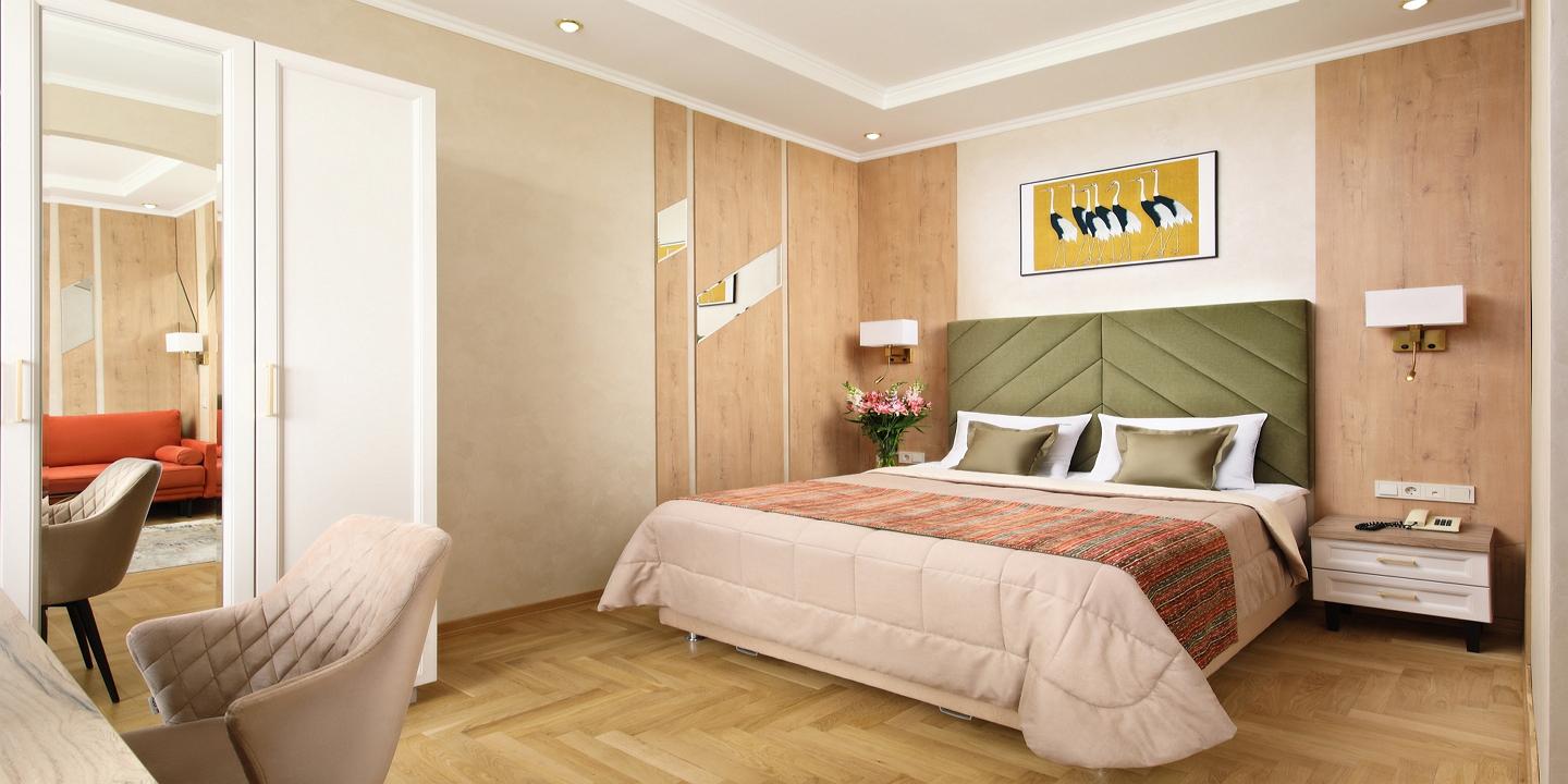- 2-местный Люкс с балконом (1-5 этаж) - 8 номеров. Площадь 54 кв.м. В номерах: двуспальная кровать, мягкая мебель, ЖК-телевизор, кабельные каналы телевидения, Wi-Fi в номере, мини-холодильник, телефон, сейф, кондиционер, электрический чайник, чайный набор, ванная комната: фен, халат, тапочки, туалетный набор (шампунь, гель для душа, мыло, шапочка для душа).