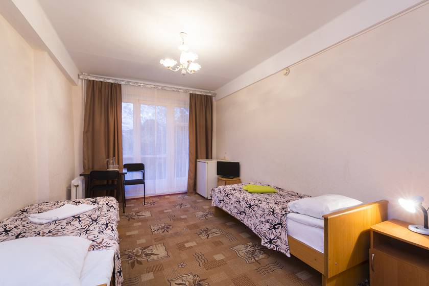 - 2-местный 2-категории. Площадь 14 кв.м. В номере: две односпальные кровати, санузел с душем, телевизор, холодильник, электрочайник, радио, балкон.