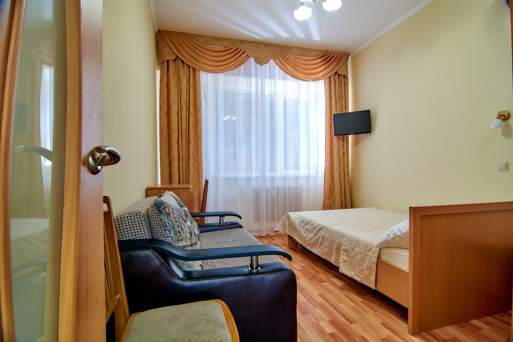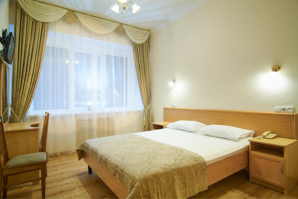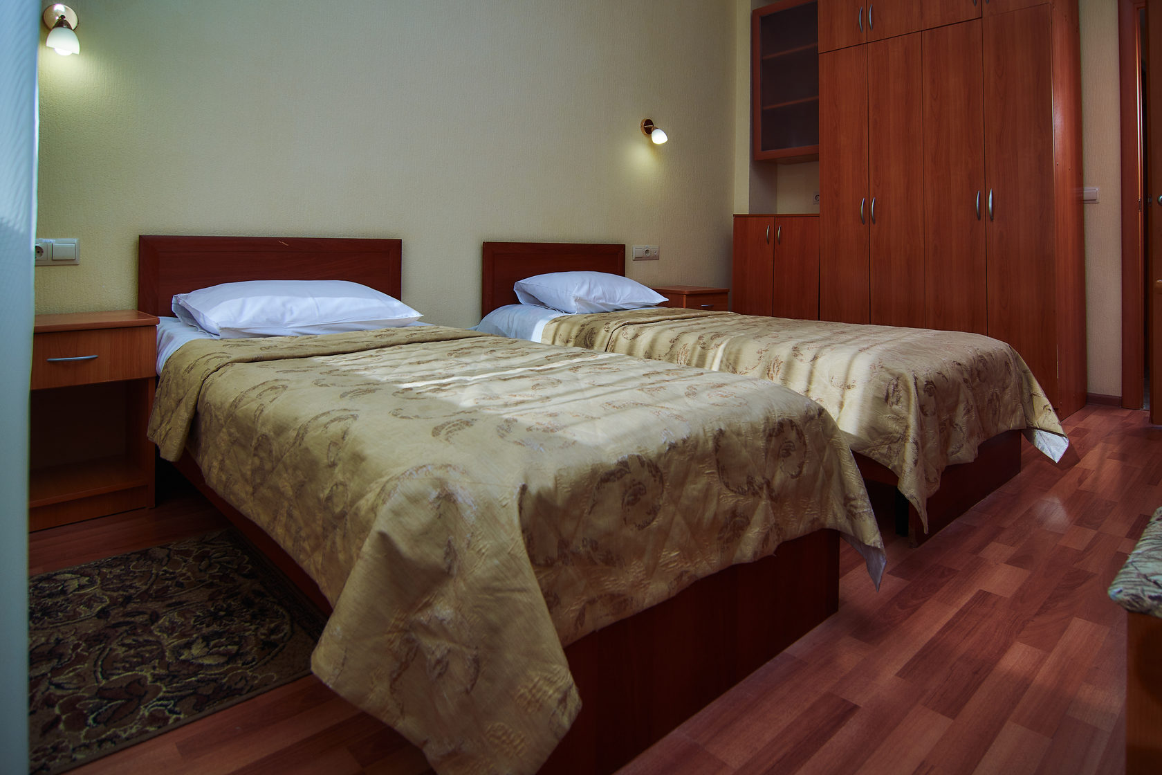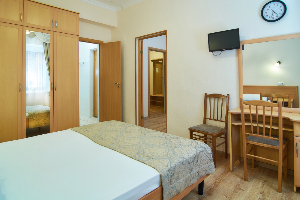 - 2-местный улучшенный с балконом / без балкона.Площадь 19м². В номере одна двуспальная или две односпальные кровати, холодильник, телевизор, фен, сейф, санузел с ванной.