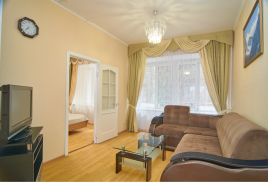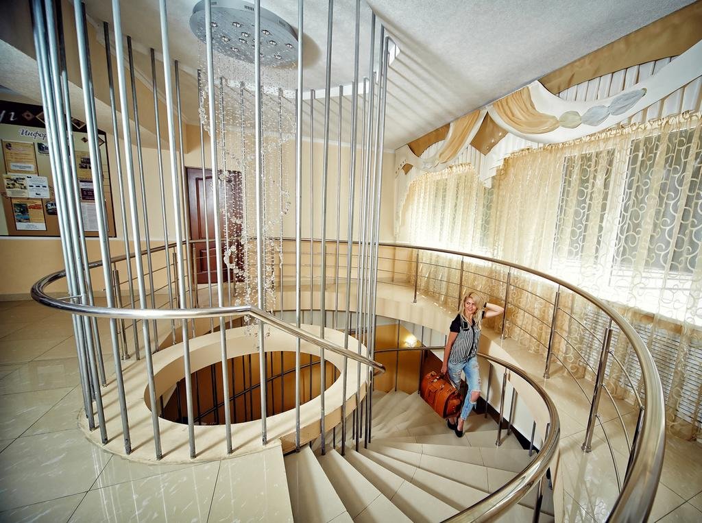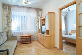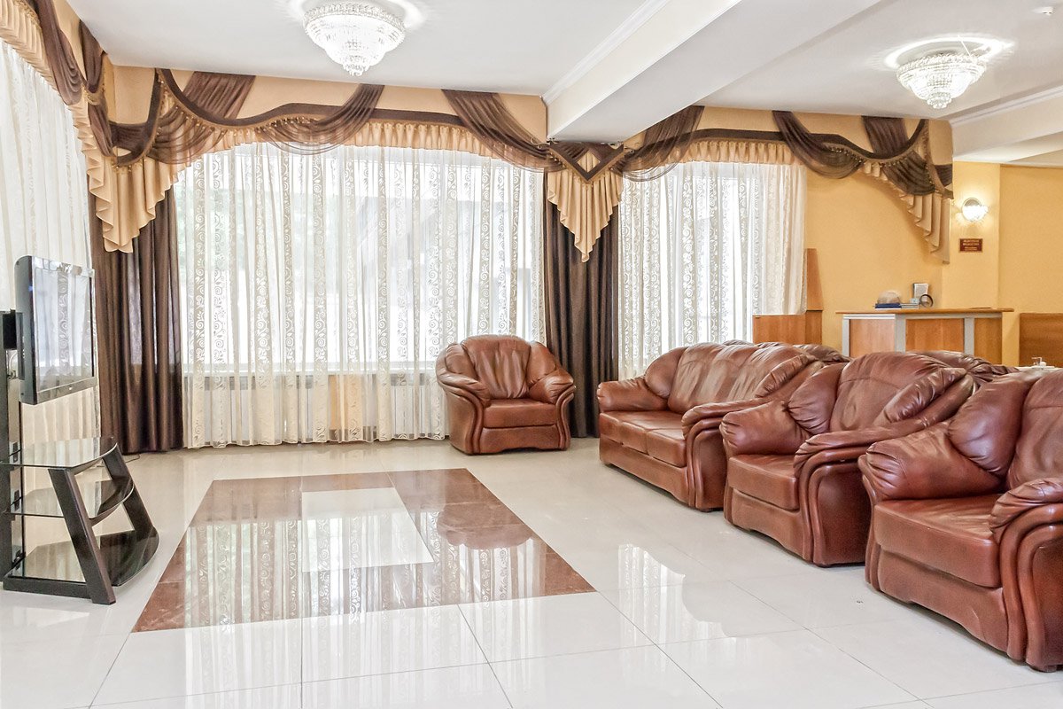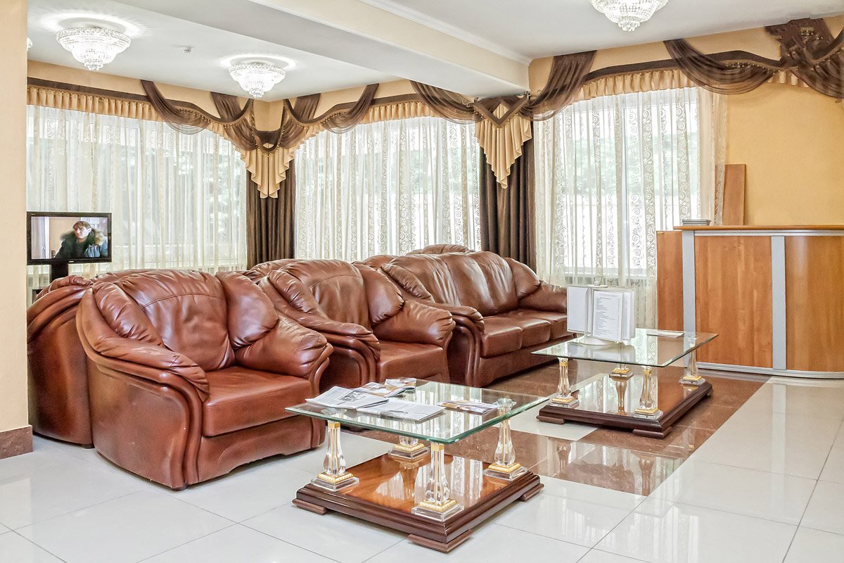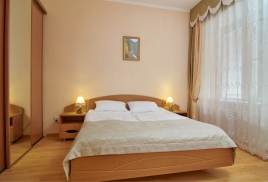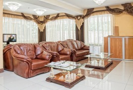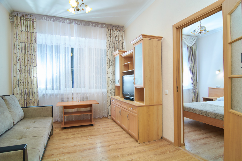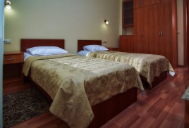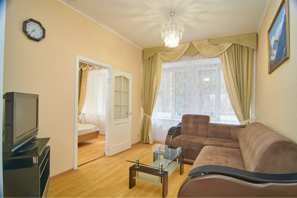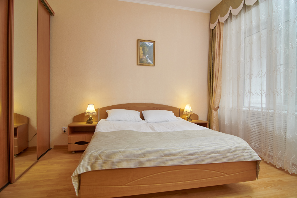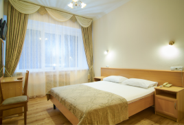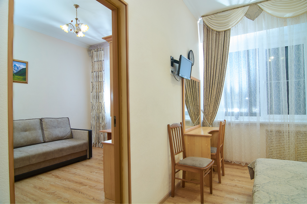 - 2-местный 2-комнатный Люкс (без балкона). 2-7й этажи. Площадь 40.6 м². В номере: гостиная с мягкой мебелью, спальня с двуспальной кроватью, телевизор, утюг с гладильной доской, холодильник, фен, сейф, санузел с душевой кабиной.