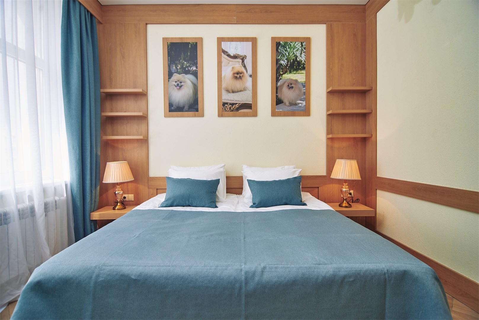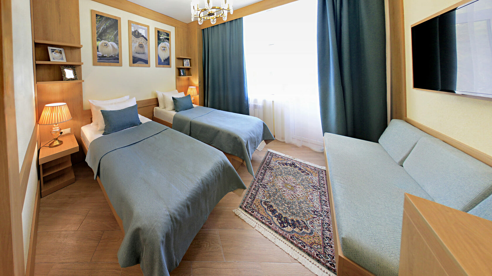 - 2-местный 1-комнатный Делюкс с балконом / без балкона. Площадь 25 кв.м. В номере: одна двуспальная кровать или две односпальные кровати, кондиционер, телевизор, холодильник, чайник с набором посуды, санузел с душем, фен, халат и тапочки, набор косметических средств. Дополнительное место не устанавливается.
