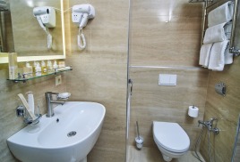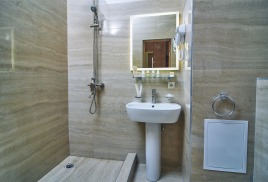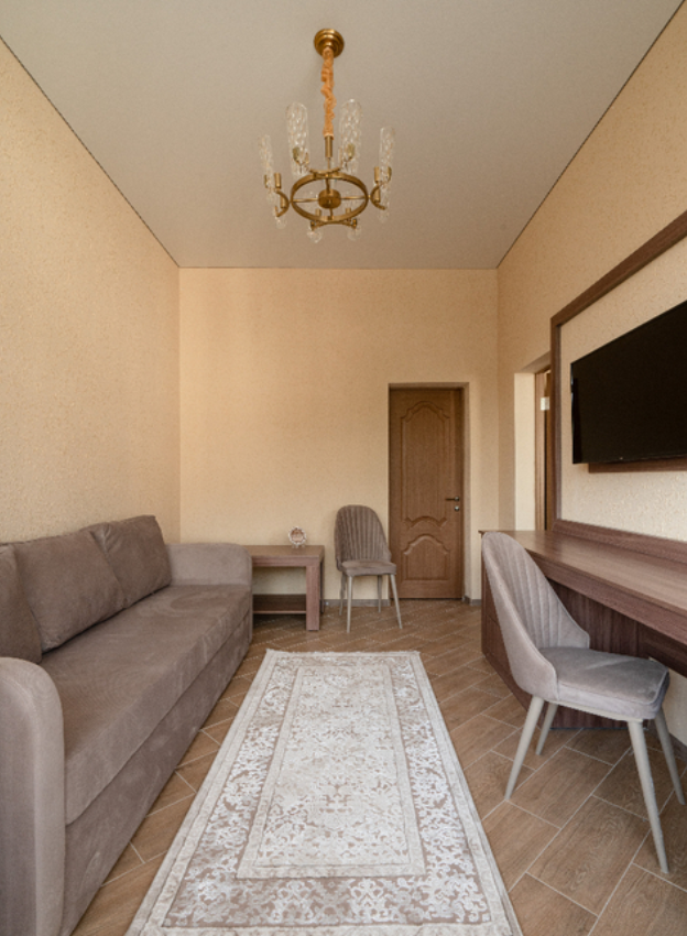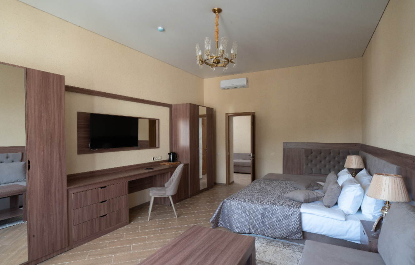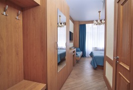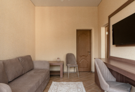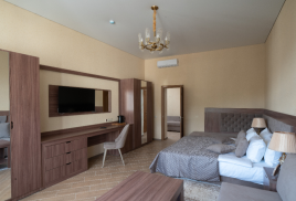 - 2-местный 2-комнатный Люкс. Площадь 30 кв.м. В номере: спальня с двуспальной кроватью или с двумя односпальные кроватями, гостиная с мягкой мебелью, кондиционер, телевизор, холодильник, чайник с набором посуды, санузел с душем, фен, халат и тапочки, набор косметических средств.