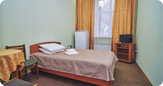- 1-местный 1-комнатный Стандарт Площадь: 9 кв.м. В номере: односпальная кровать, телевизор, холодильник, санузел с душем. Номер с балконом. Дополнительное место не устанавливается.