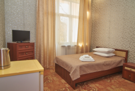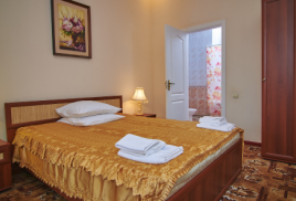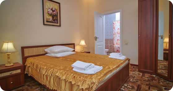 - 1-местный 2-комнатный улучшенный. Площадь: 15 кв.м. В номере: спальня с полутороспальной кроватью, гостиная с двумя креслами, телевизор, холодильник, санузел с душем. Дополнительное место не устанавливается.