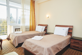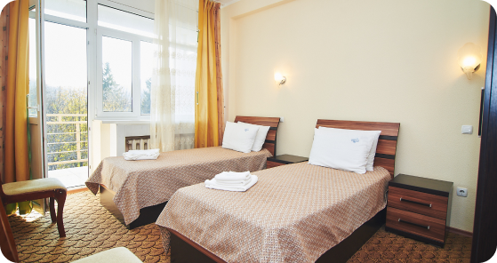 - 2-местный 2-комнатный улучшенный с балконом / без балкона. Площадь: 18 кв.м. В номере: спальная с двумя полутороспальными кроватями, гостиная с мягкой мебелью, телевизор, холодильник, санузел с душем. Дополнительное место диван или раскладушка.