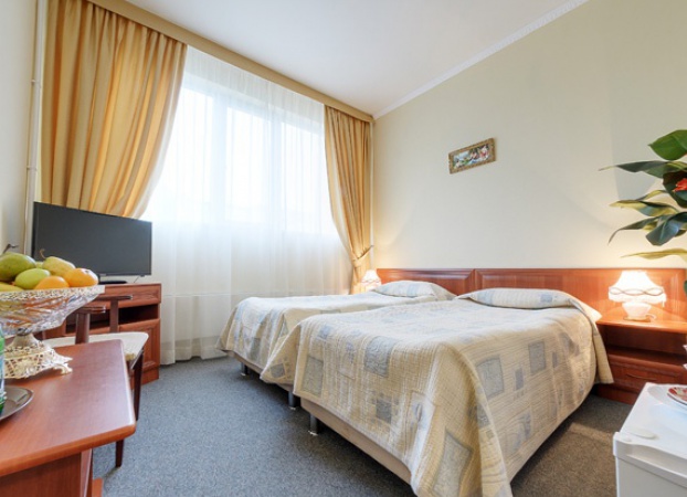 - 2-местный 1-комнатный Стандарт. Площадь 21 кв. м. В номере: две односпальные или одна двуспальная кровать, мини-холодильник, электрический чайник, чайный набор, телевизор, телефон, санузел с ванной, фен, халат, тапочки.