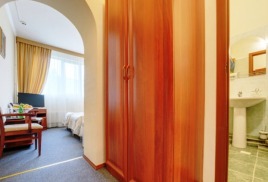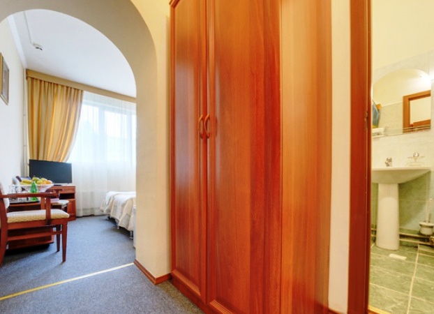 - 1-местный 1-комнатный СИНГЛ/ SGL. Площадь 15 кв. м. В номере: одна односпальная кровать, мини-холодильник, электрический чайник, чайный набор, телевизор, телефон, санузел с ванной, фен, халат, тапочки. Доп место кровать.