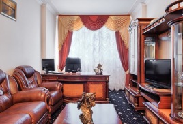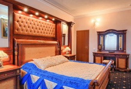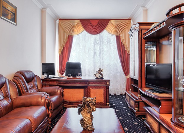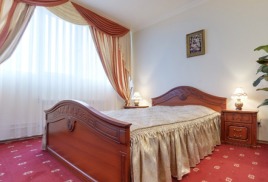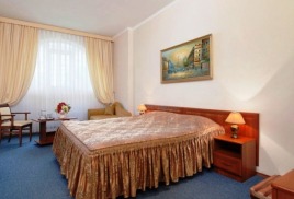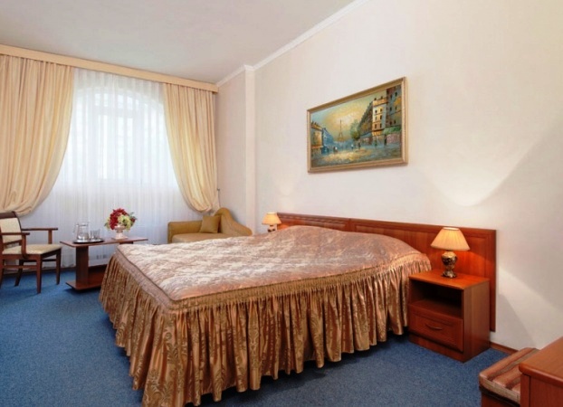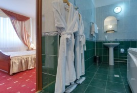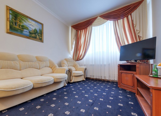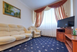 - 2-местный 2-комнатный Люкс. Площадь 39 кв. м В номере: гостиная с мягкой мебелью, спальня с двуспальной кроватью, 2 телевизора, кондиционер, телефон, холодильник, электрический чайник, гладильная доска, утюг, санузел с джакузи, фен, халат, тапочки.