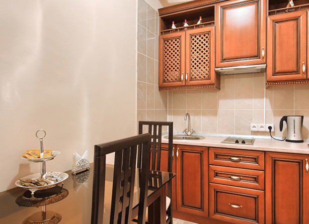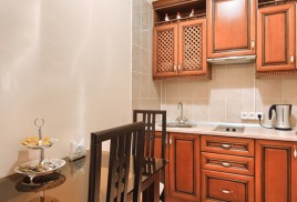 - 2-местный 3-комнатный Семейный «Люкс»/ Family Suite. Площадь 54 кв. м В номере: гостиная с мягкой мебелью и камином, кабинет, кухонный уголок, кухонная техника, мини-бар, чайный набор, электрический чайник, спальня с двуспальной кроватью, компьютер, 2 телевизора, телефон, кондиционер, кабельное телевидение, Wi-Fi, санузел с джакузи, фен, халат, тапочки.