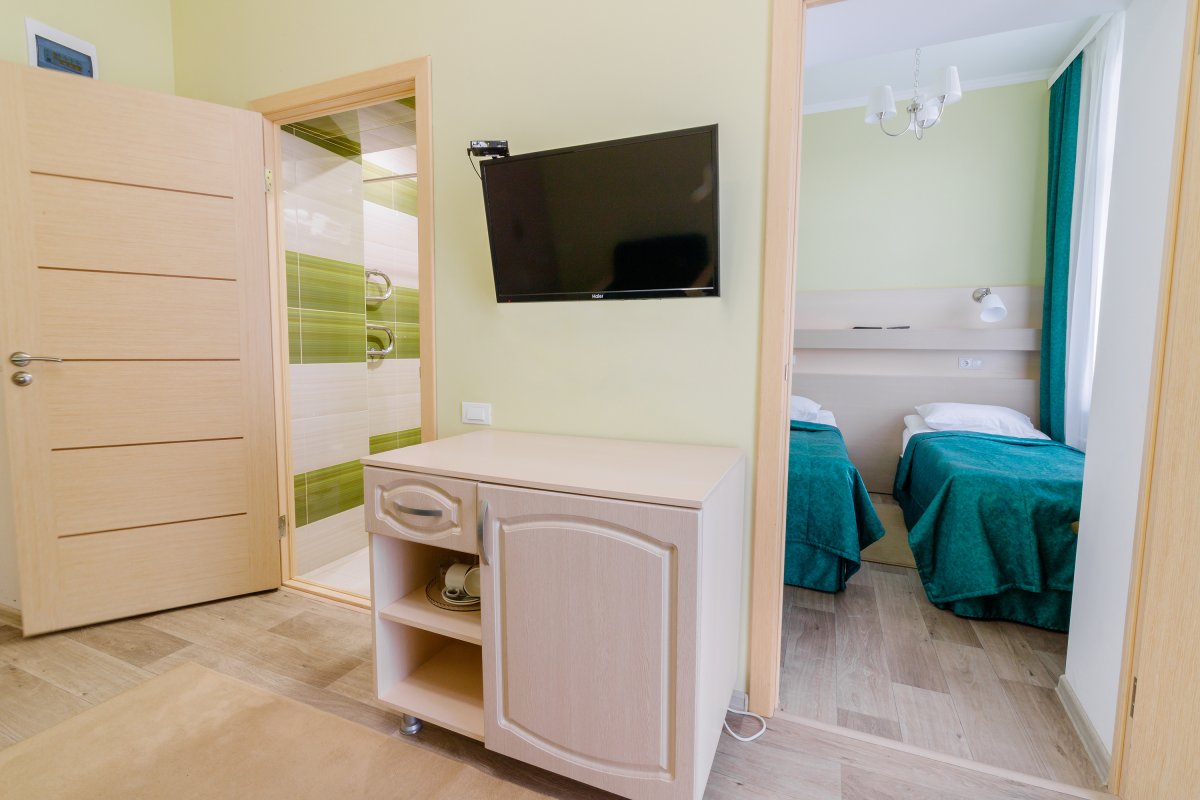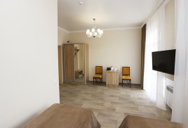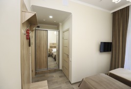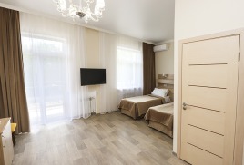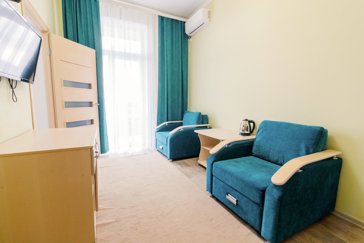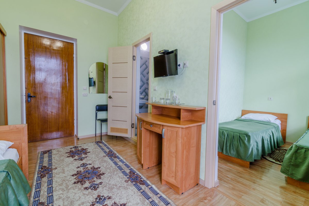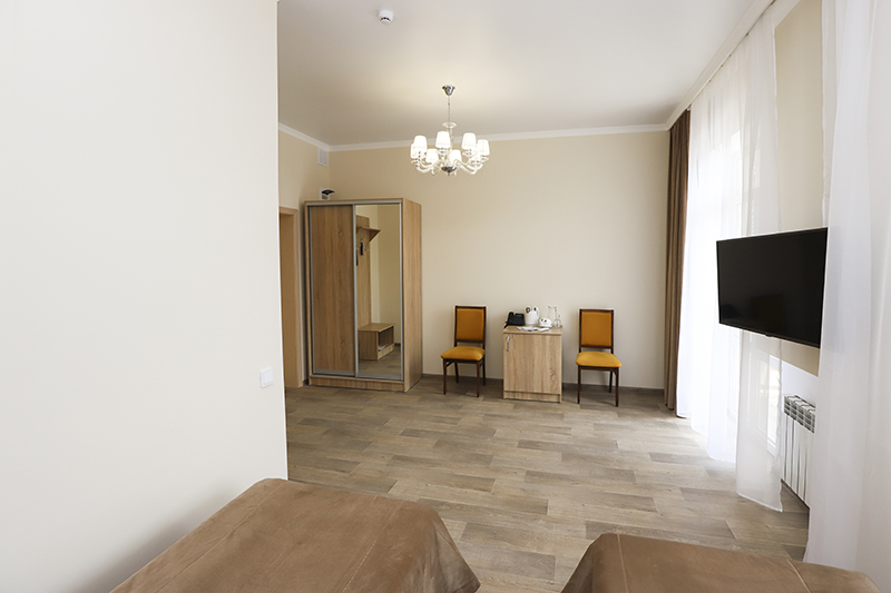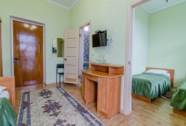 - 2-местный 2-комнатный семейный улучшенный. Площадь 19 м2. В номере: гостиная, спальня с двумя односпальныим кроватями, телевизор, холодильник, чайник, кондиционер, душ, туалет, фен, балкон не во всех номерах. Дополнительное место - 2 человека.