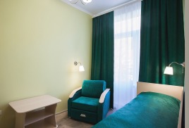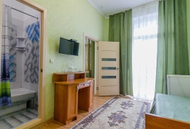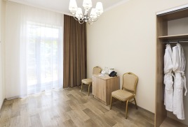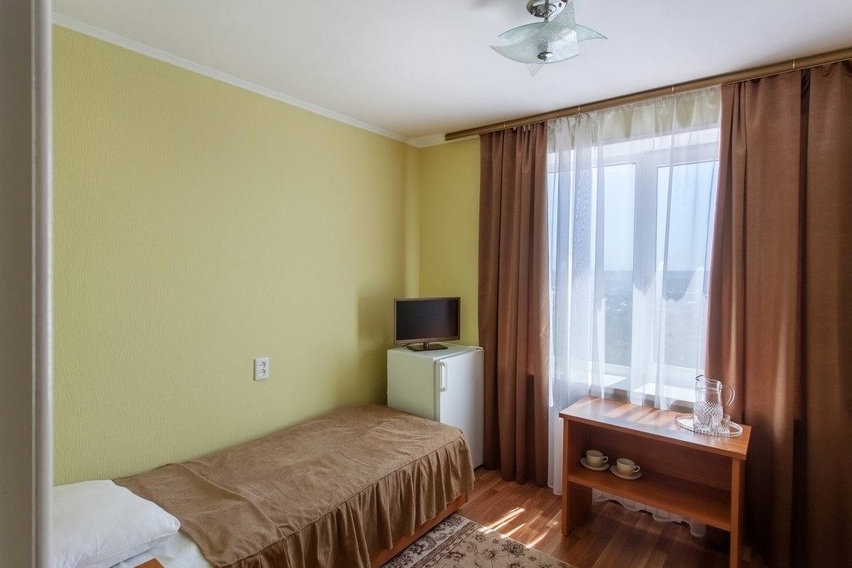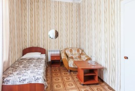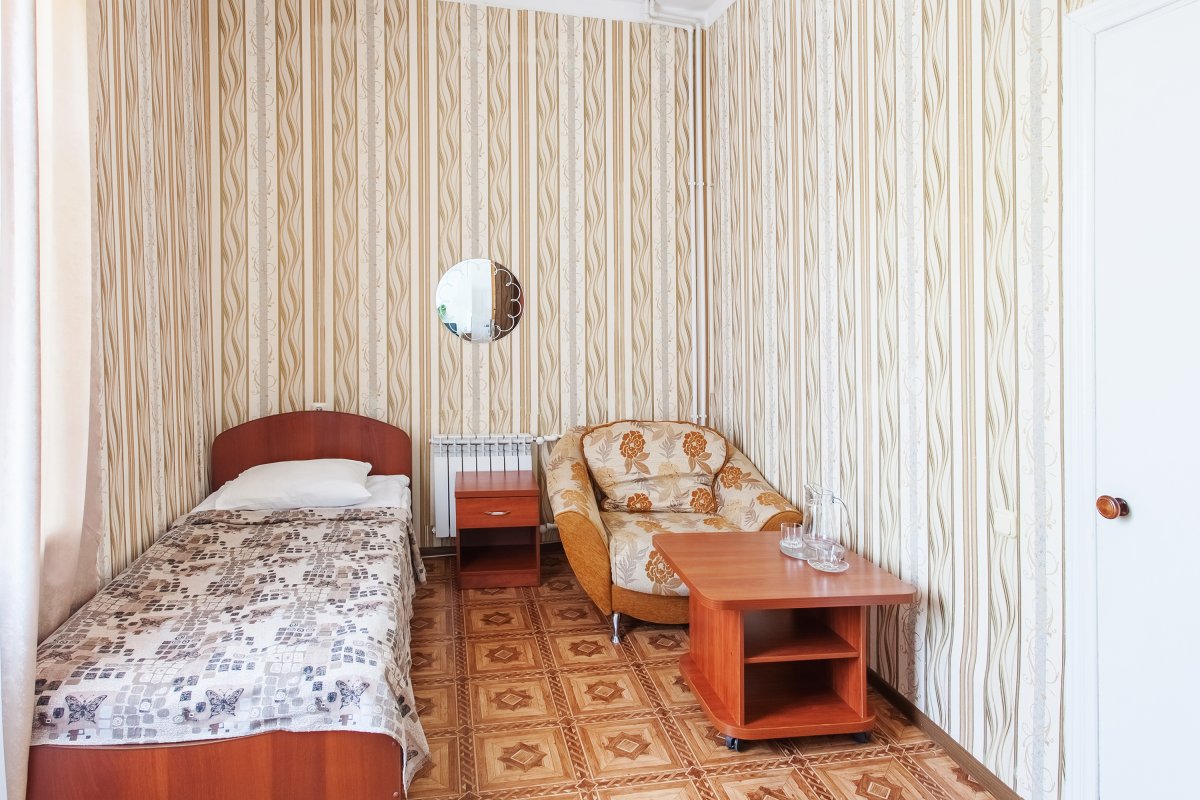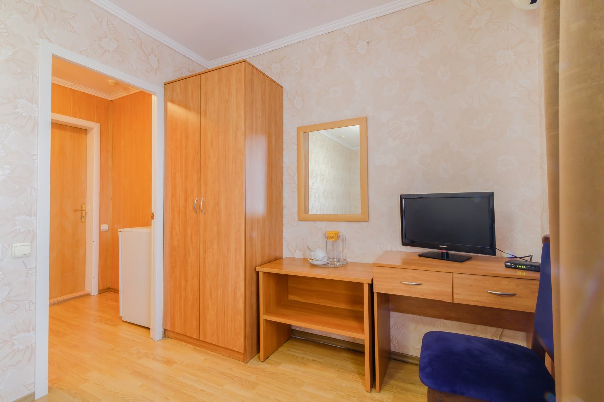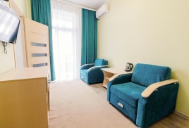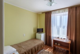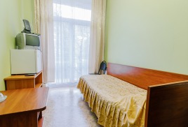 - 1-местный улучшенный. Площадь 10 м2. В номере: односпальная кровать, кресло, телевизор, холодильник, чайник, душ, туалет, фен, кондиционер, балкон.