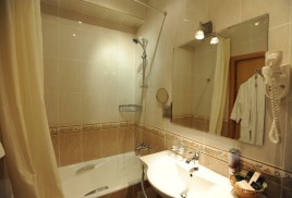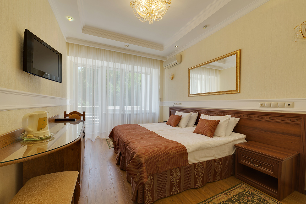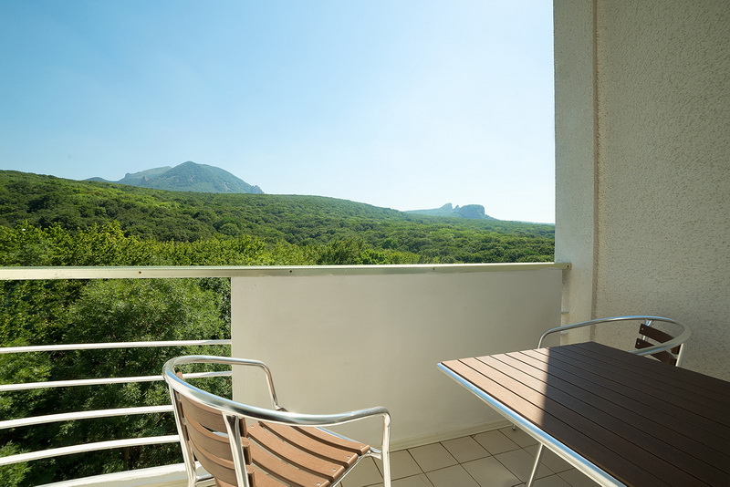 - 1-местный 1-комнатный номер Сингл. Площадь номера 20,7 м2. В номер: двуспальная кровать, чайник электрический, набор посуды, холодильник, телевизор, кондиционер, сейф, ванная комната с ванной, фен, индивидуальный набор гигиенических средств, халат, балкон с летней парковой мебелью.