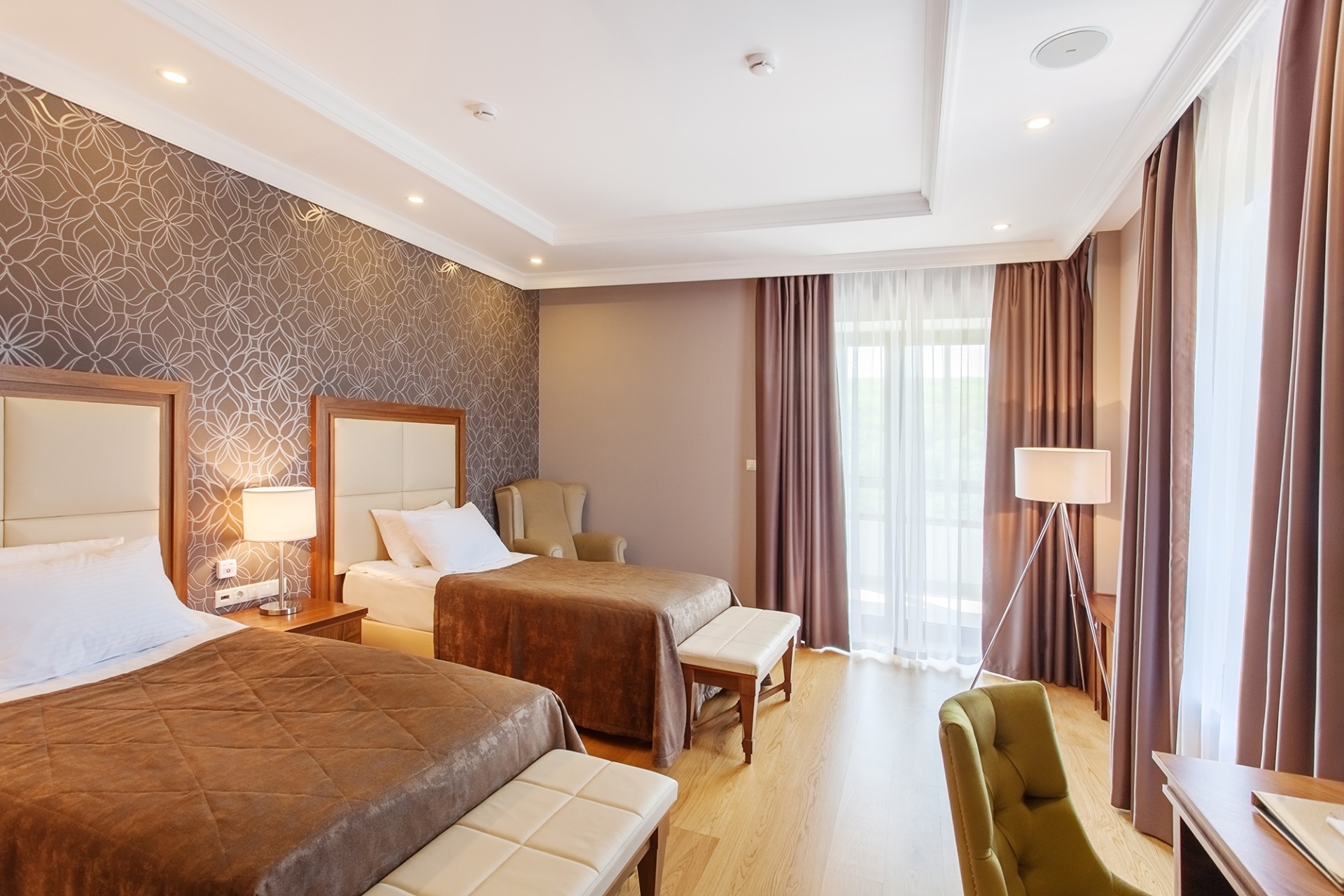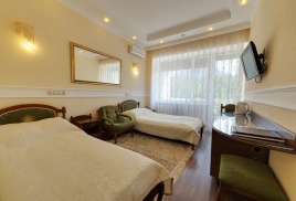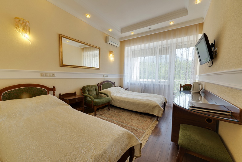- 2-местный 1-комнатный номер Твин. Площадь номера 20,7 м2. В номере: две раздельные кровати или одна двуспальная, чайник электрический, набор посуды, холодильник, телевизор, кондиционер, ванная комната с душевой кабиной), индивидуальный набор гигиенических средств, фен, халат, балкон с летней парковой мебелью.