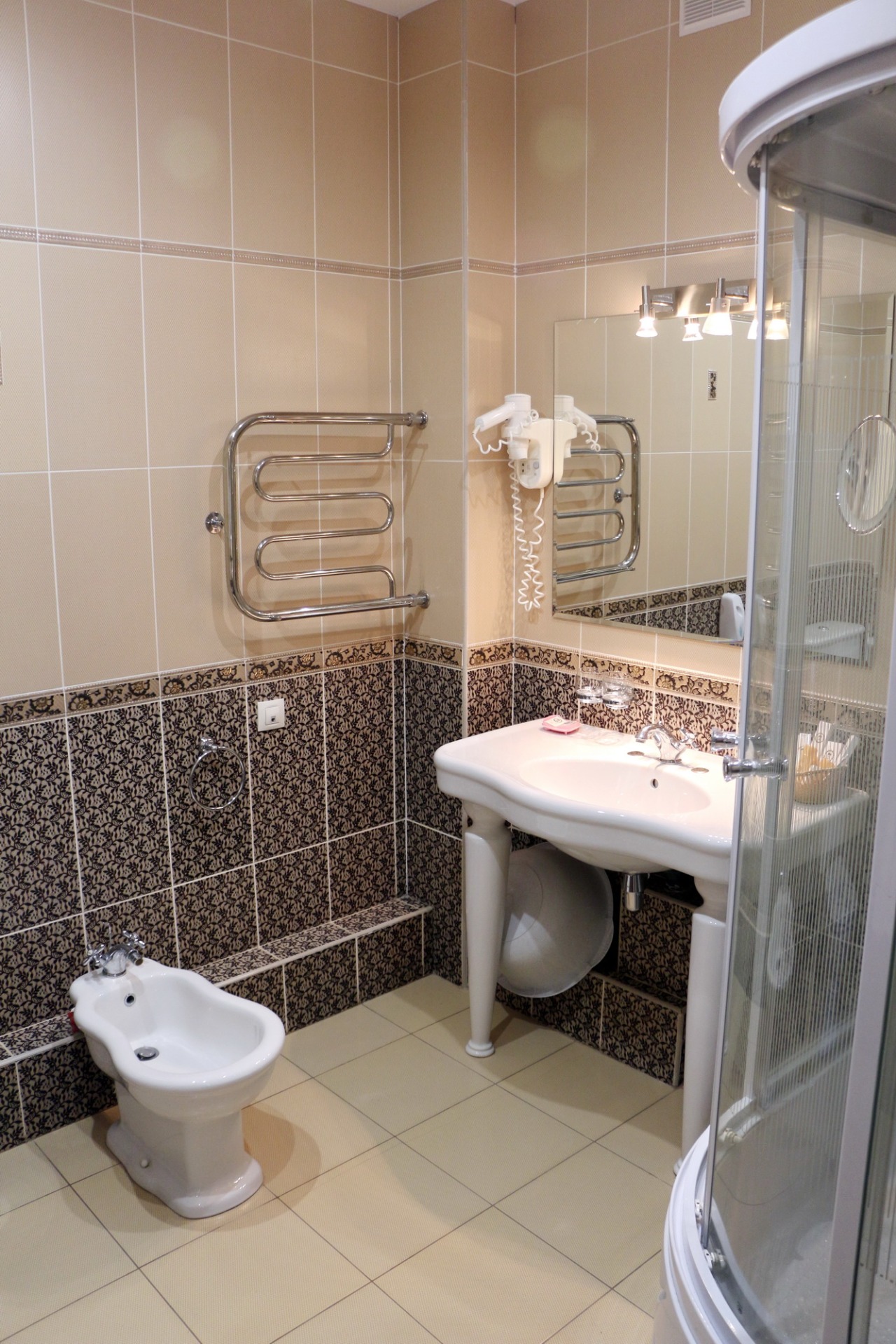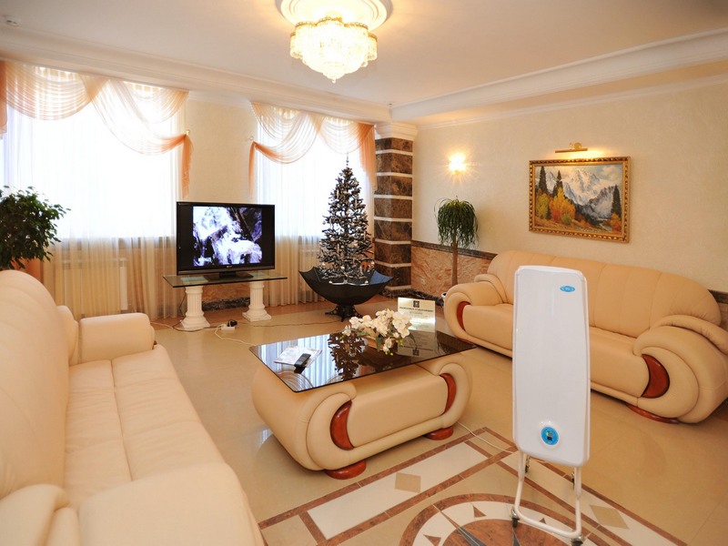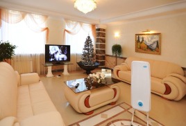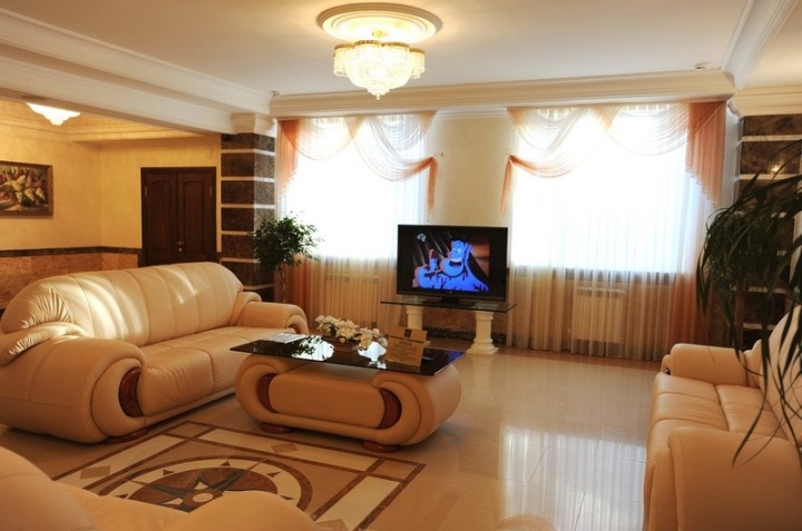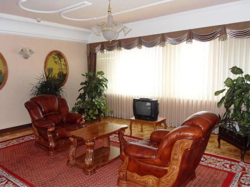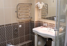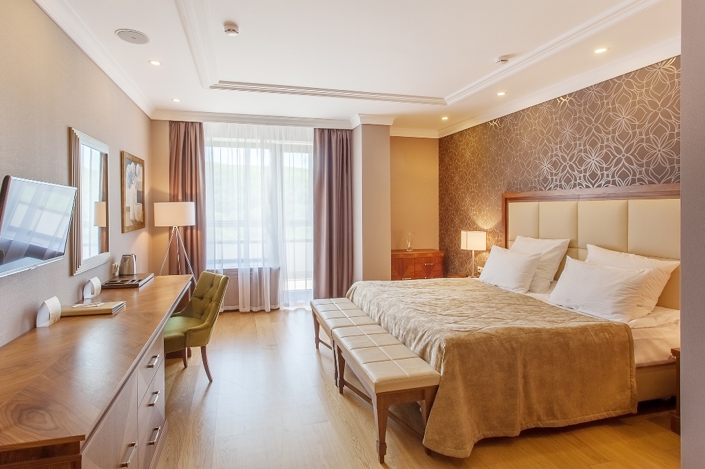 - 2-местный 2-комнатный Люкс. Площадь номера 65,2 м2. В номере: гостиная с мягкой мебелью, спальня с двуспальной кроватью, два санузла с ванной, фен, индивидуальный набор гигиенических средств, халат, чайник электрический, холодильник, сплит-система, телевизор, доска гладильная, утюг электрический, сейф, балкон с летней парковой мебелью.