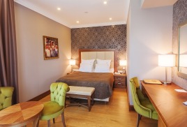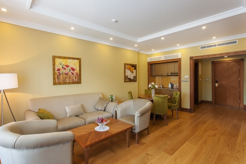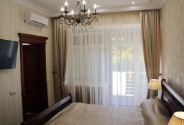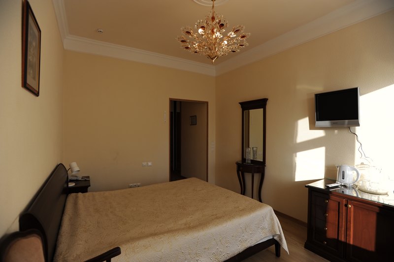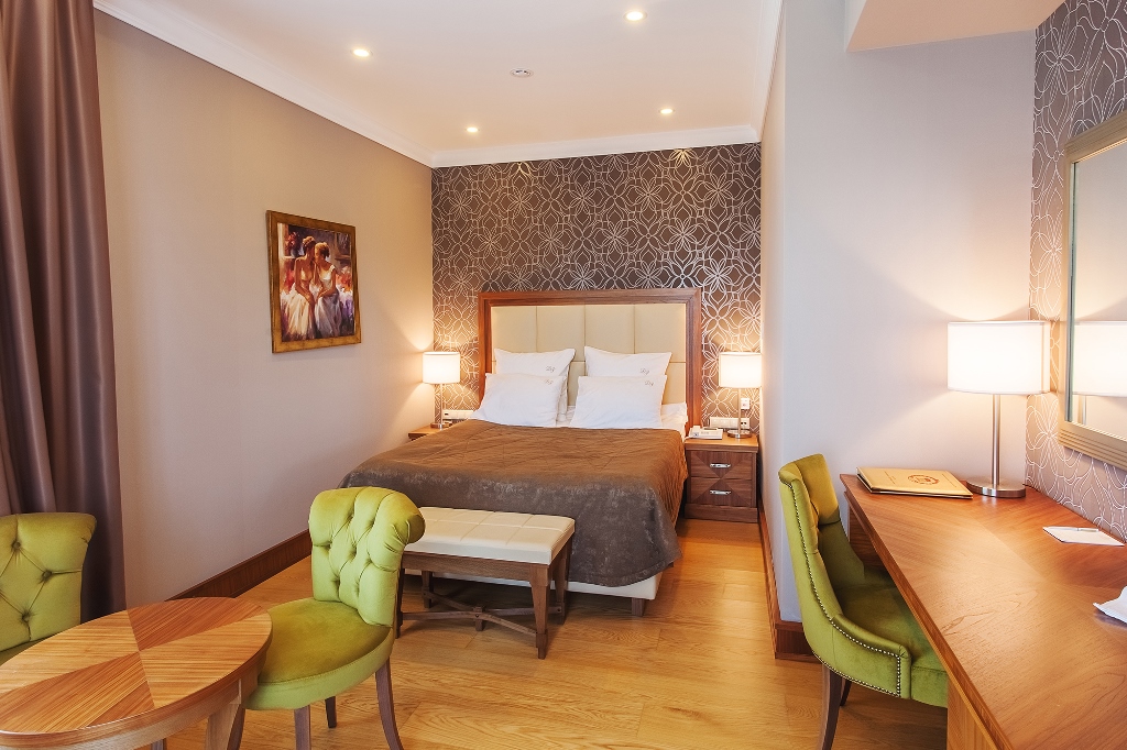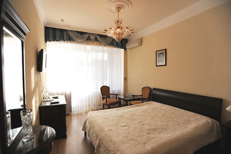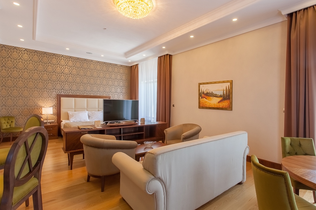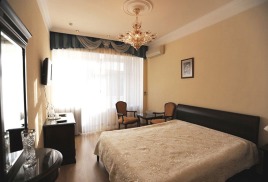 - 2-местный 2-комнатный Люкс стандарт. Площадь номера 55 м2. в номере: двуспальная кровать, чайник электрический, набор посуды, кондиционер, холодильник, телевизор, ванная комната с туалетом и душевой кабиной, гостевой туалет, фен, халат. Вид на город, номер без балкона.