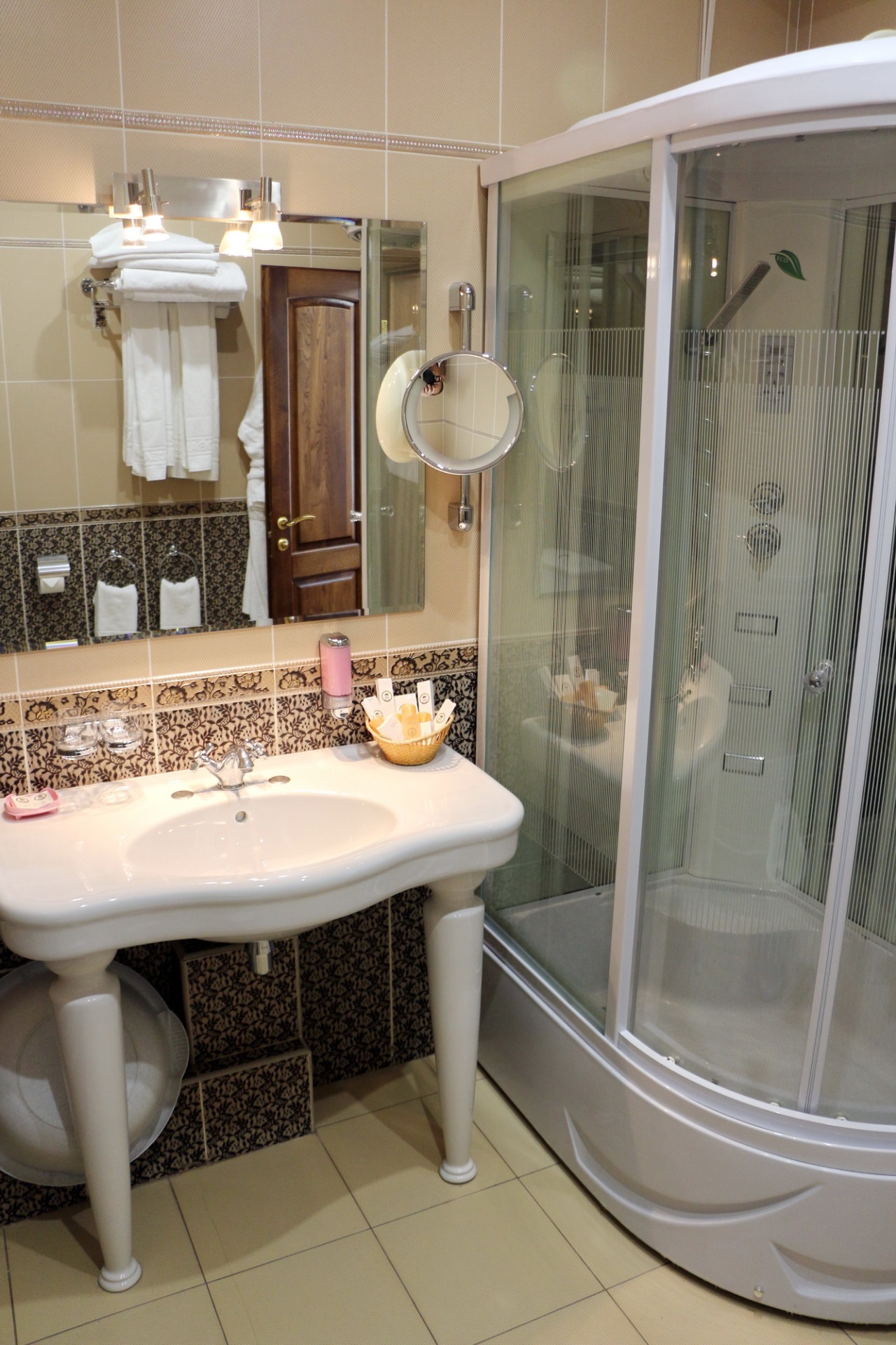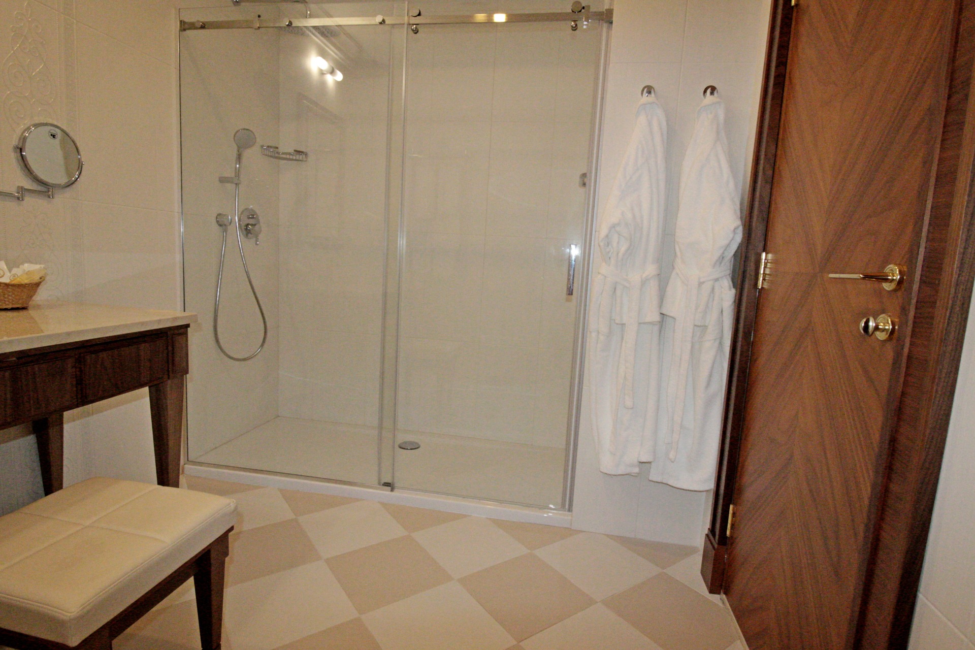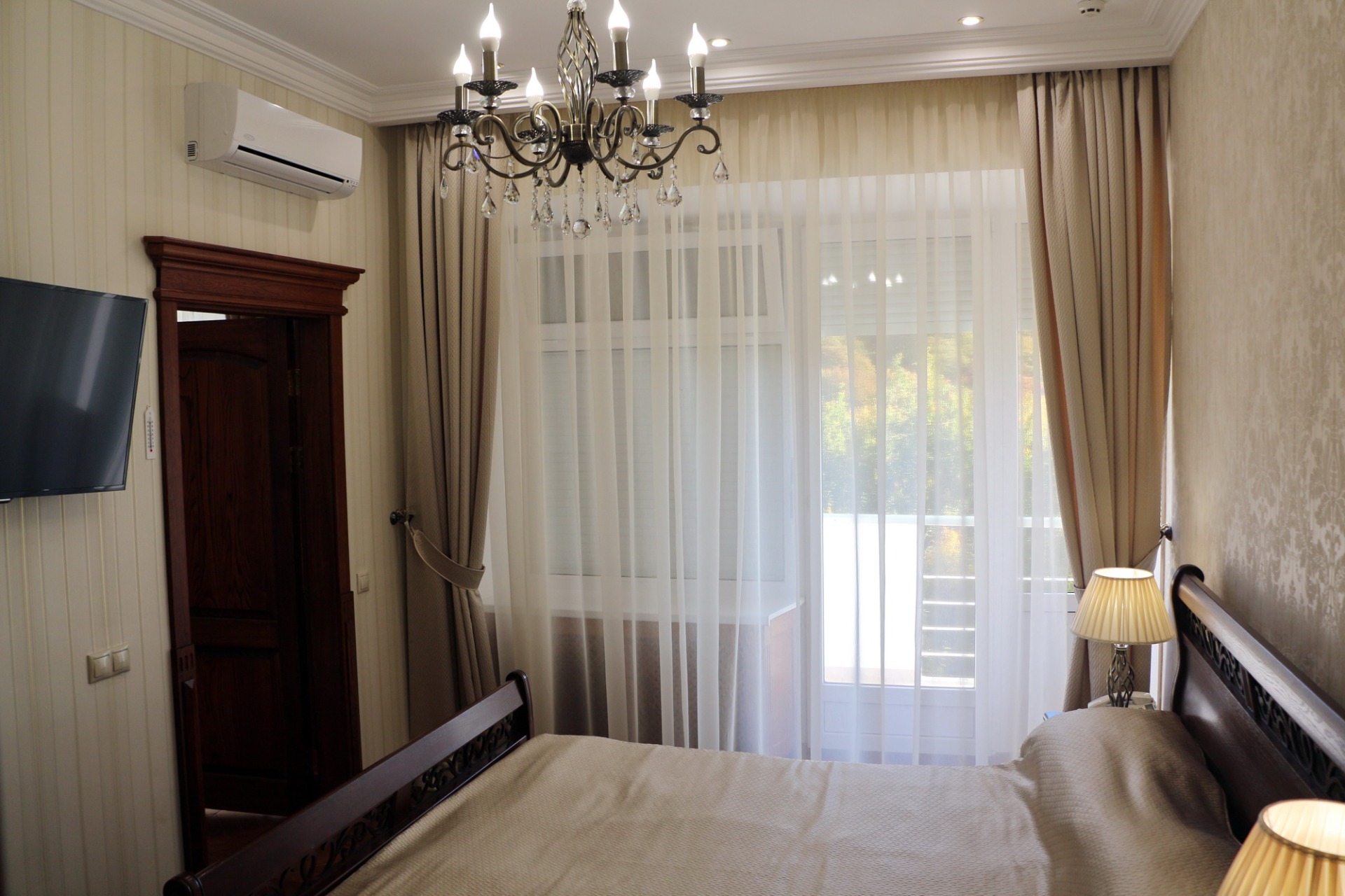 - 2-местный 2-комнатный Люкс стандарт. Площадь номера 55 м2. в номере: двуспальная кровать, чайник электрический, набор посуды, кондиционер, холодильник, телевизор, ванная комната с туалетом и душевой кабиной, гостевой туалет, фен, халат. Вид на город, номер без балкона.