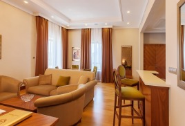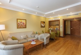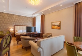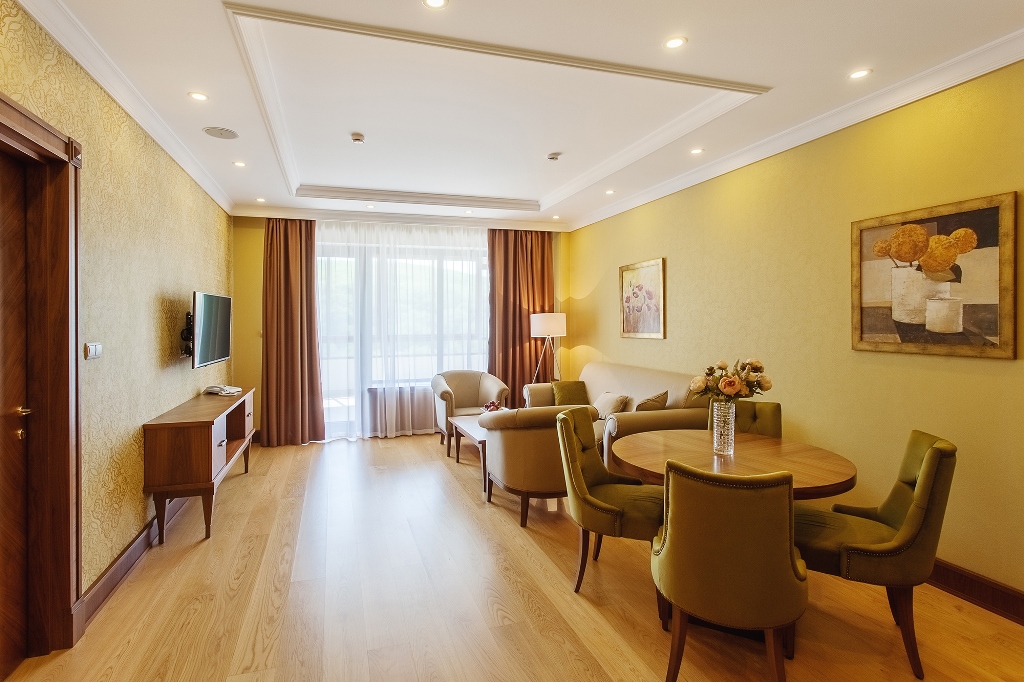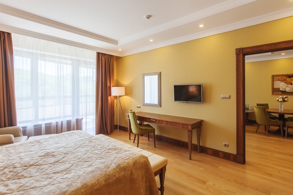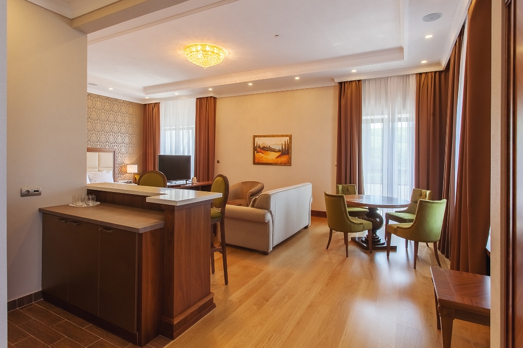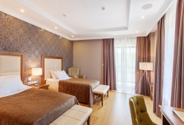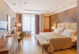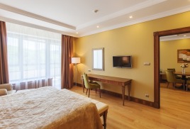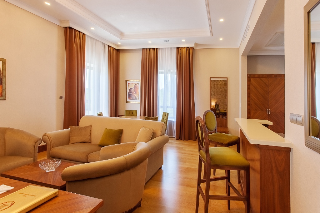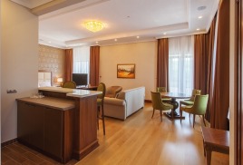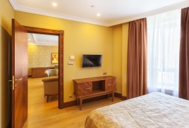 - 2-местный 3-комнатный Сюит. Площадь номера 81 м2. В номере: гостиная с мягкой мебелью, чайник электрический, холодильник, сплит-система, спальня с двуспальной кроватью, телевизор, доска гладильная, утюг электрический, сейф, кабинет, два санузла с ванной, фен, индивидуальный набор гигиенических средств, халат, балкон с летней парковой мебелью.