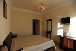 - 1-местный 1-комнатный Стандарт. Площадь номера 28,6 м2. В номере: двуспальная кровать, чайник электрический, набор посуды, холодильник, телевизор, кондиционер, ванная комната, индивидуальный набор гигиенических средств, фен, халат. Вид на город, номер без балкона.
