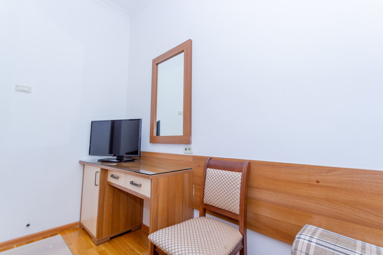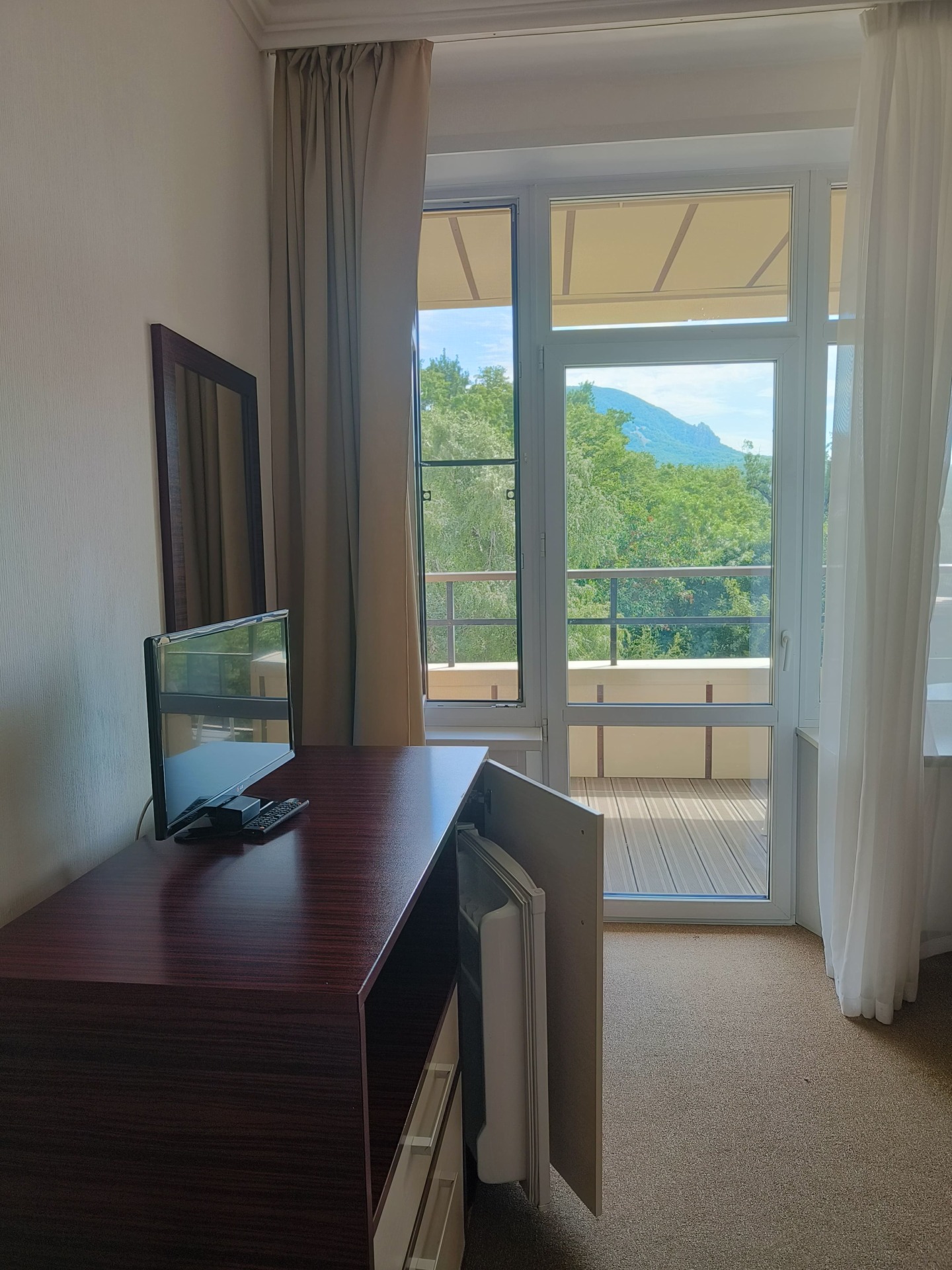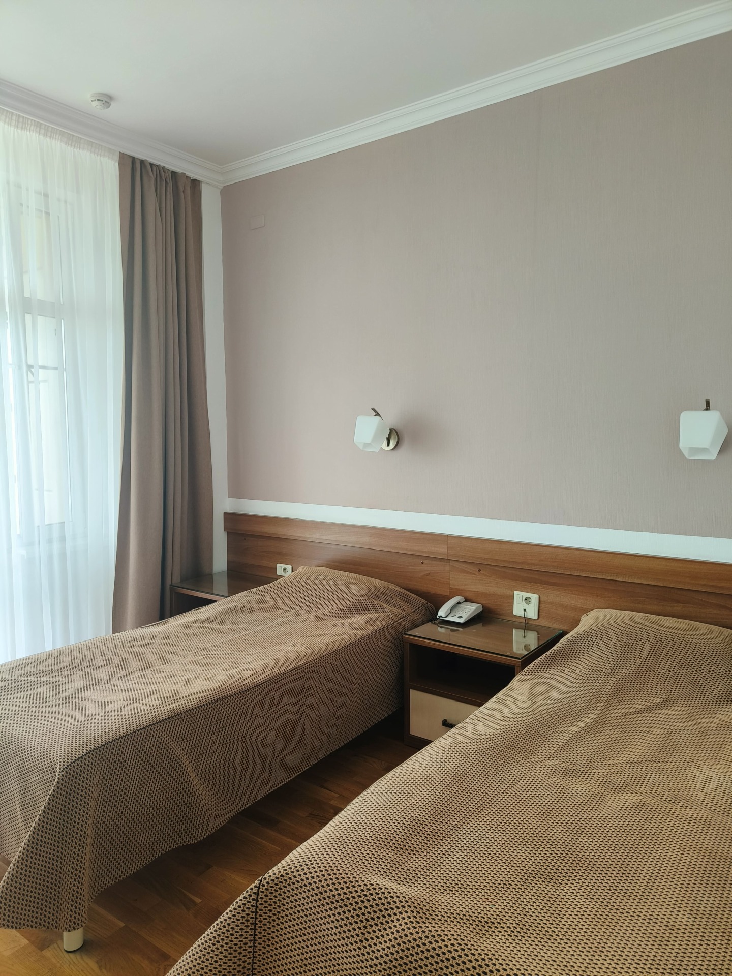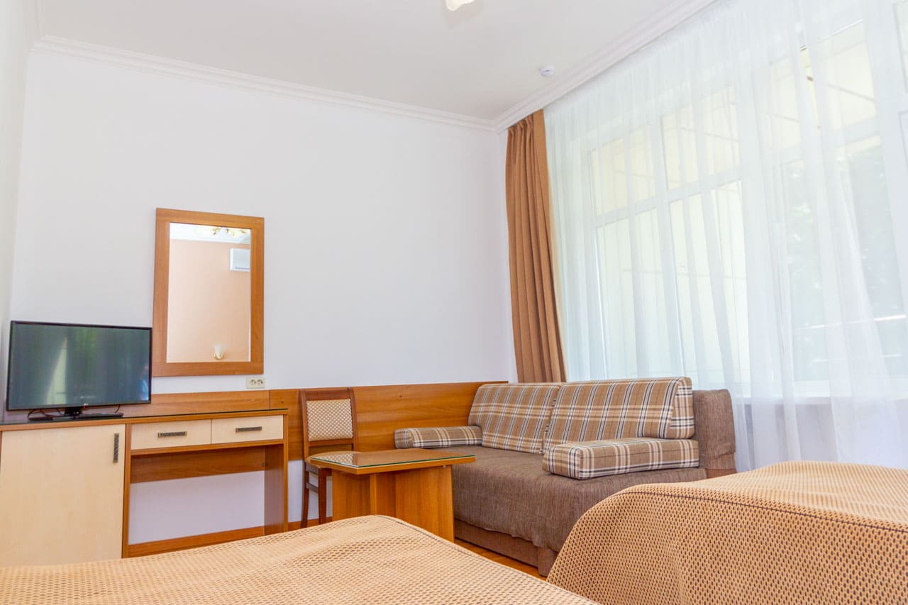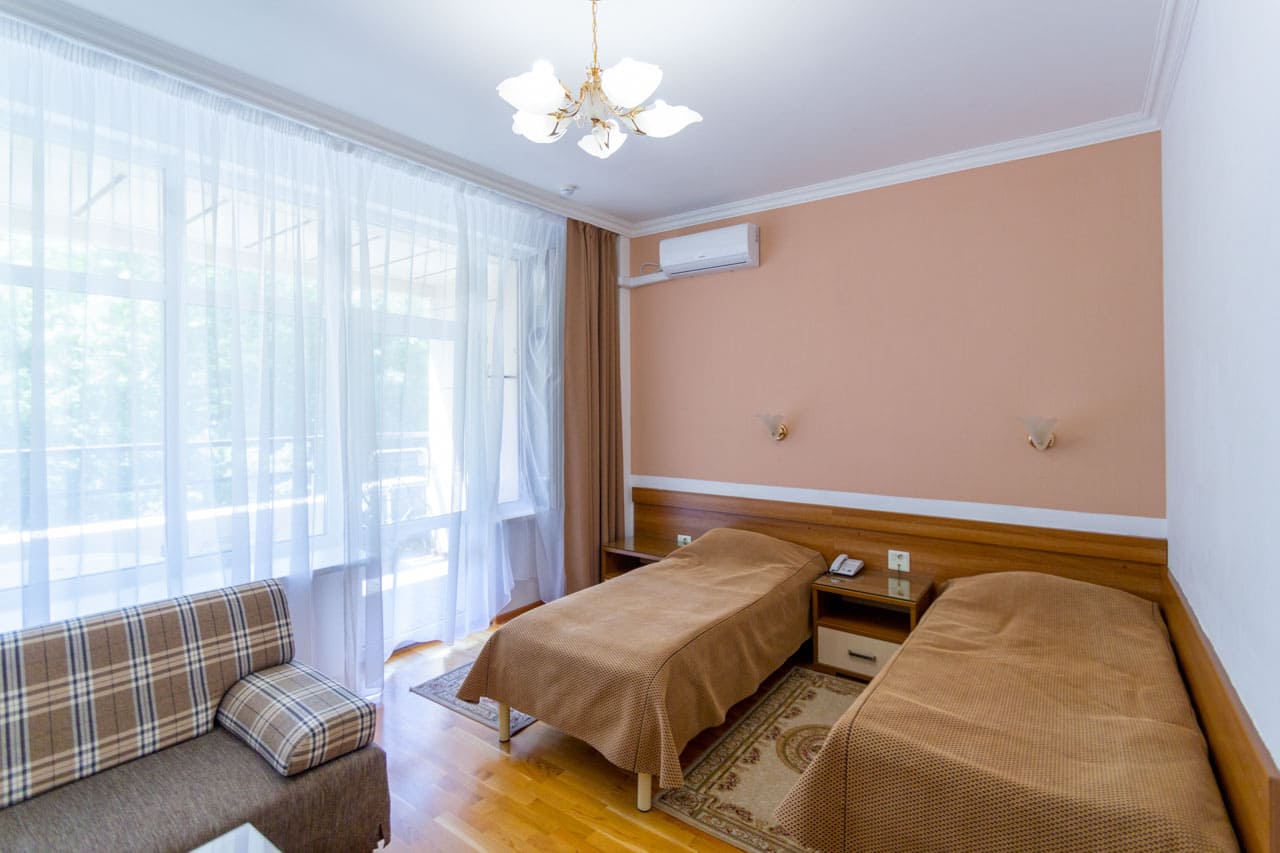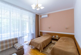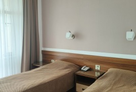 - 2-местный 1-комнатный номер. Площадь номера: 28 кв.м. В номере: балкон, две односпальные кровати, мягкая мебель, телевизор, холодильник, электрический чайник, чайный набор. Санузел с душевой кабиной, фен.
